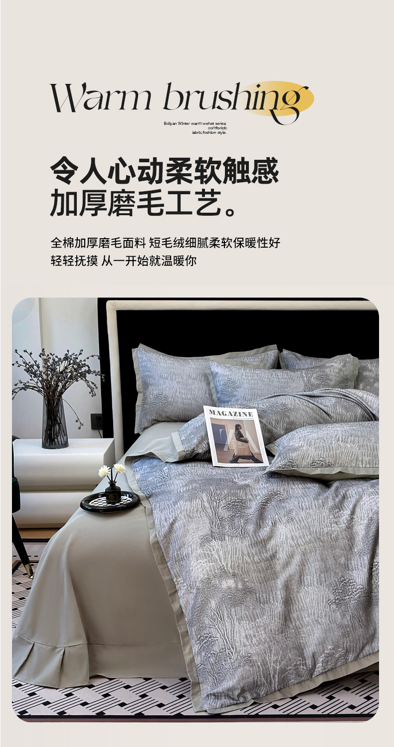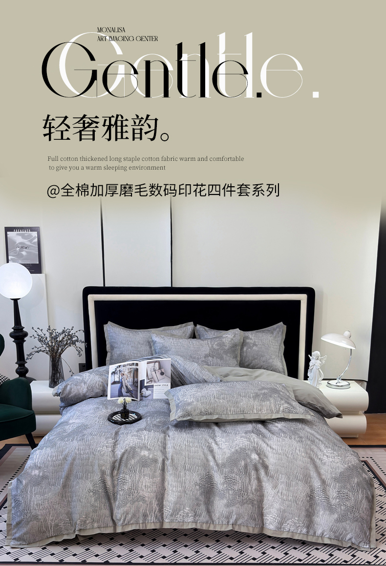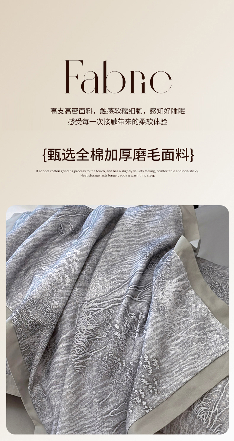 当前位置: 91家纺网 > 商品网购 > 床品套件 > 四件套 > 全棉普通四件套 > 未来家居 2025新款秋冬全棉加厚磨毛纯色印花缺角工艺系列高端礼盒包装四件套 龙葵-灰