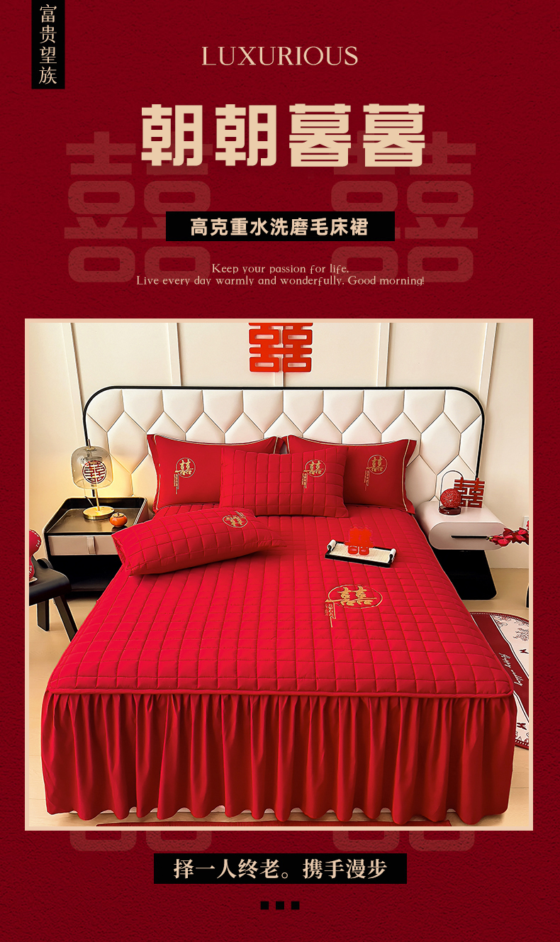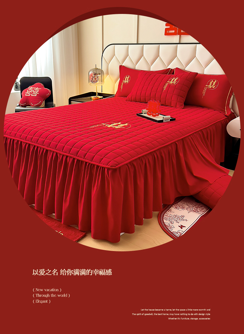 • 91家纺网 家纺一手货源 找家纺 七仙女家纺 2025新款轻奢婚庆高克重水洗磨毛夹棉床裙单床裙床裙单件床裙三件套 吾家有喜