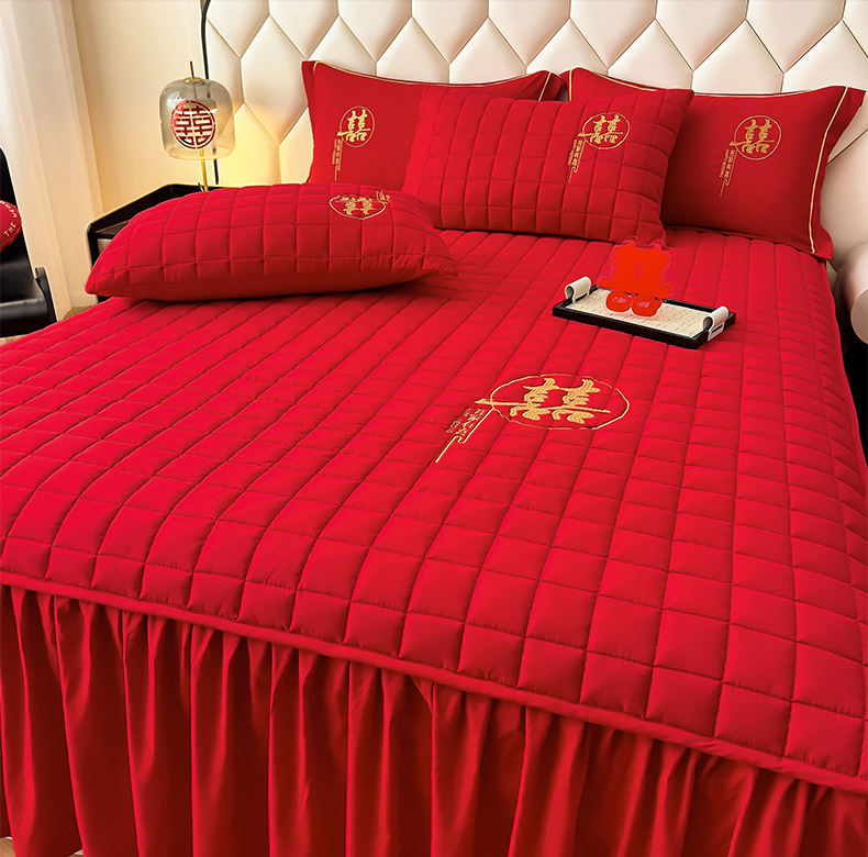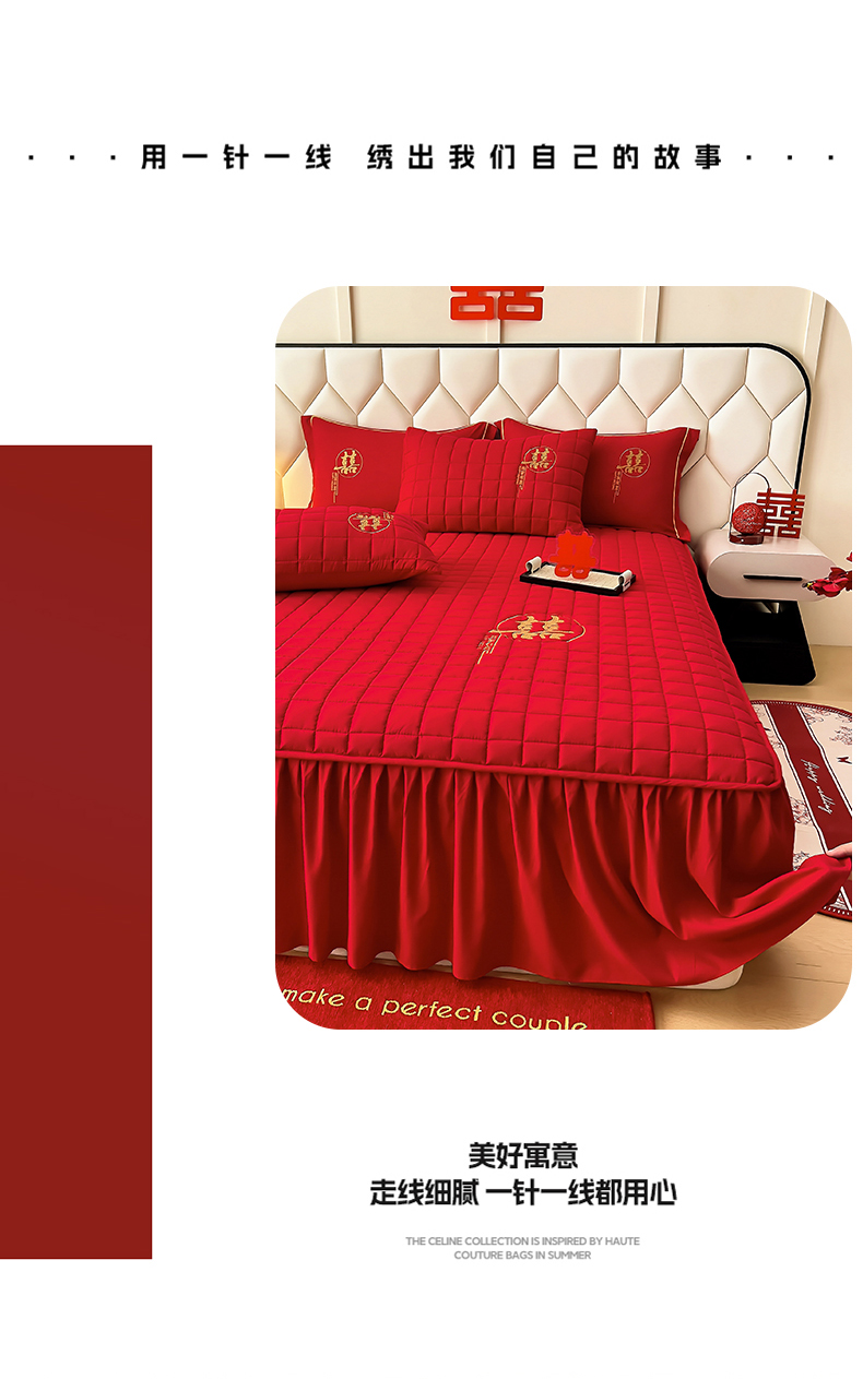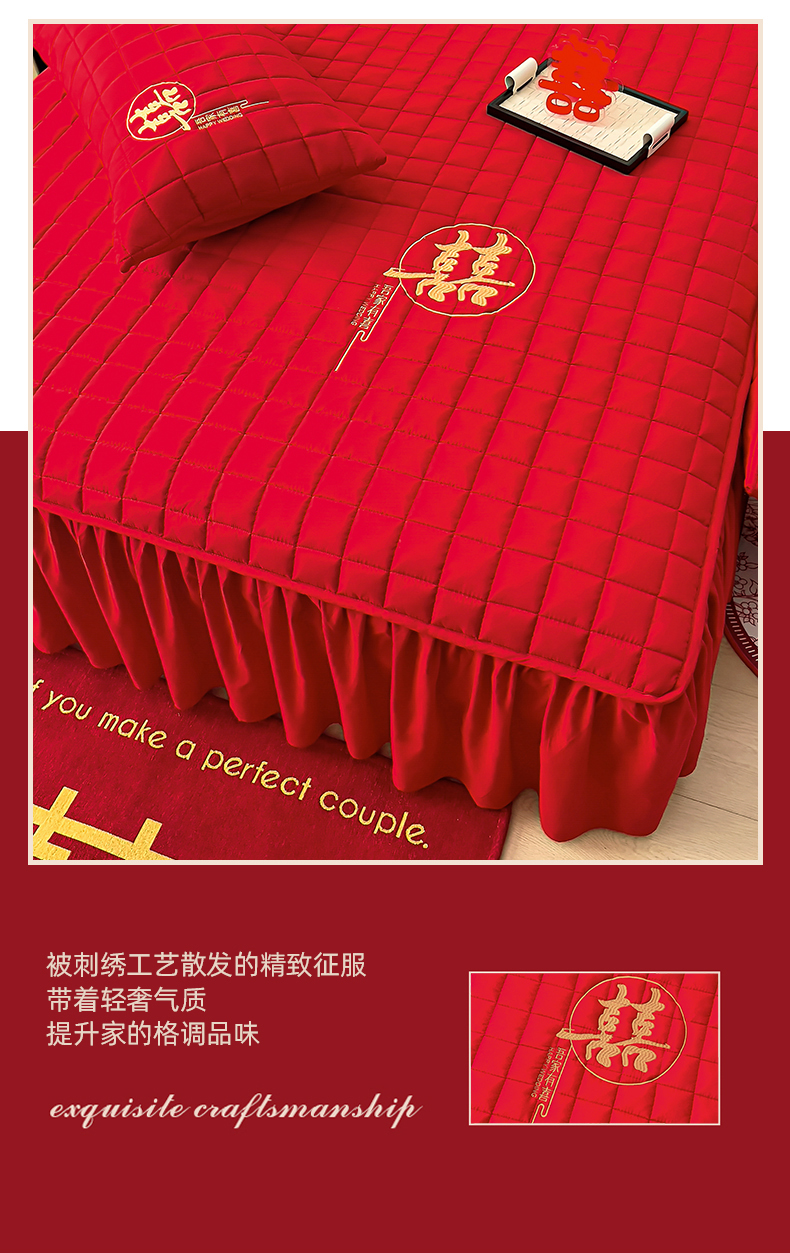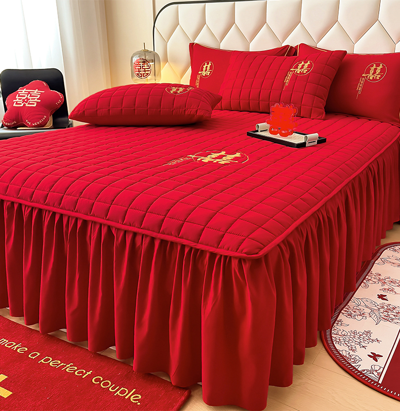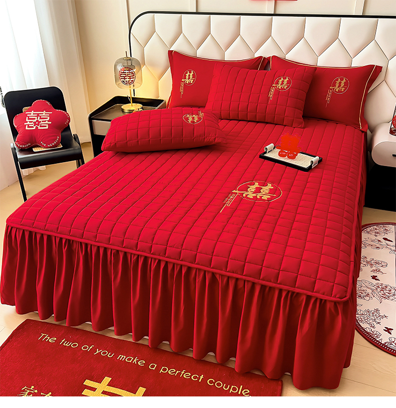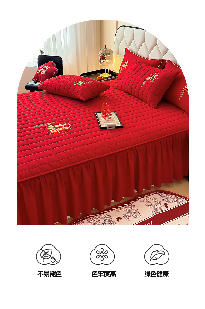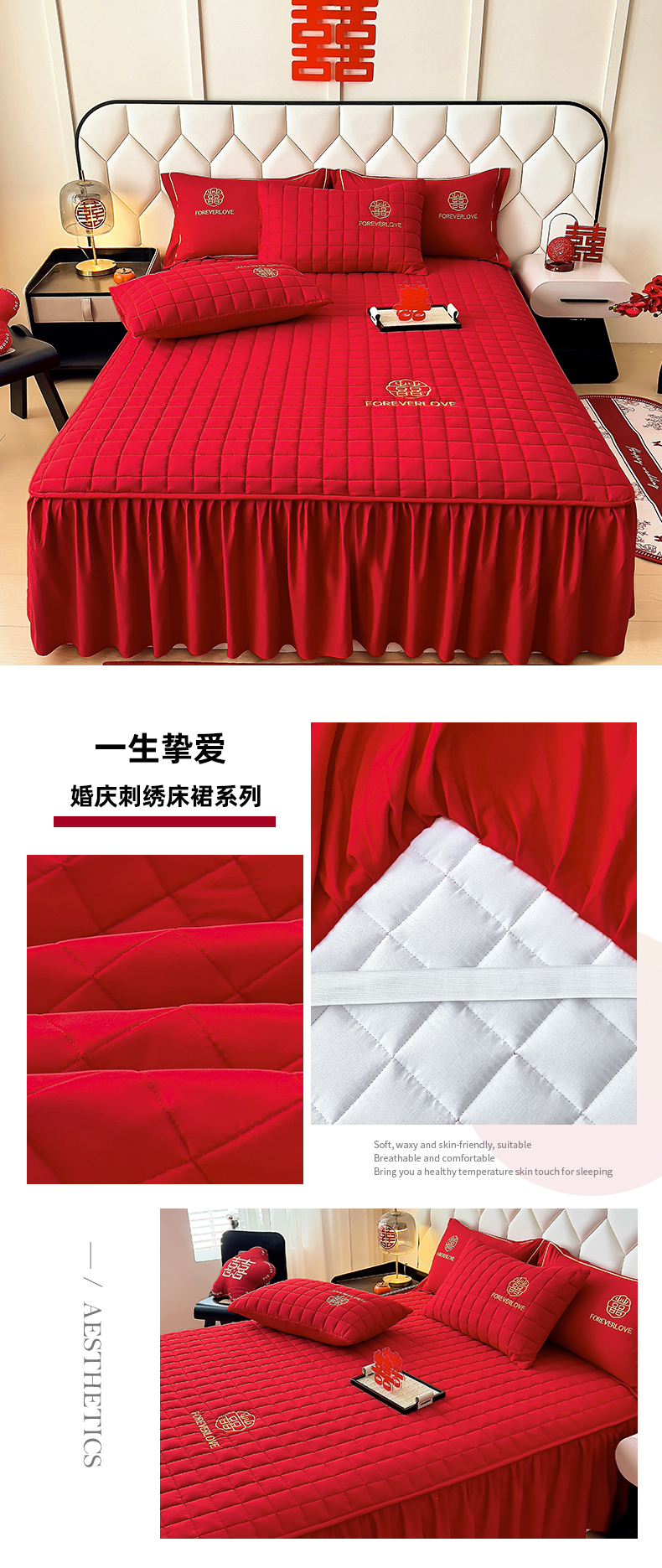 七仙女家纺 2025新款轻奢婚庆高克重水洗磨毛夹棉床裙单床裙床裙单件床裙三件套 吾家有喜