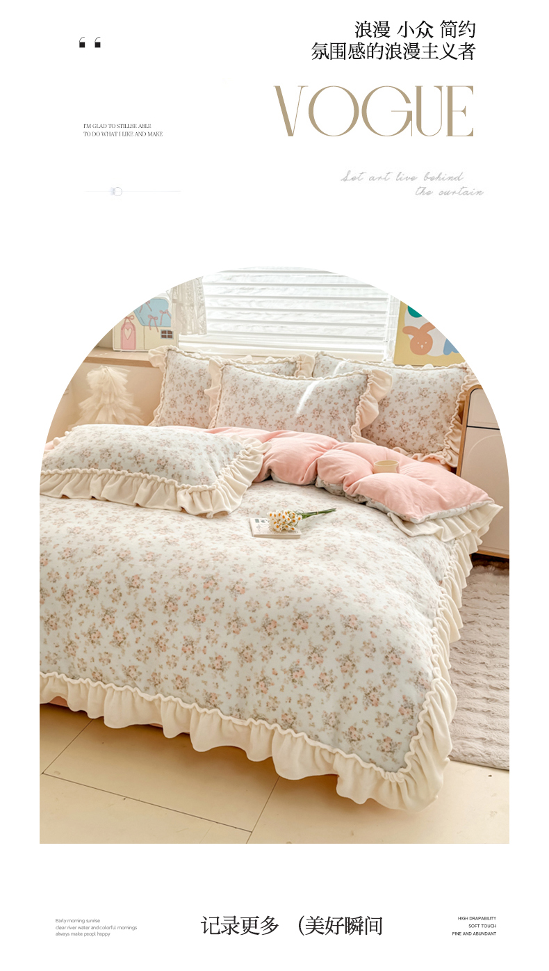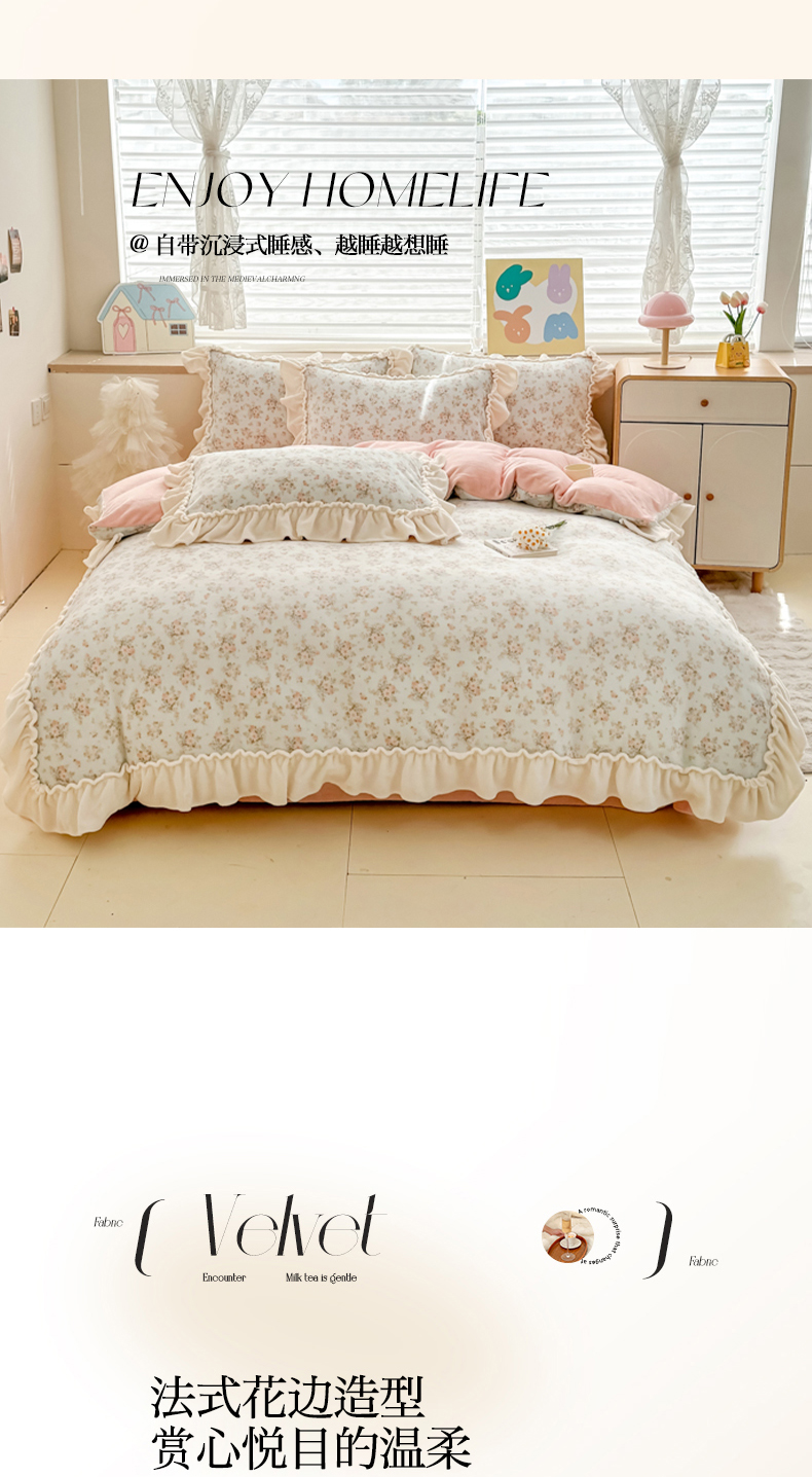 (总)橘子家 2025轻奢法式花边公主风婴儿绒牛奶绒高克重四件套,爱恋,安妮,茶野,风铃草,花间梦,花间梦,花满园,花香,幻蝶,可可草莓,蔓可,蜜桔,浅夕,乔依,甜梦,甜心,晚风,小熊抱抱,云漫,枝蔓,心动