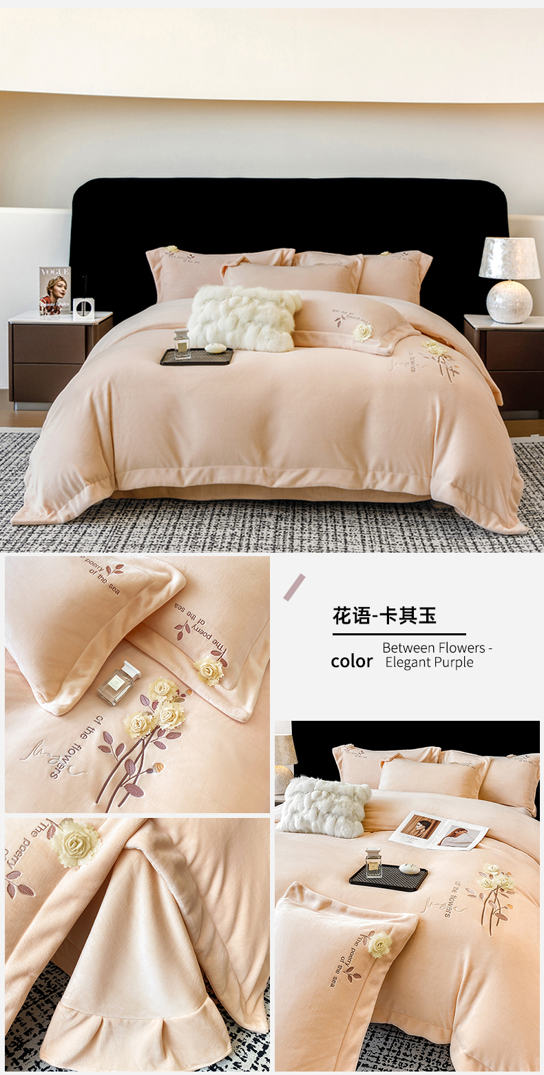 (总)席之家 2025新款刺绣牛奶绒四件套,花语-卡其玉,花语-奶咖,花语-青柠绿,花语-少女粉