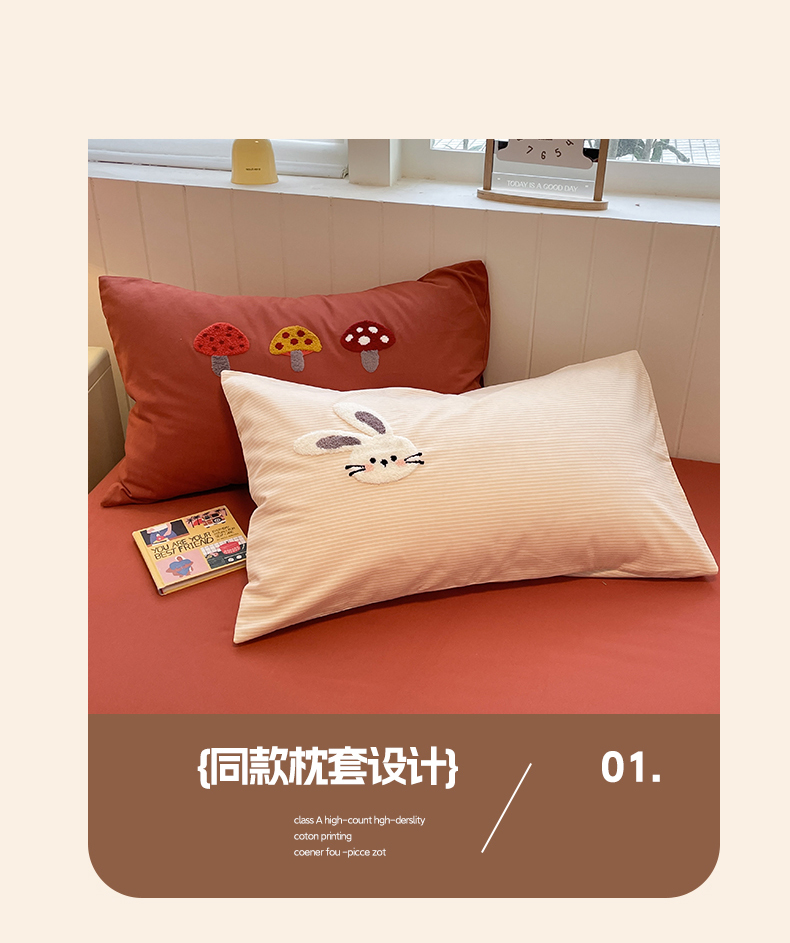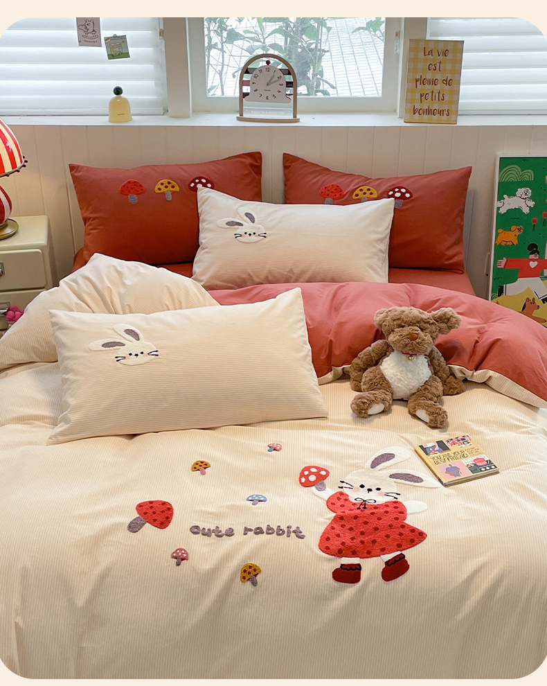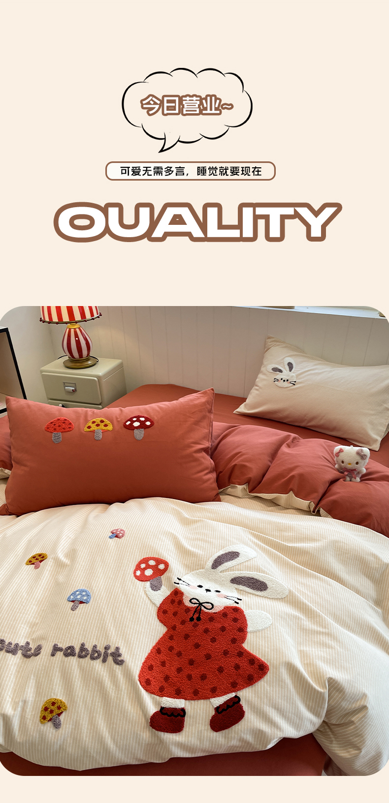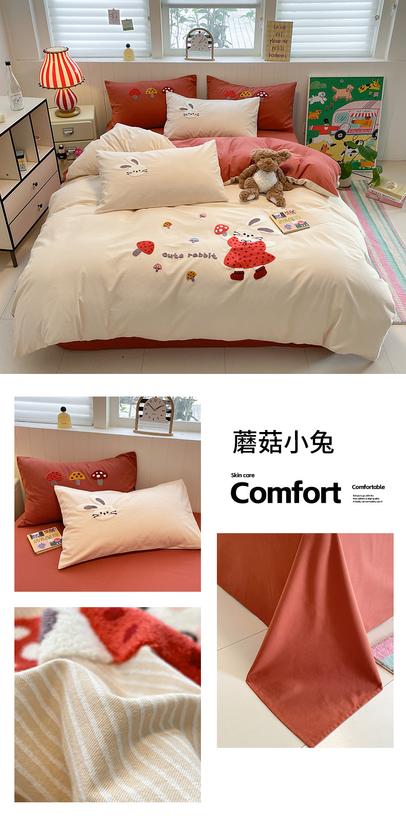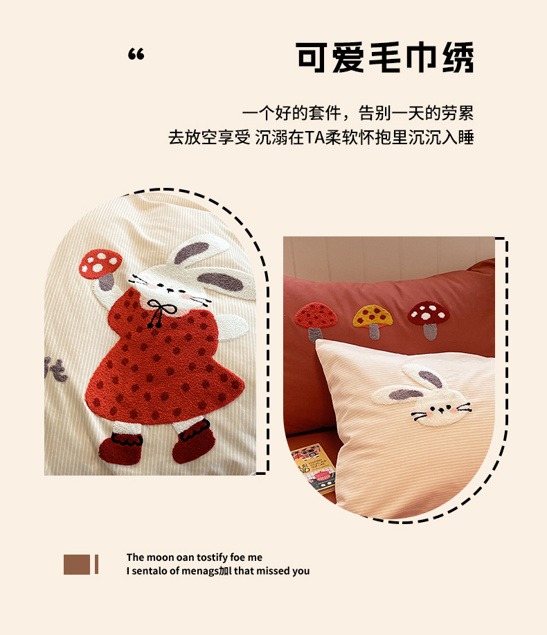 当前位置: 91家纺网 > 商品网购 > 床品套件 > 四件套 > 普通磨毛四件套 > 蓝邻家纺 2025新款全棉磨毛卡通刺绣款四件套--毛巾绣系列 蘑菇小兔