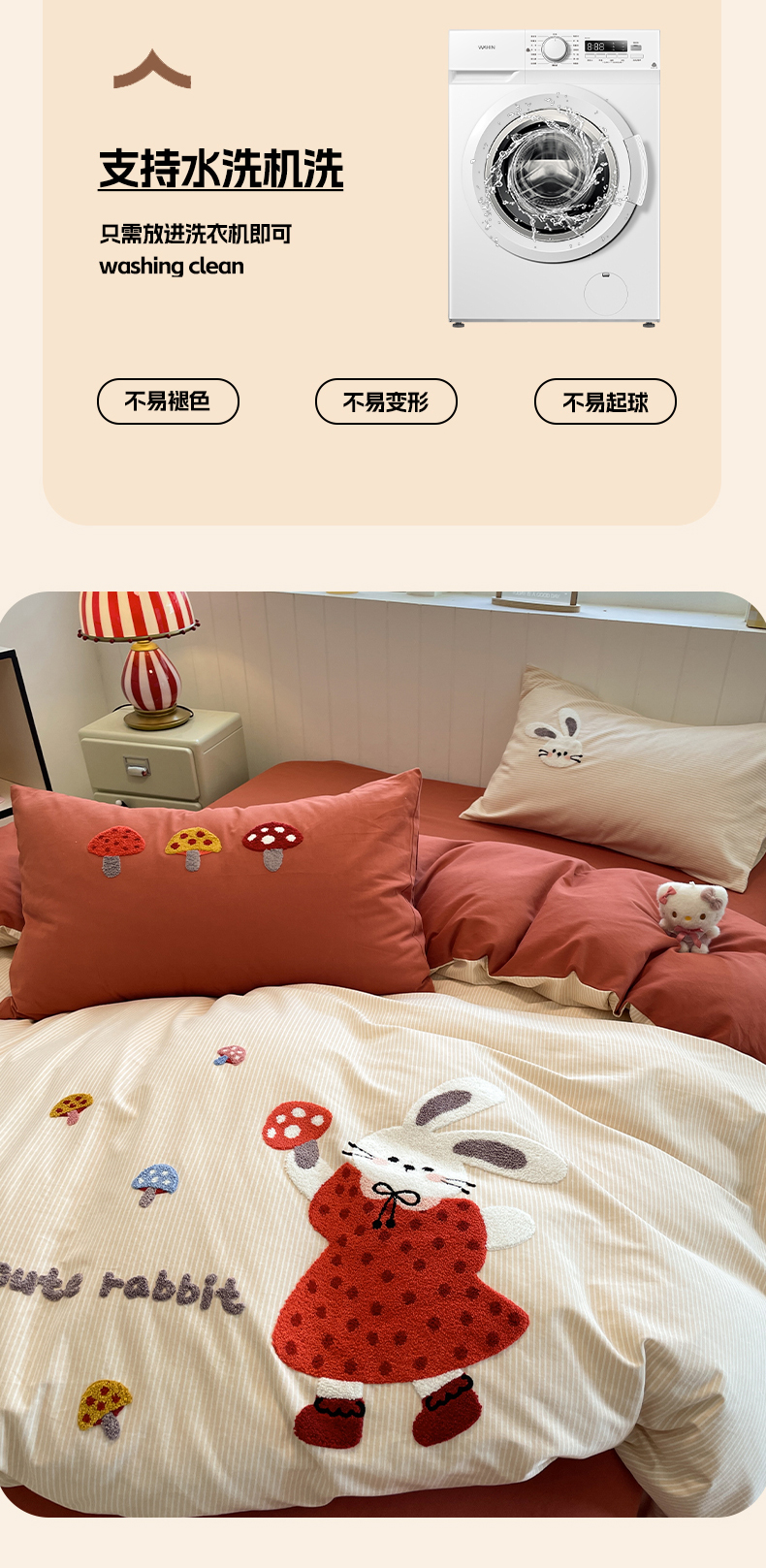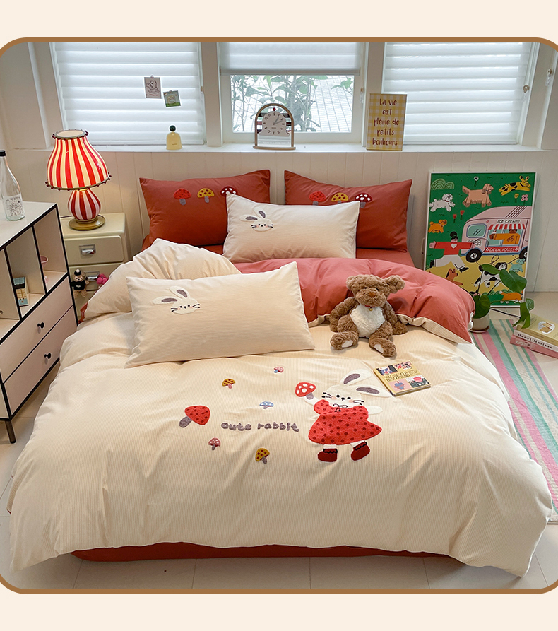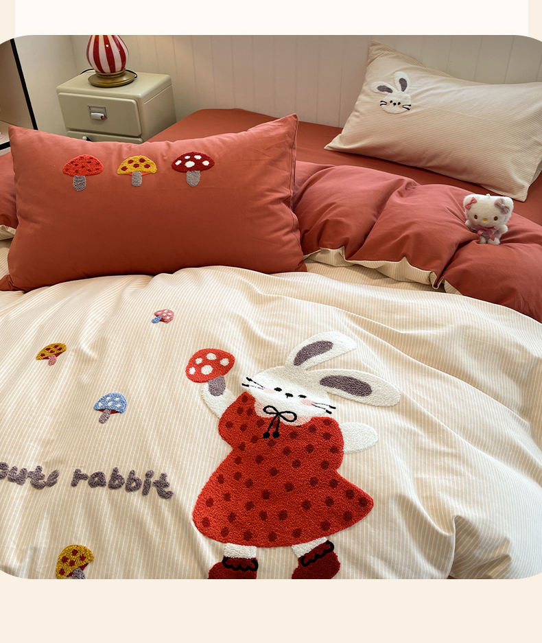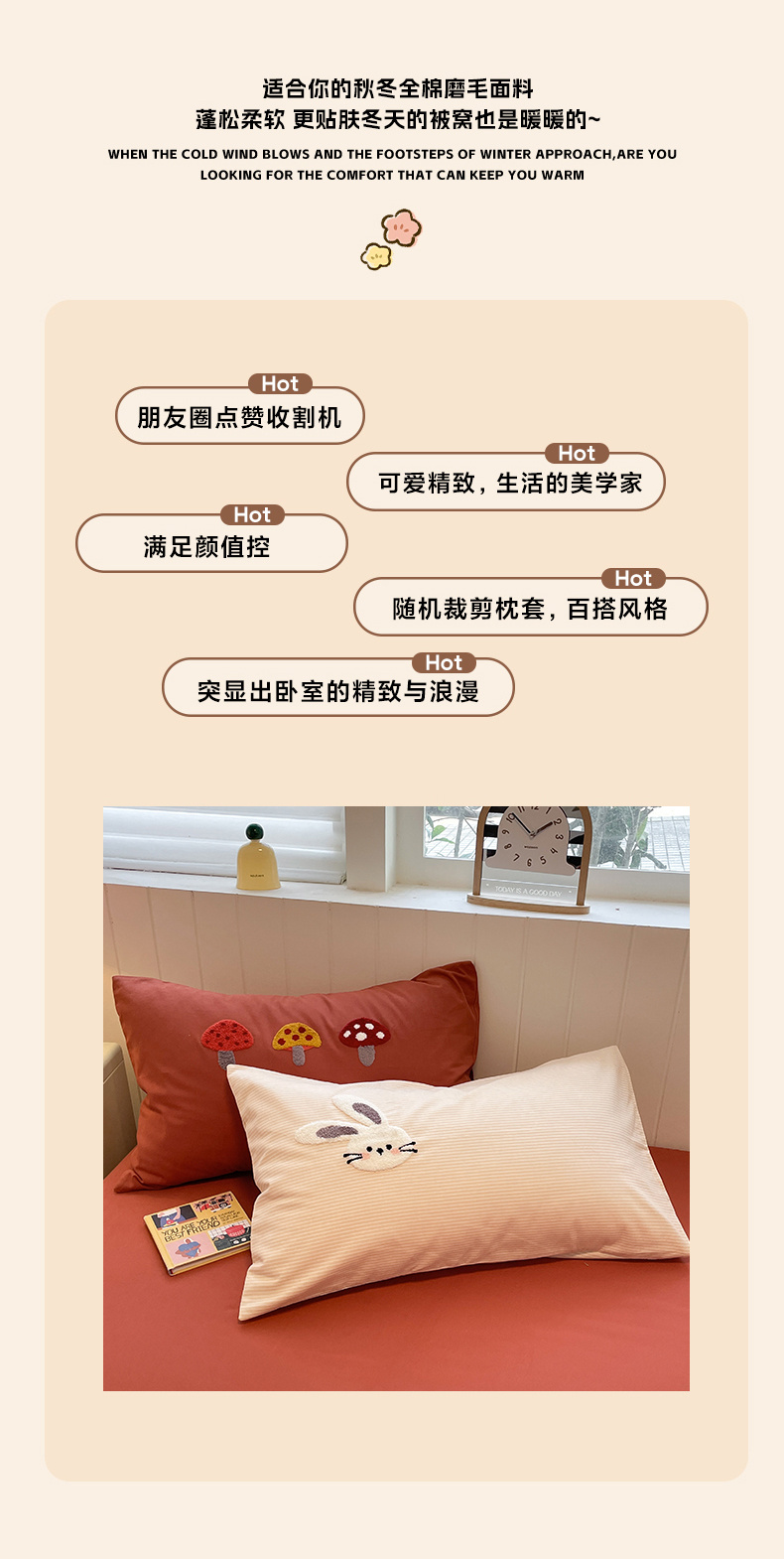 当前位置: 91家纺网 > 商品网购 > 床品套件 > 四件套 > 普通磨毛四件套 > 蓝邻家纺 2025新款全棉磨毛卡通刺绣款四件套--毛巾绣系列 蘑菇小兔