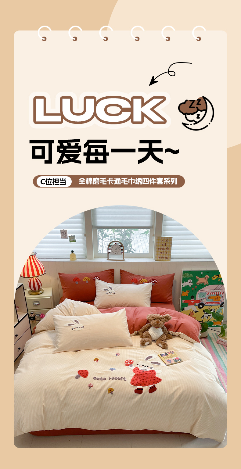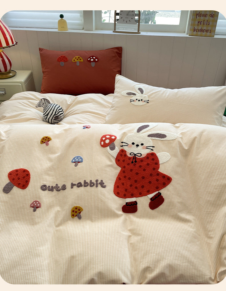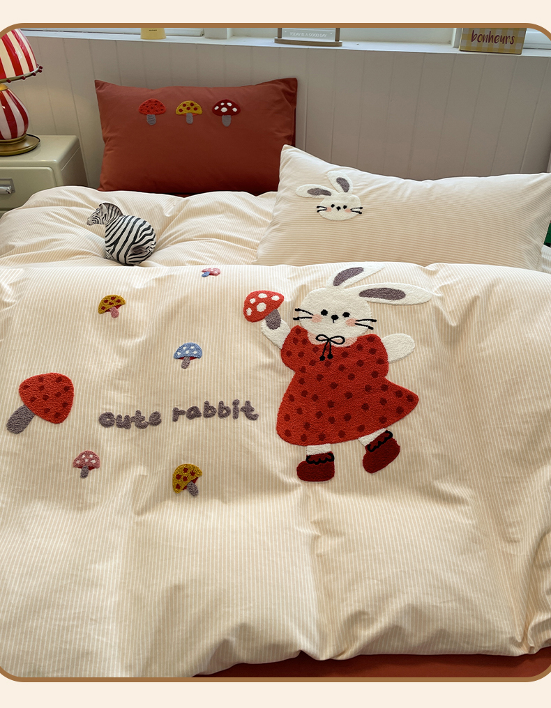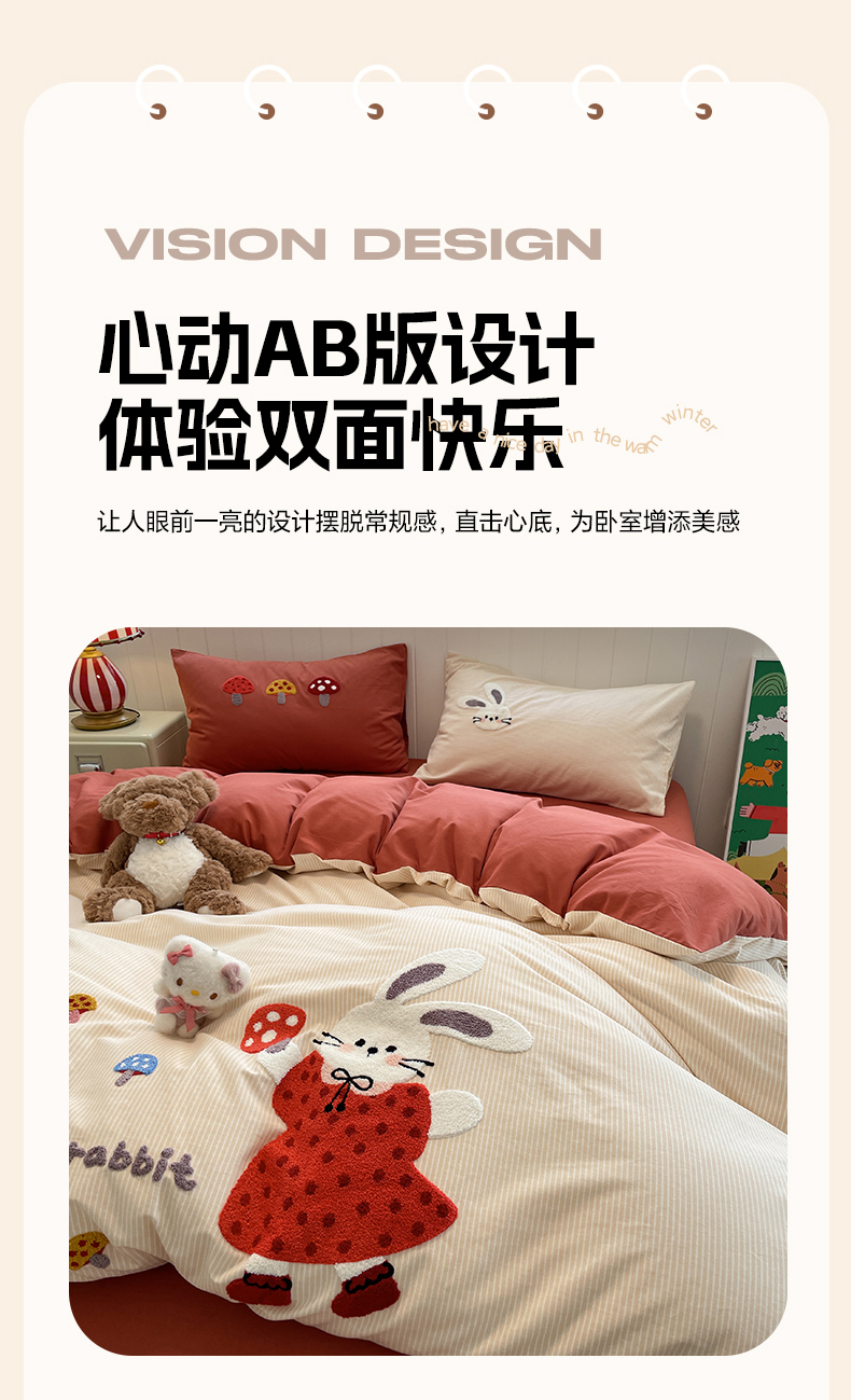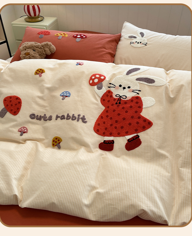 当前位置: 91家纺网 > 商品网购 > 床品套件 > 四件套 > 普通磨毛四件套 > 蓝邻家纺 2025新款全棉磨毛卡通刺绣款四件套--毛巾绣系列 蘑菇小兔