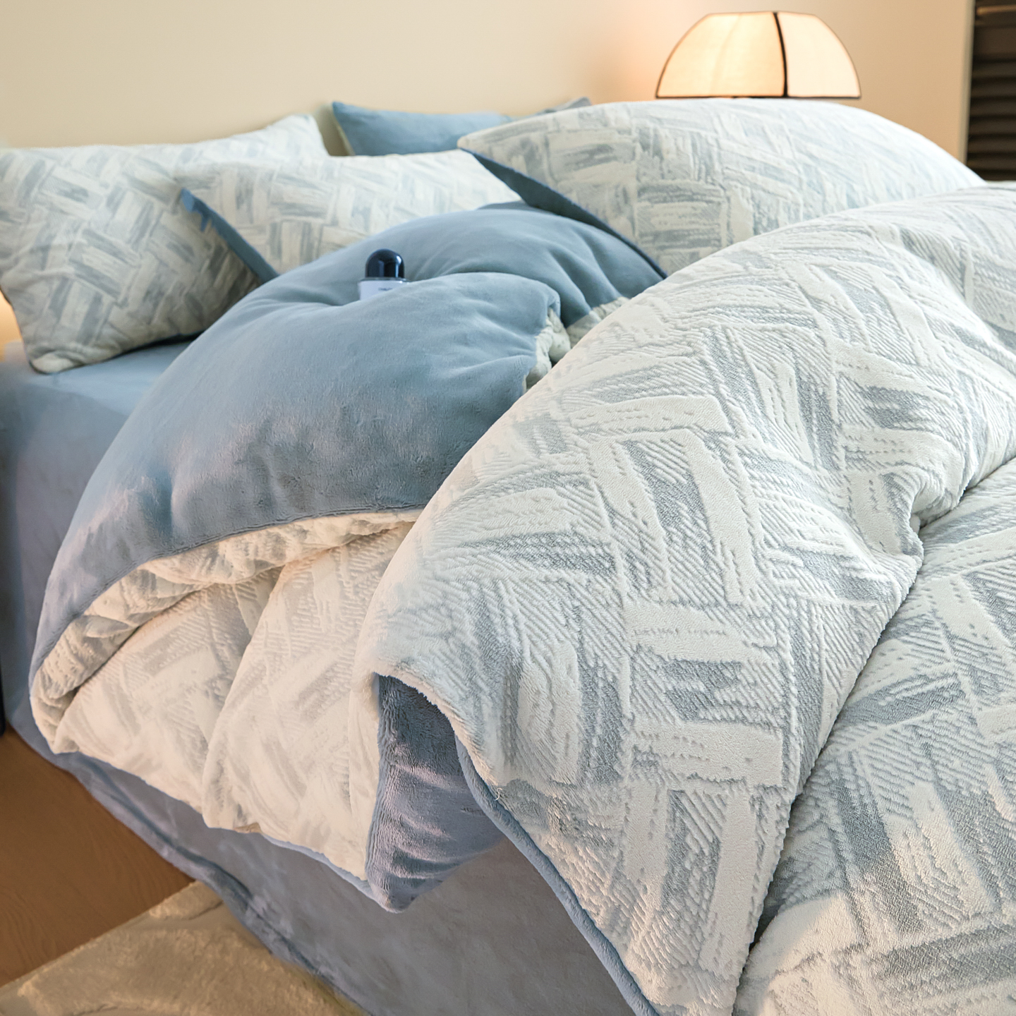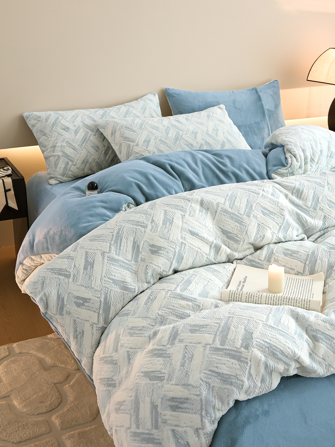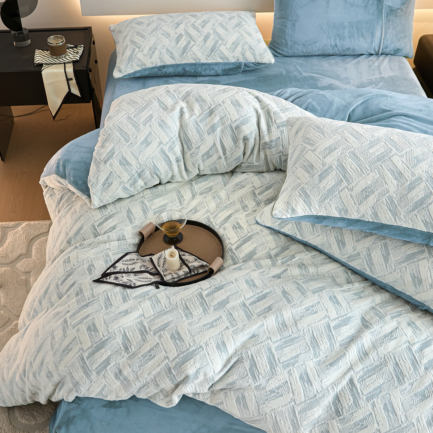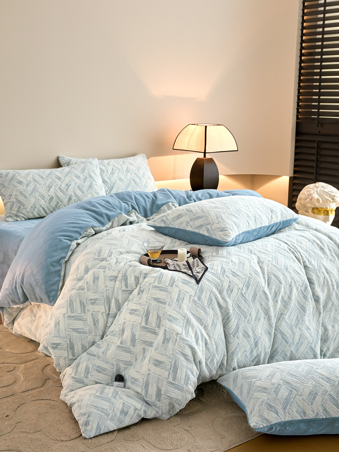 当前位置: 91家纺网 > 商品网购 > 床品套件 > 四件套 > 牛奶绒四件套 > 言一 2025新款A类全消光超柔260G保暖加厚立体雕花牛奶绒四件套 霜语-蓝
