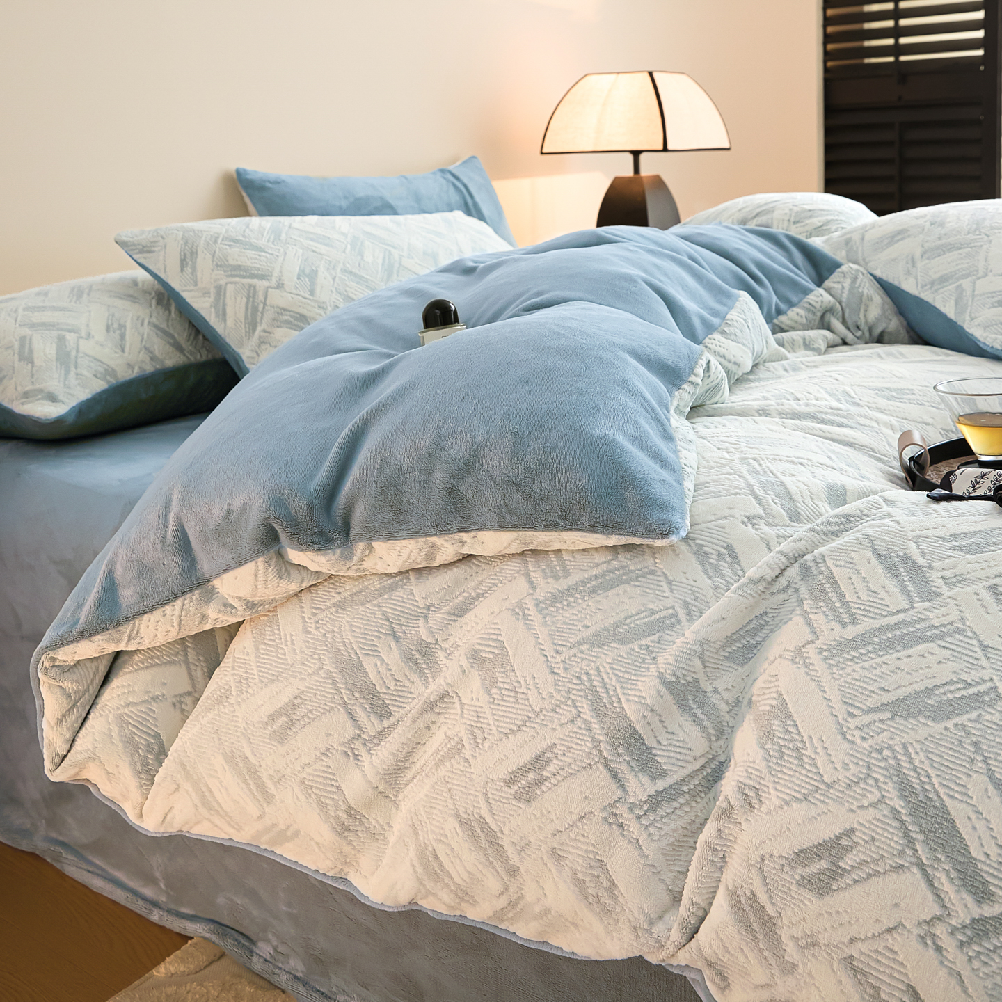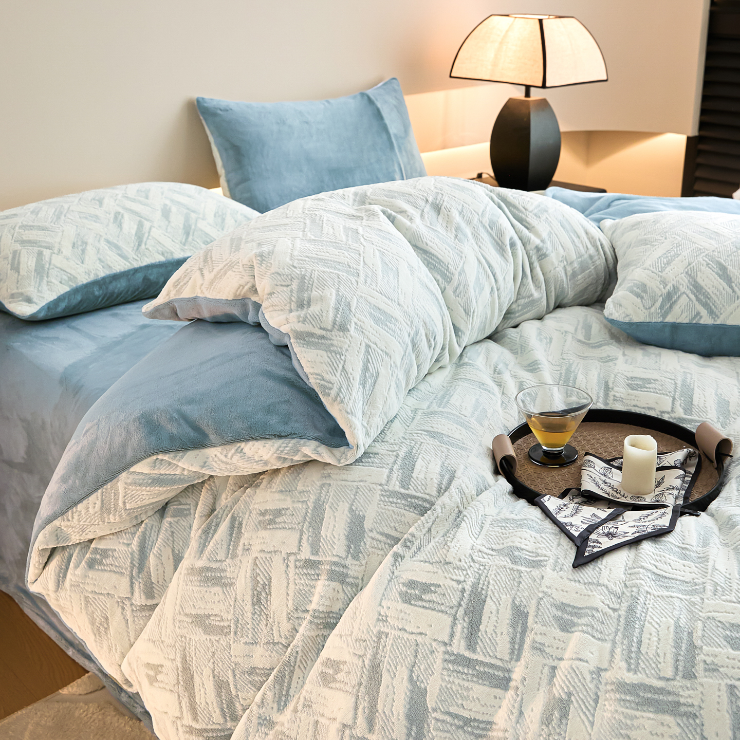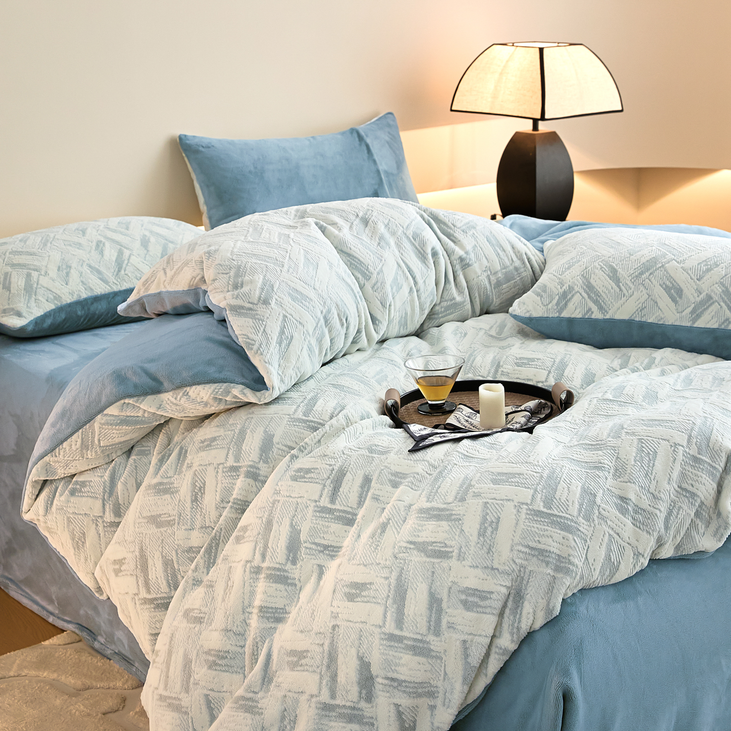 当前位置: 91家纺网 > 商品网购 > 床品套件 > 四件套 > 牛奶绒四件套 > 言一 2025新款A类全消光超柔260G保暖加厚立体雕花牛奶绒四件套 霜语-蓝