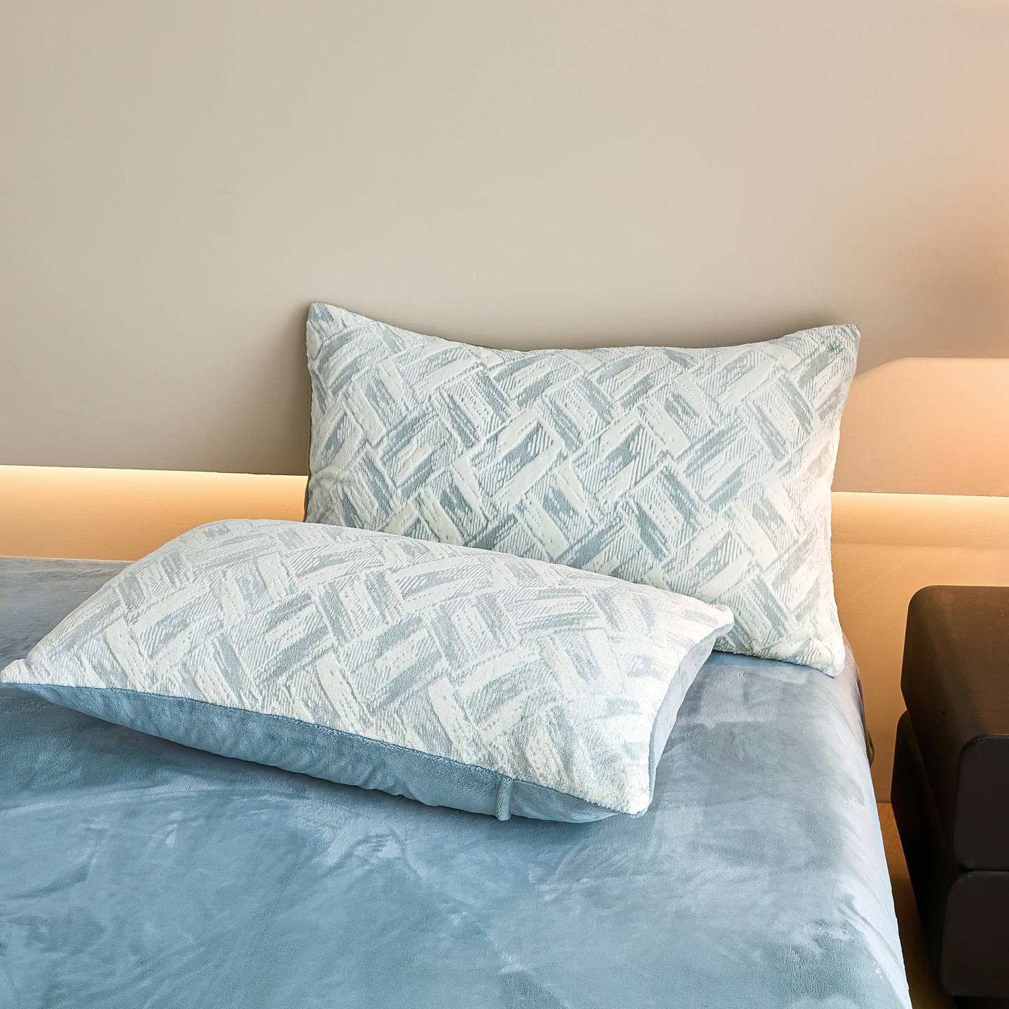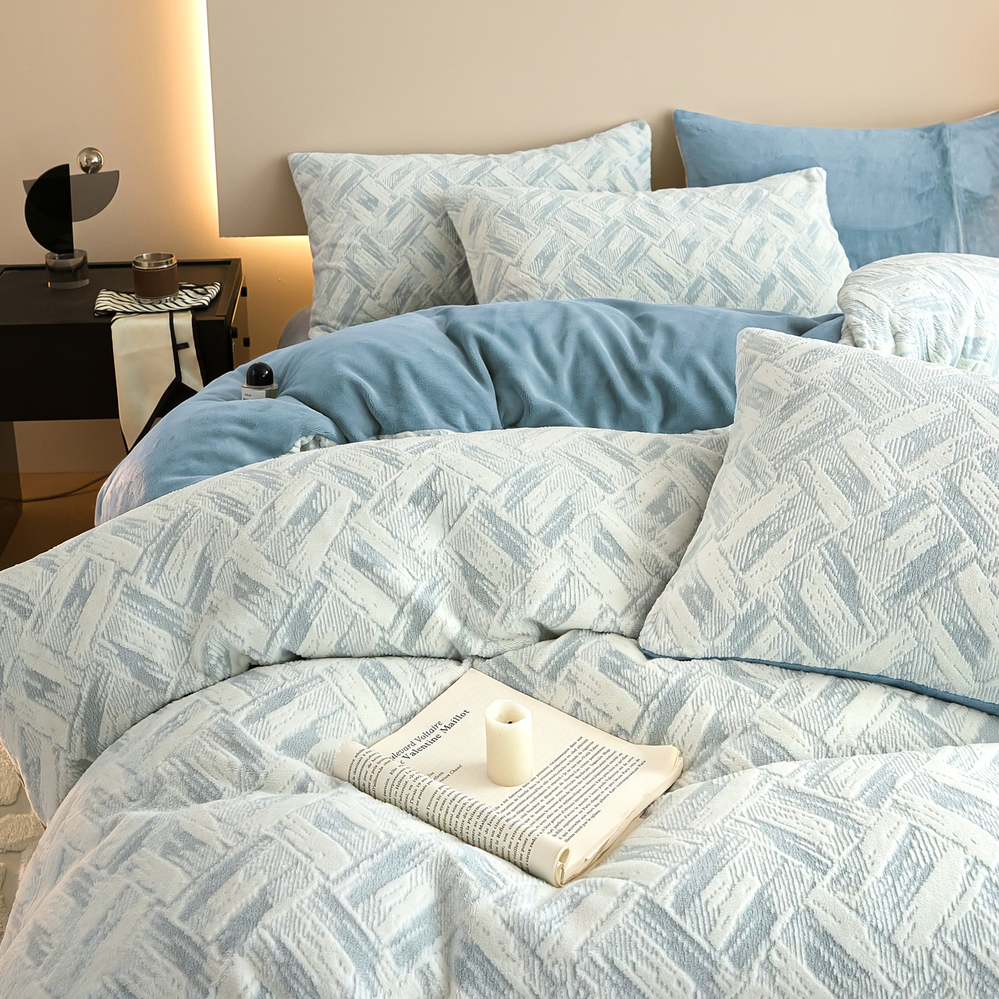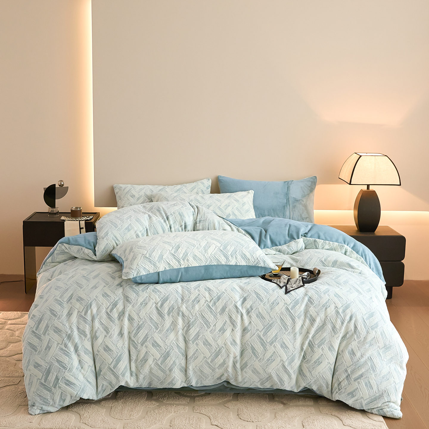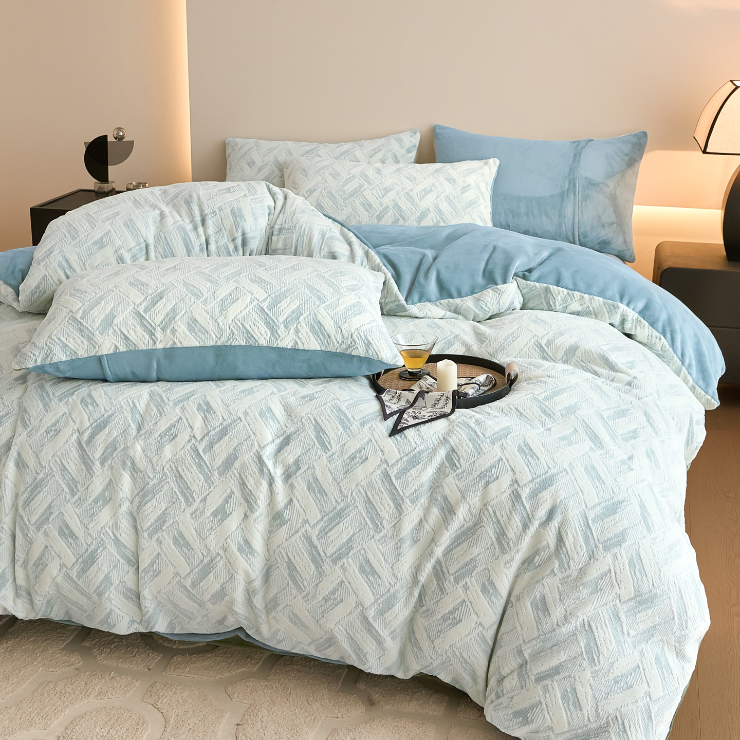 当前位置: 91家纺网 > 商品网购 > 床品套件 > 四件套 > 牛奶绒四件套 > 言一 2025新款A类全消光超柔260G保暖加厚立体雕花牛奶绒四件套 霜语-蓝