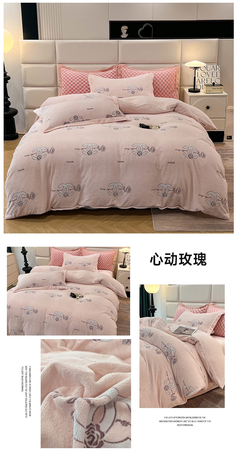 (总)花香四季家纺 2025新款雕花绒牛奶绒夹棉床盖款四件套系列-浪漫情缘,浪漫情缘-粉色,浪漫情缘-米白