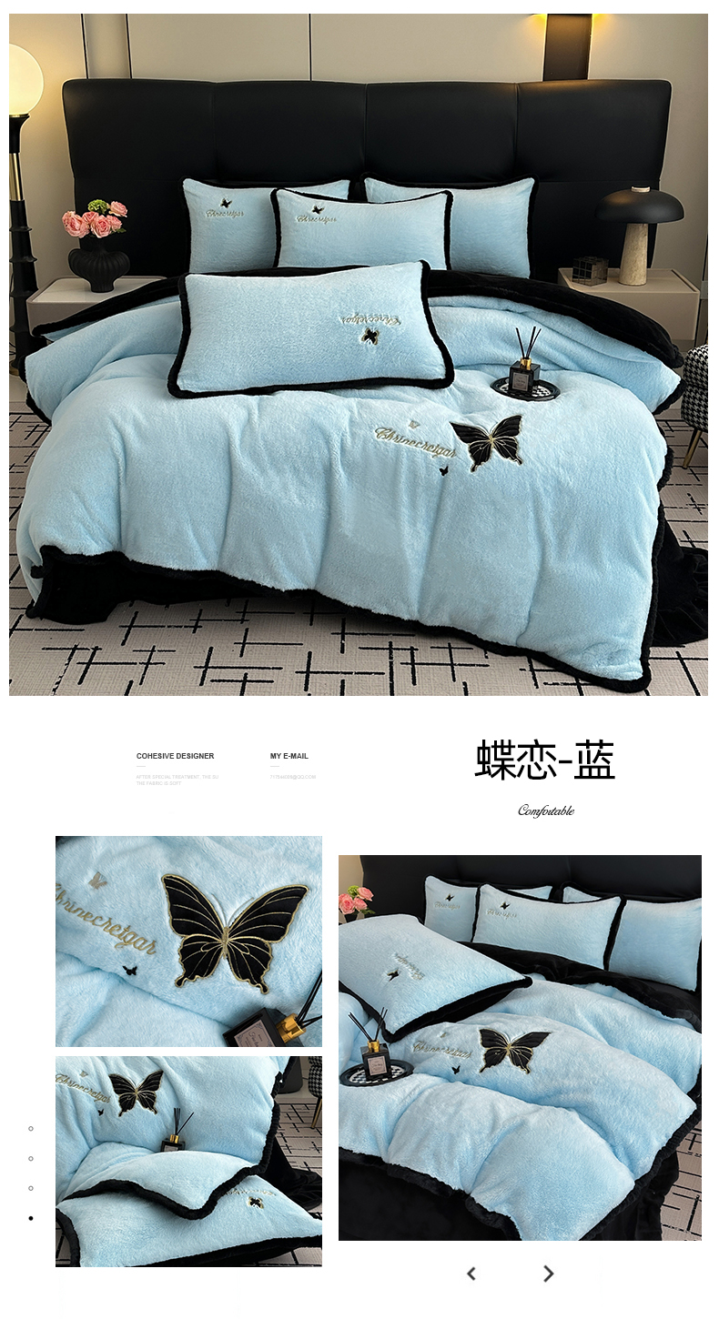 商品名称:2025兔毛包边贴布绣花牛奶绒四件套蝶恋 蝶恋-蓝