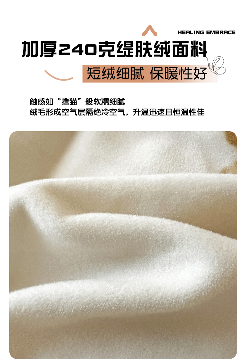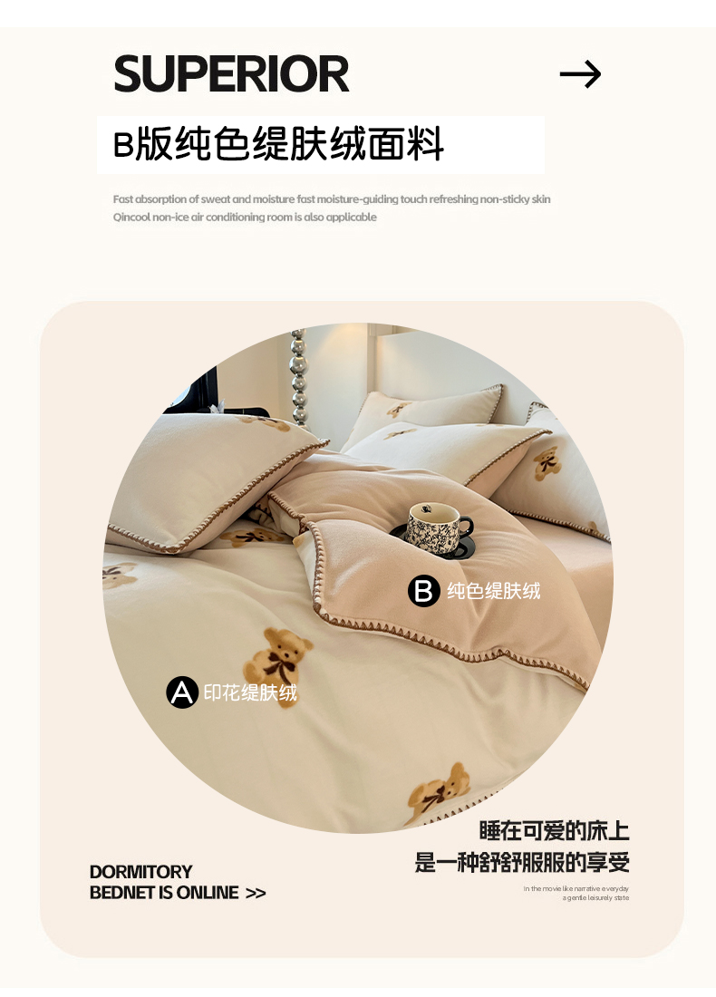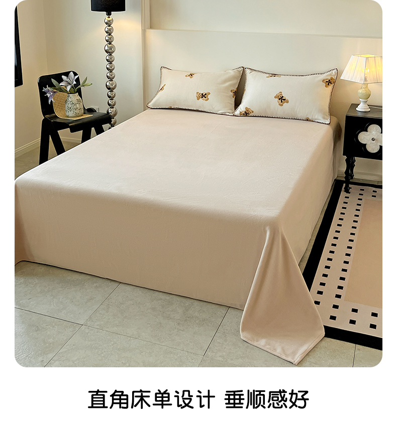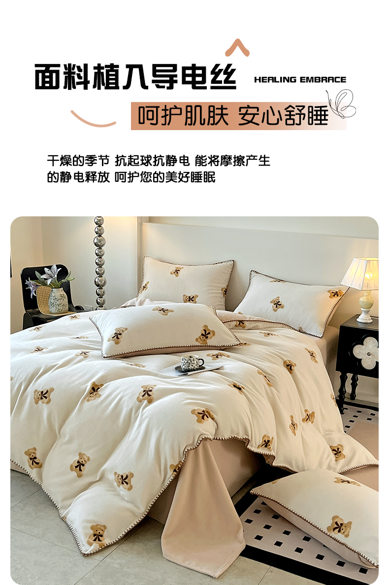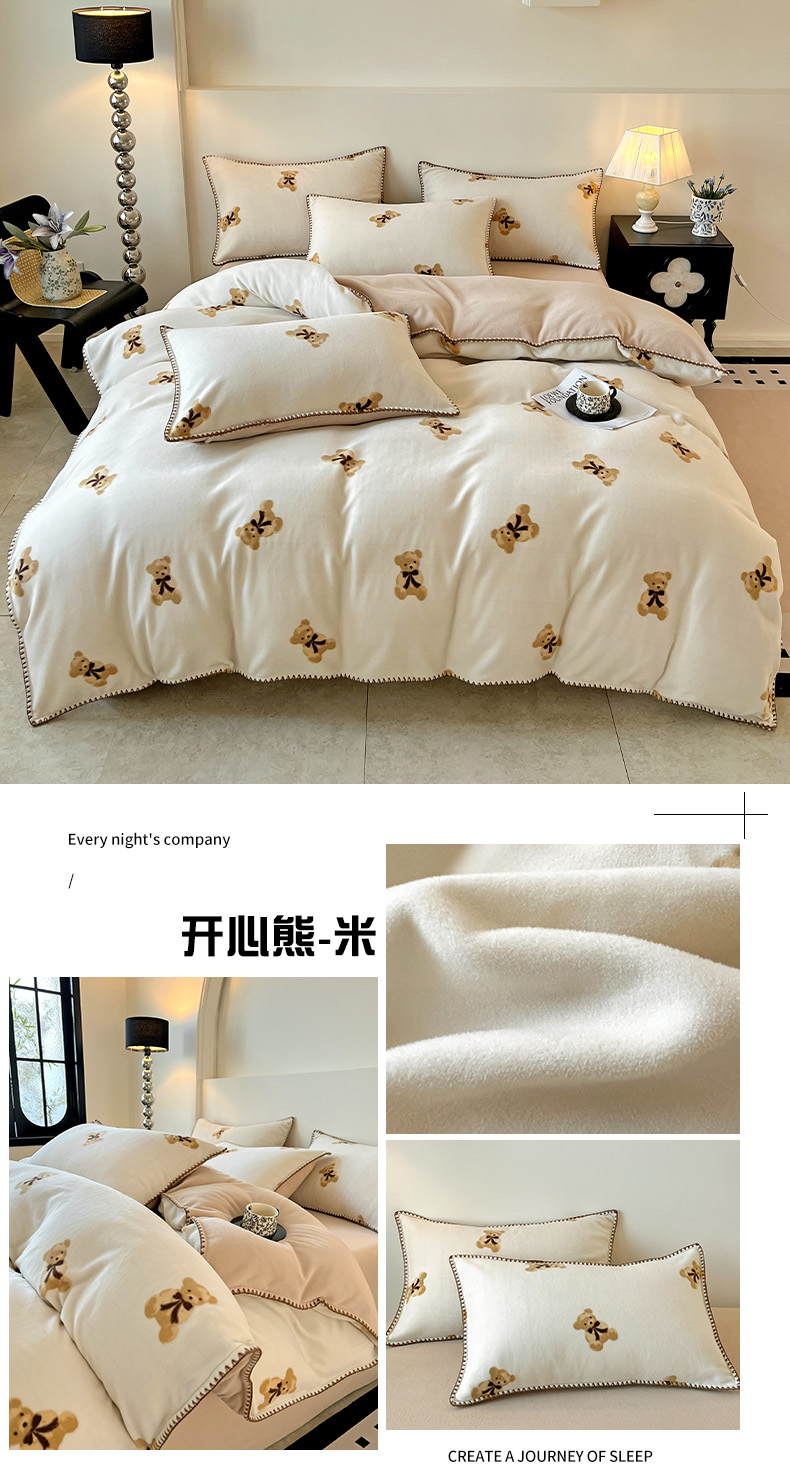 商品名称:忆生活家纺 2025秋冬新品软糯缇肤绒印花贝壳边四件套 开心熊-米