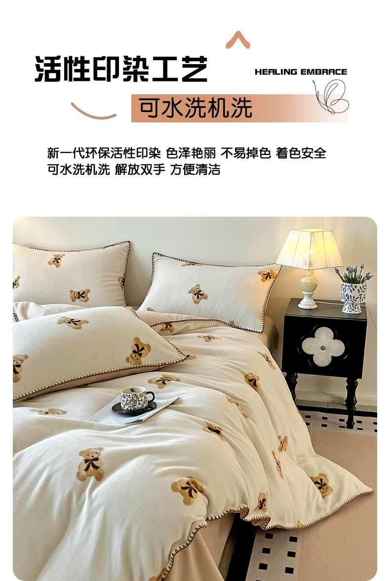 (总)忆生活家纺 2025秋冬新品软糯缇肤绒印花贝壳边四件套,卡拉-灰,开心熊-米,南笙-咖,南笙-绿,浅夏-咖,素影-酒红,素影-紫,小樱桃-酒红,叶茂-驼