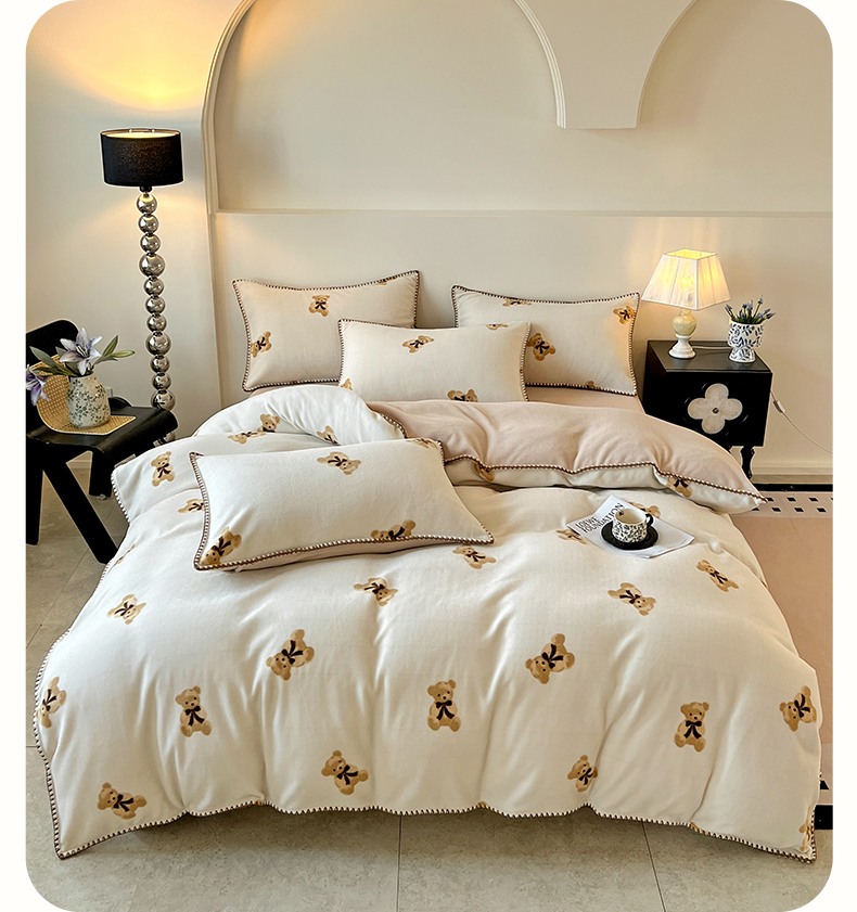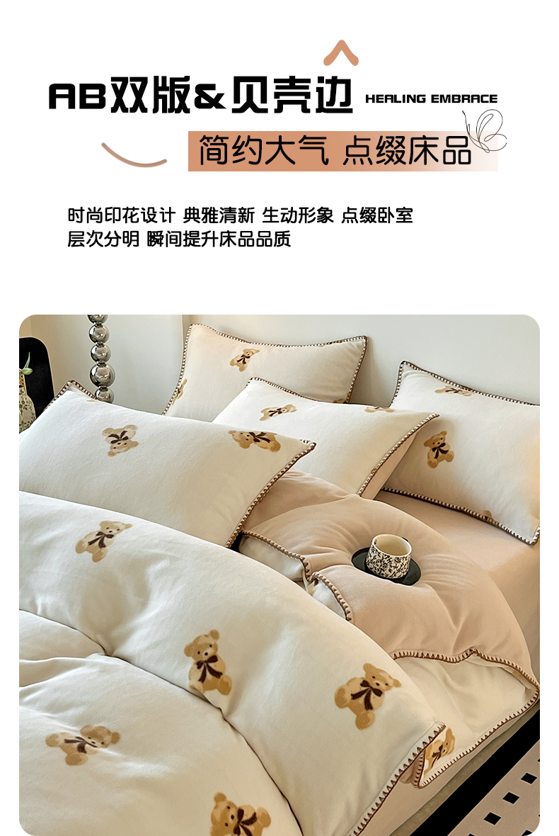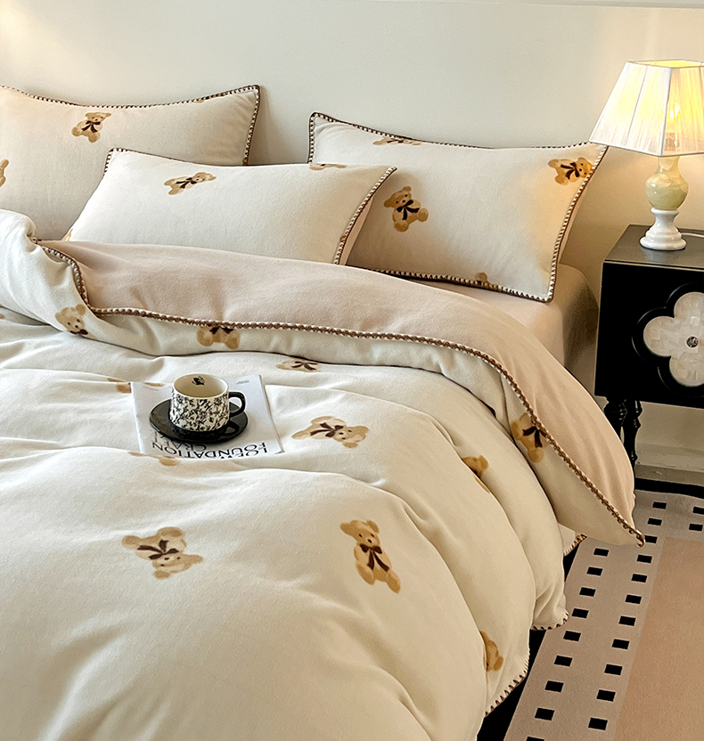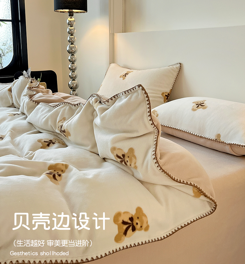 忆生活家纺 2025秋冬新品软糯缇肤绒印花贝壳边四件套 开心熊-米