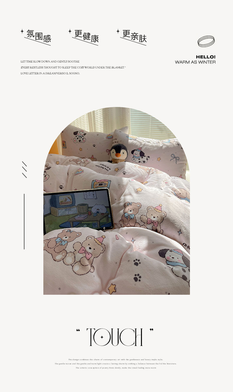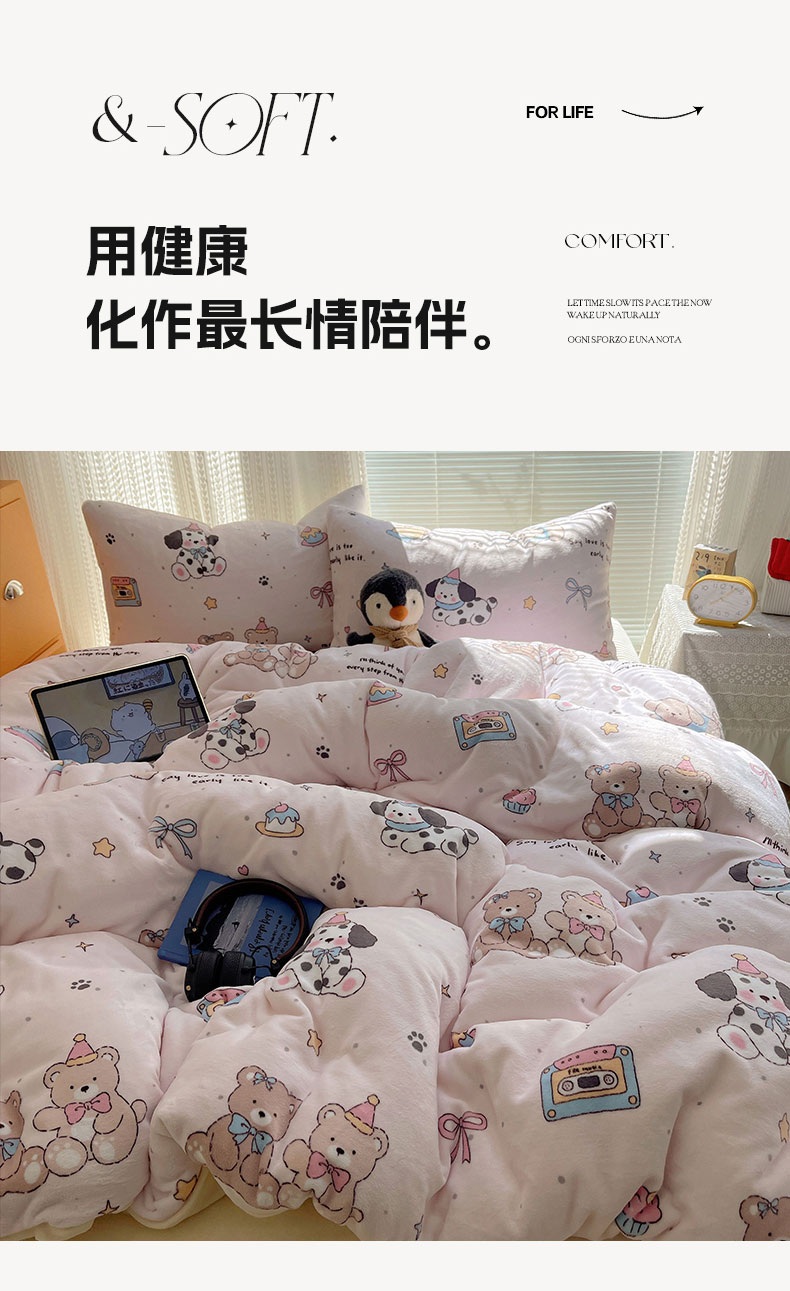 商品名称:六巷胡同 2025新款INS卡通A类200克牛奶绒基础款四件套(第一系) 基础款-磁带熊仔粉