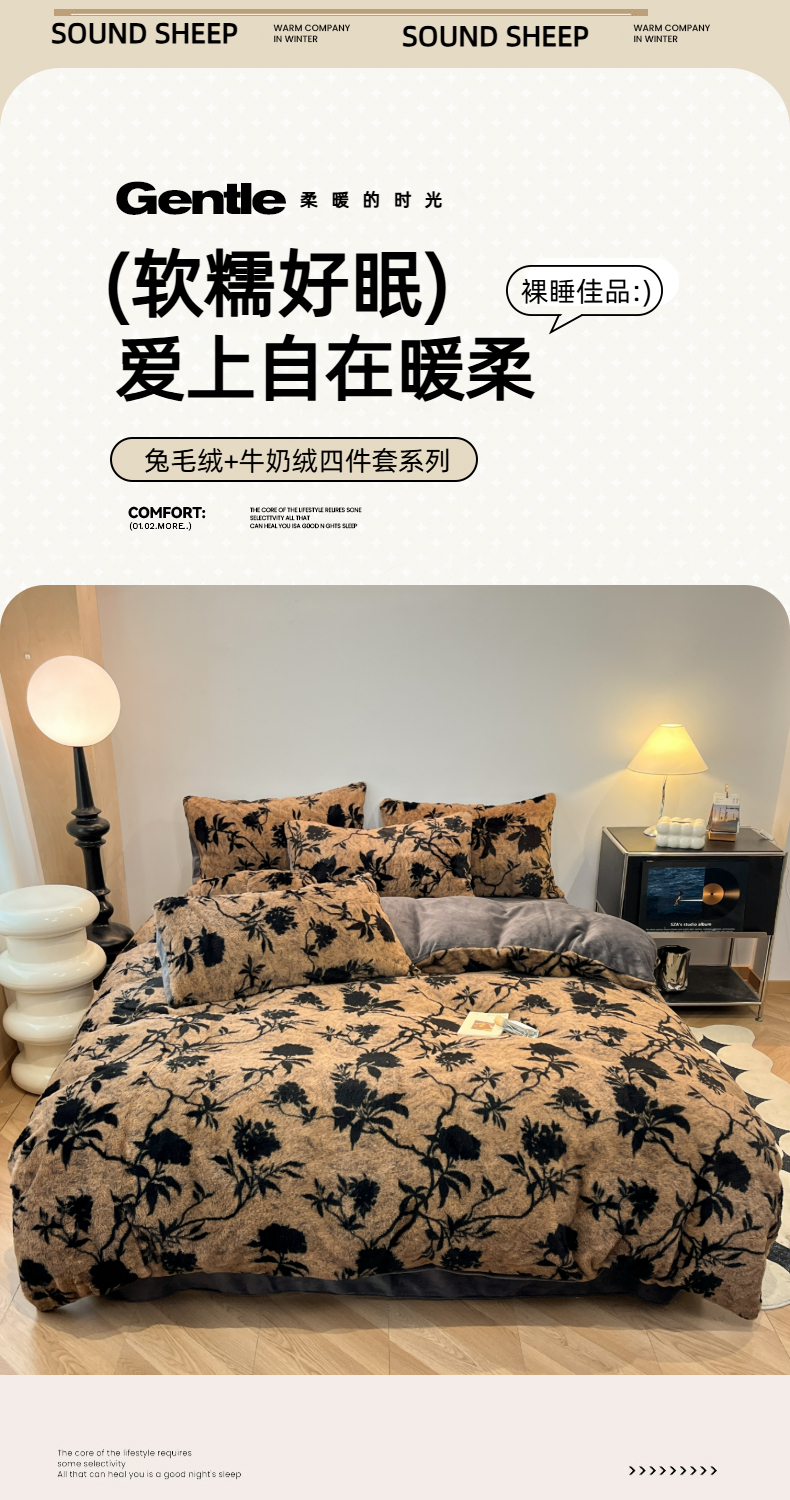 金爱家 2025新款全消光牛奶绒A类赫本风纯色獭兔毛绒立体牛奶绒四件套 兔毛-芳华驼色