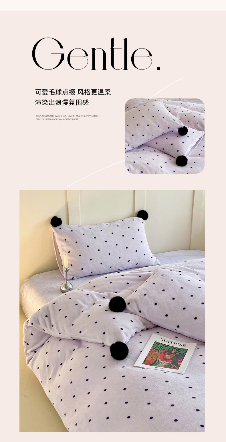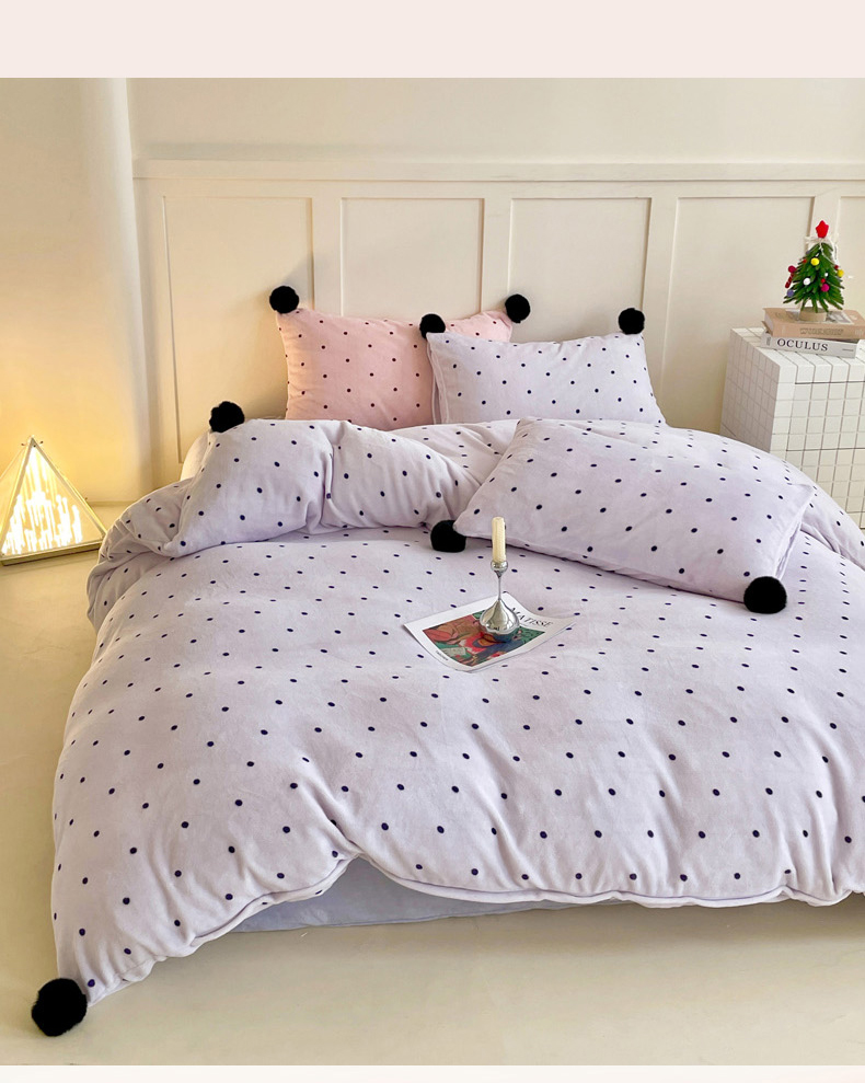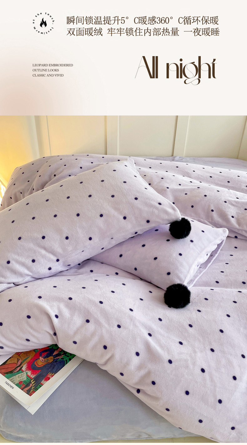 当前位置: 91家纺网 > 商品网购 > 床品套件 > 四件套 > 牛奶绒四件套 > 丽涵家纺 2025秋冬新品混搭波点牛奶绒四件套-拍摄风格一 波点-紫色