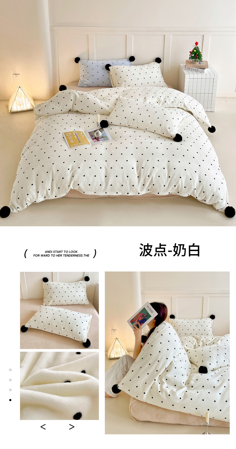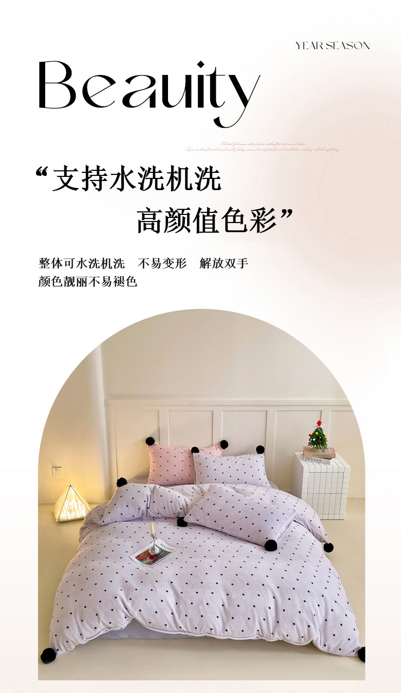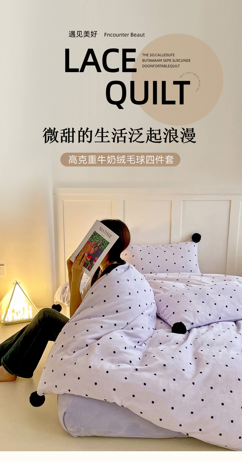 当前位置: 91家纺网 > 商品网购 > 床品套件 > 四件套 > 牛奶绒四件套 > 丽涵家纺 2025秋冬新品混搭波点牛奶绒四件套-拍摄风格一 波点-紫色