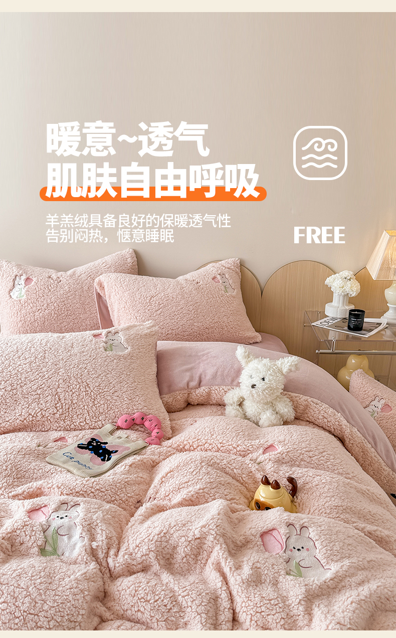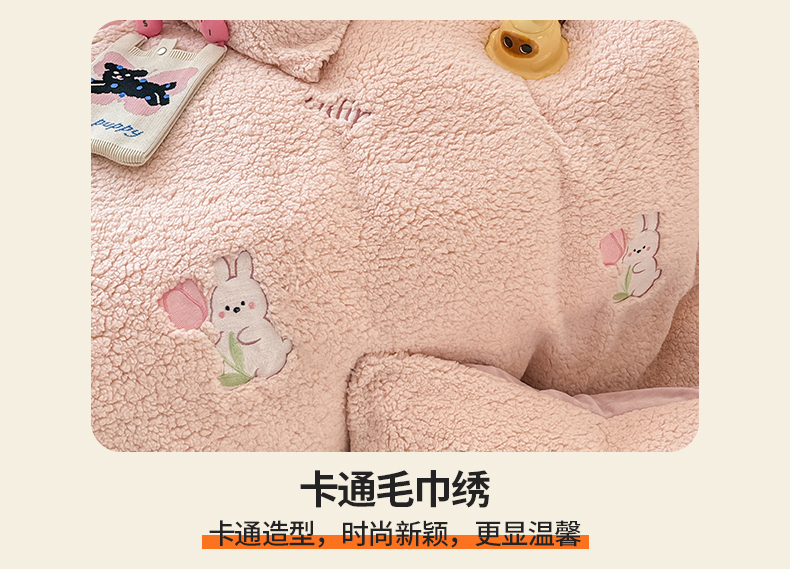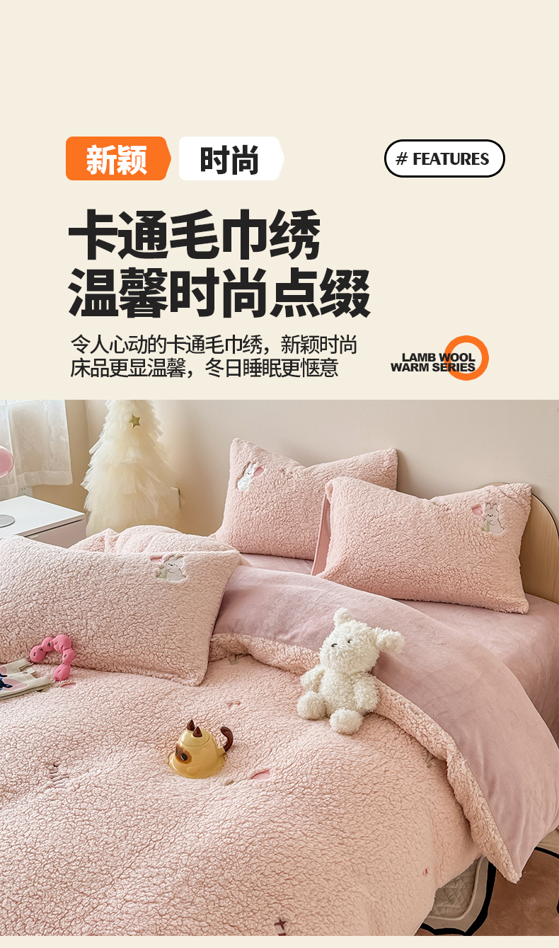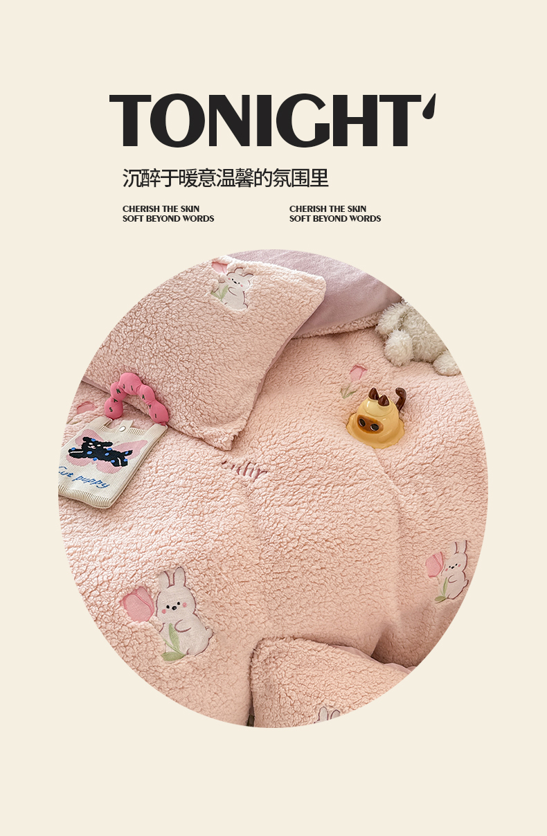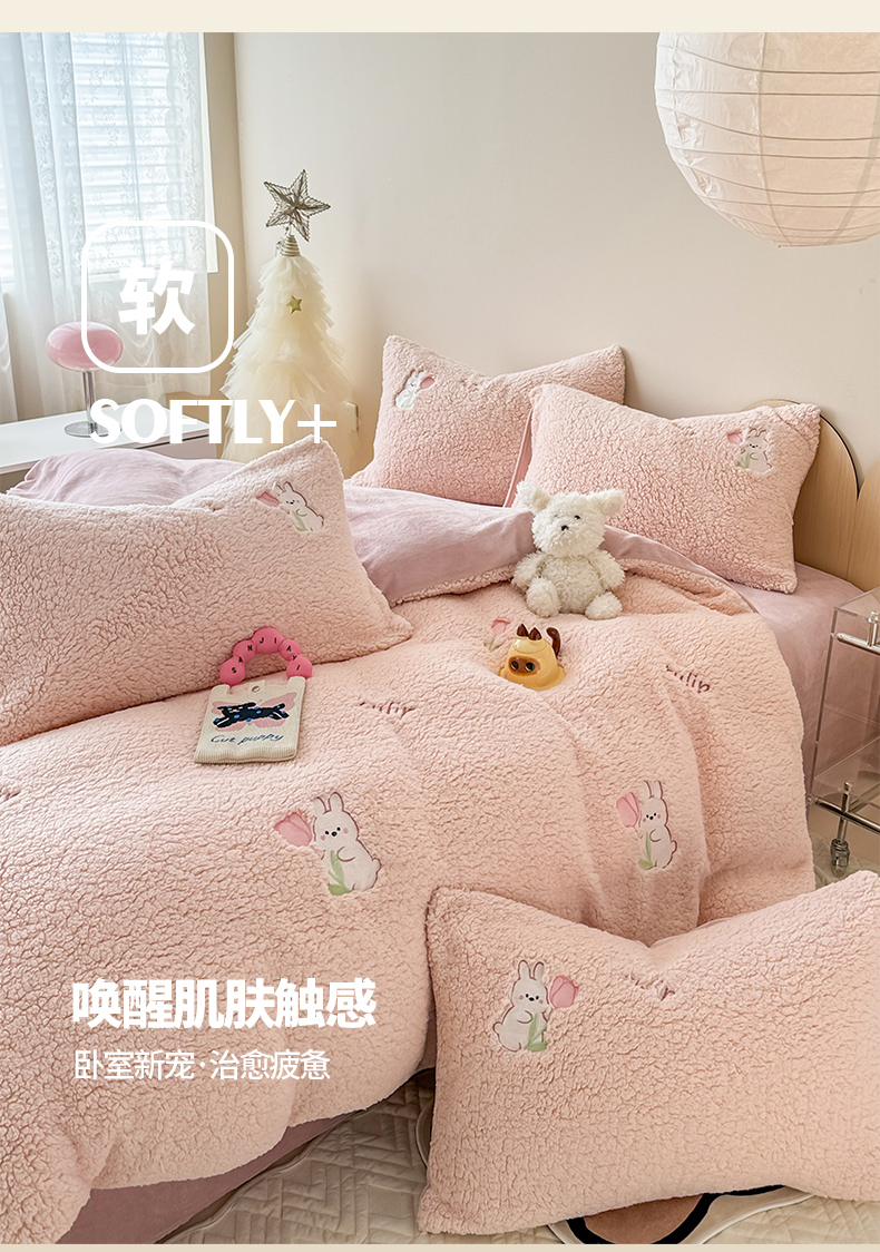 当前位置: 91家纺网 > 商品网购 > 床品套件 > 四件套 > 其它四件套 > 典曼家纺 2025新款A类羊羔绒刺绣四件套系列 花小兔