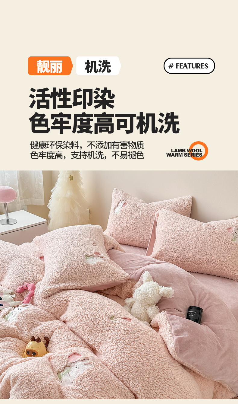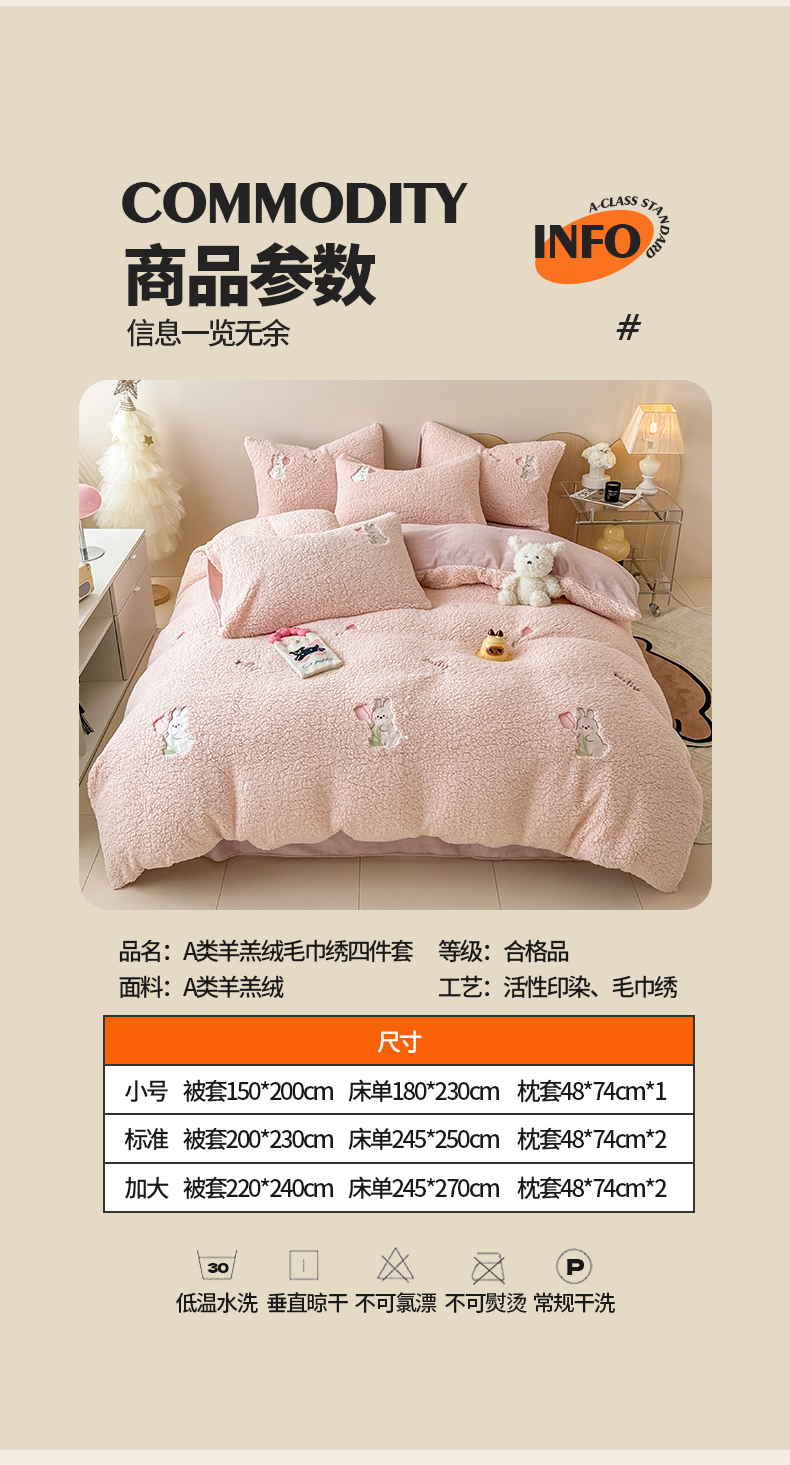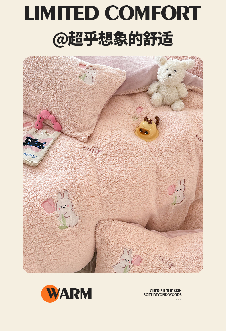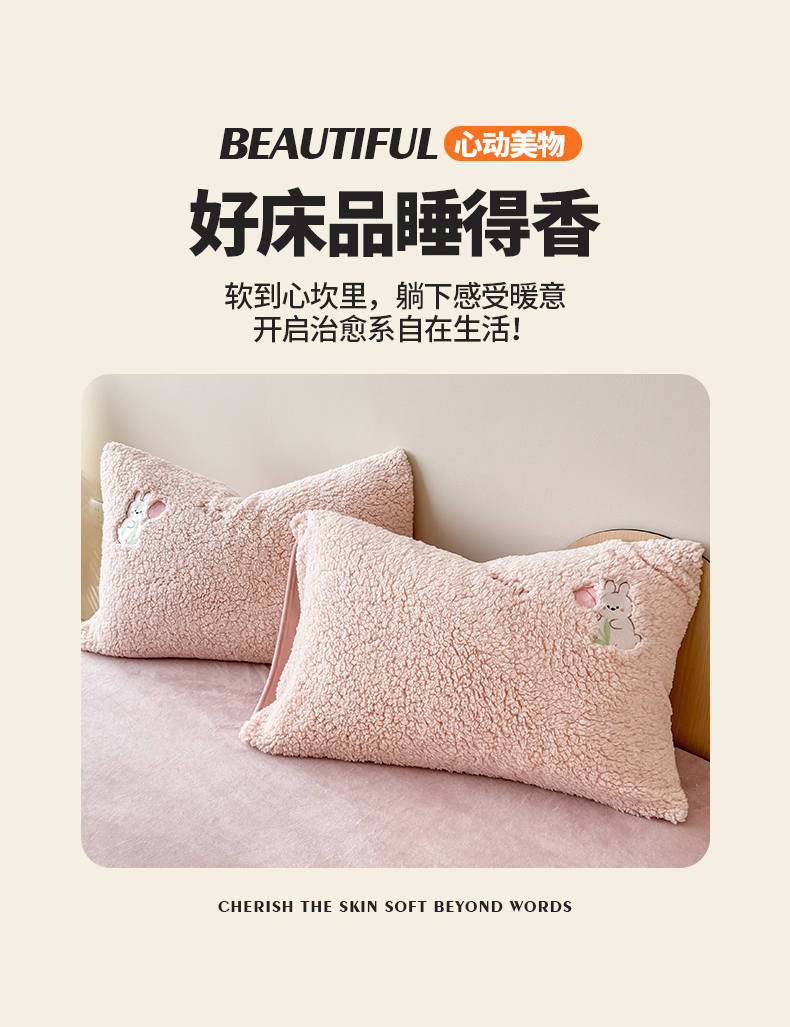 当前位置: 91家纺网 > 商品网购 > 床品套件 > 四件套 > 其它四件套 > 典曼家纺 2025新款A类羊羔绒刺绣四件套系列 花小兔