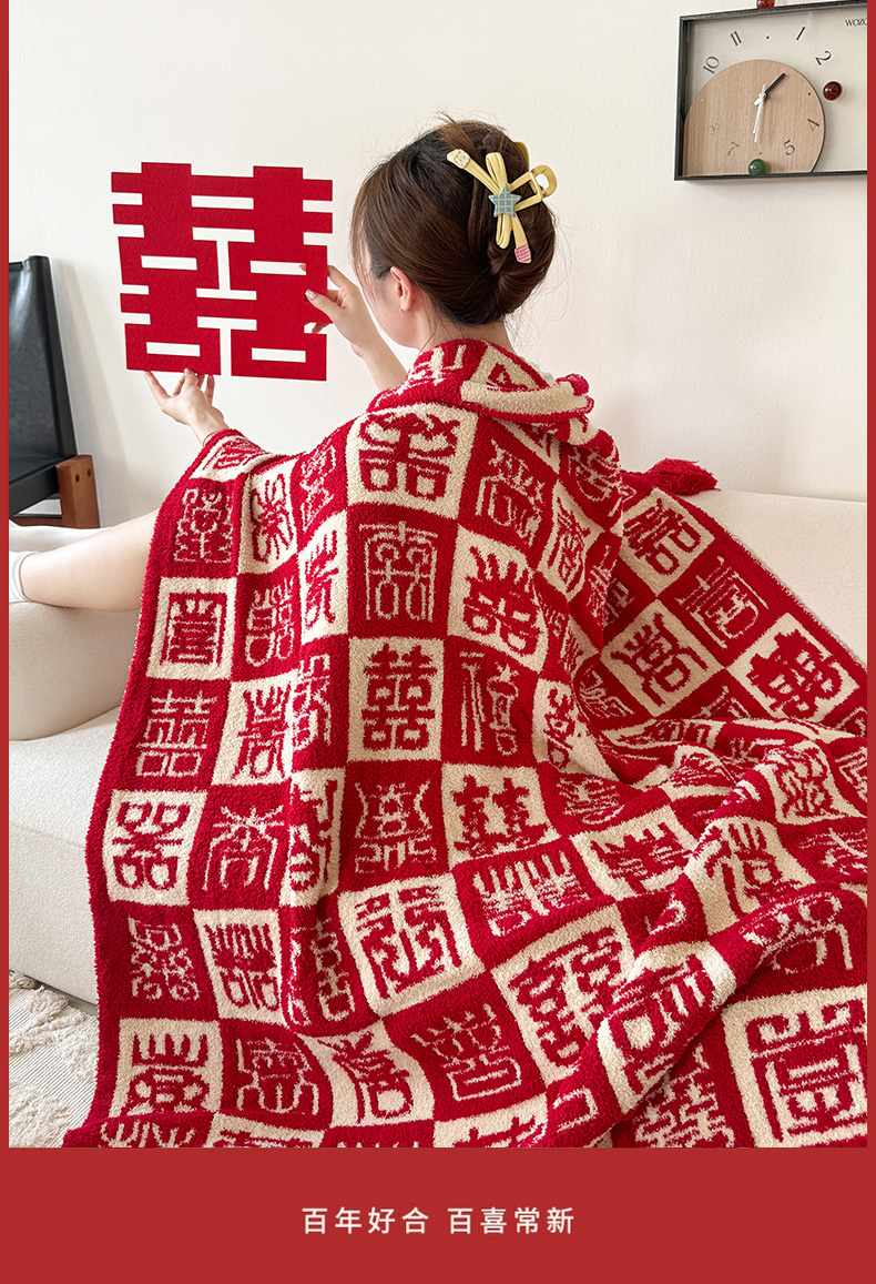 (总)丹本家纺 2025新款A类结婚订婚红双喜半边绒流苏吊坠毛毯绒毯盖毯手工针织毯,百喜毯,喜结良缘,喜上加喜