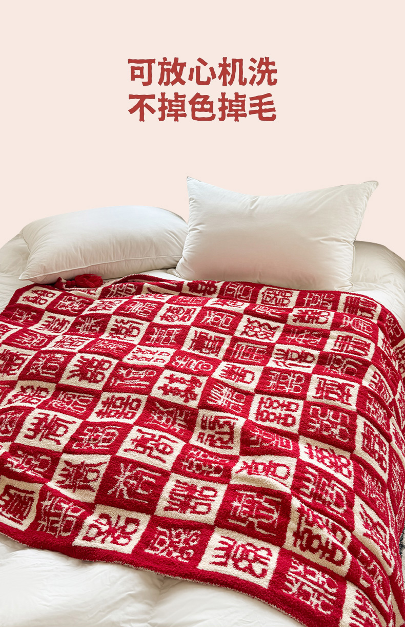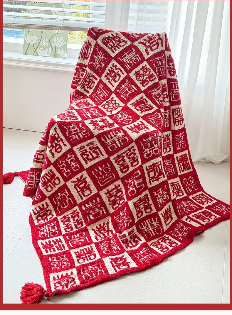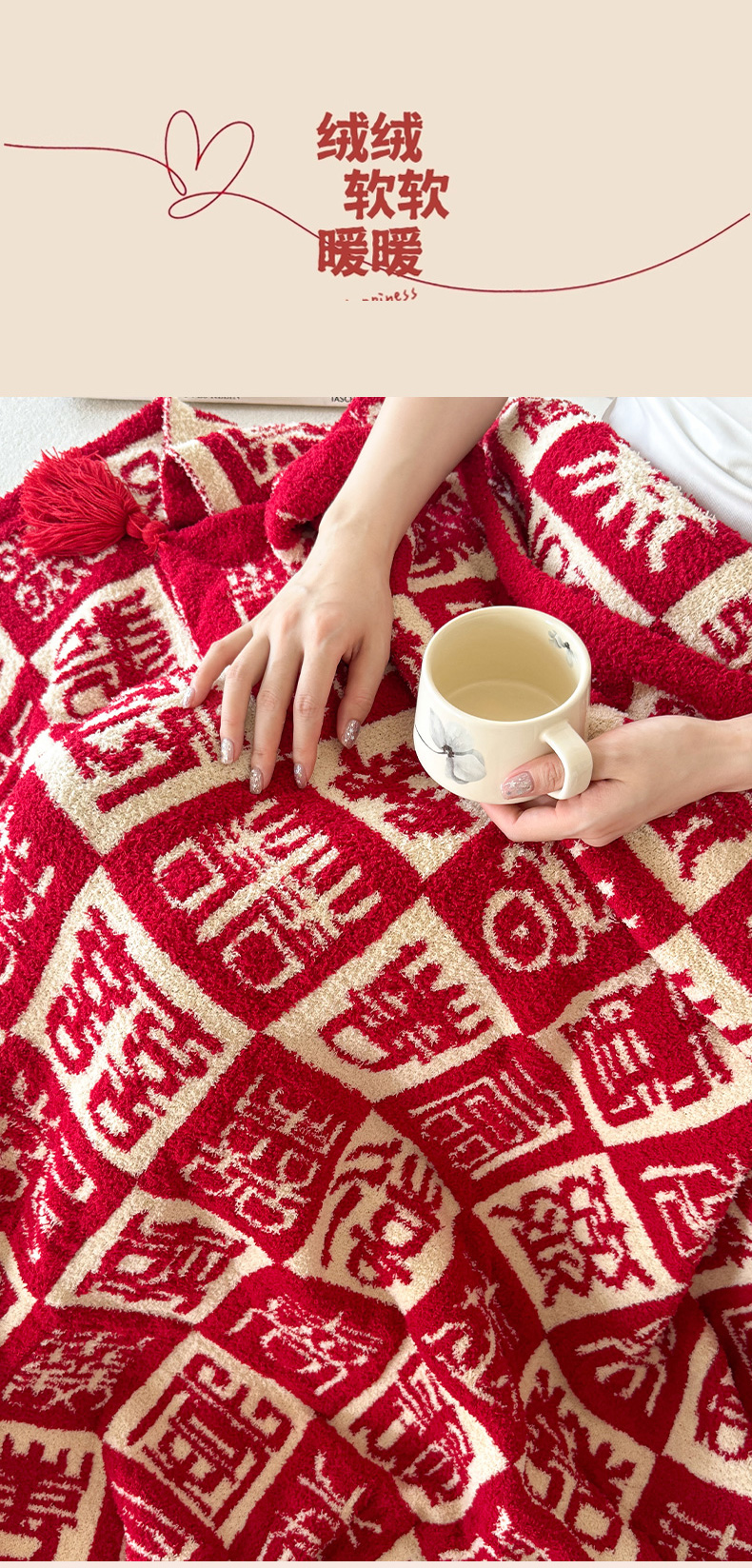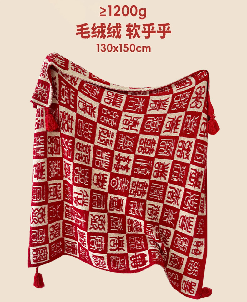 商品名称:(总)丹本家纺 2025新款A类结婚订婚红双喜半边绒流苏吊坠毛毯绒毯盖毯手工针织毯