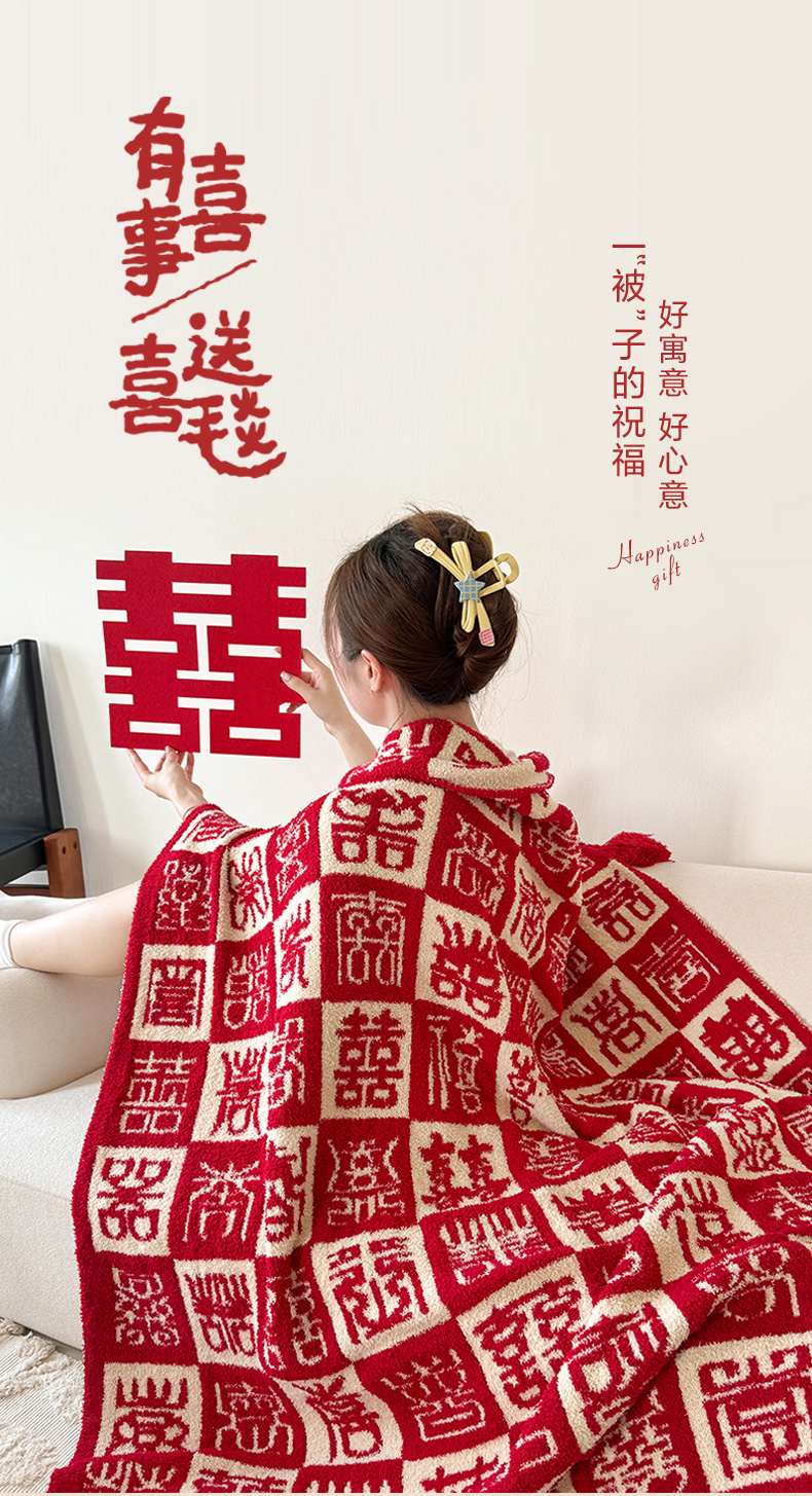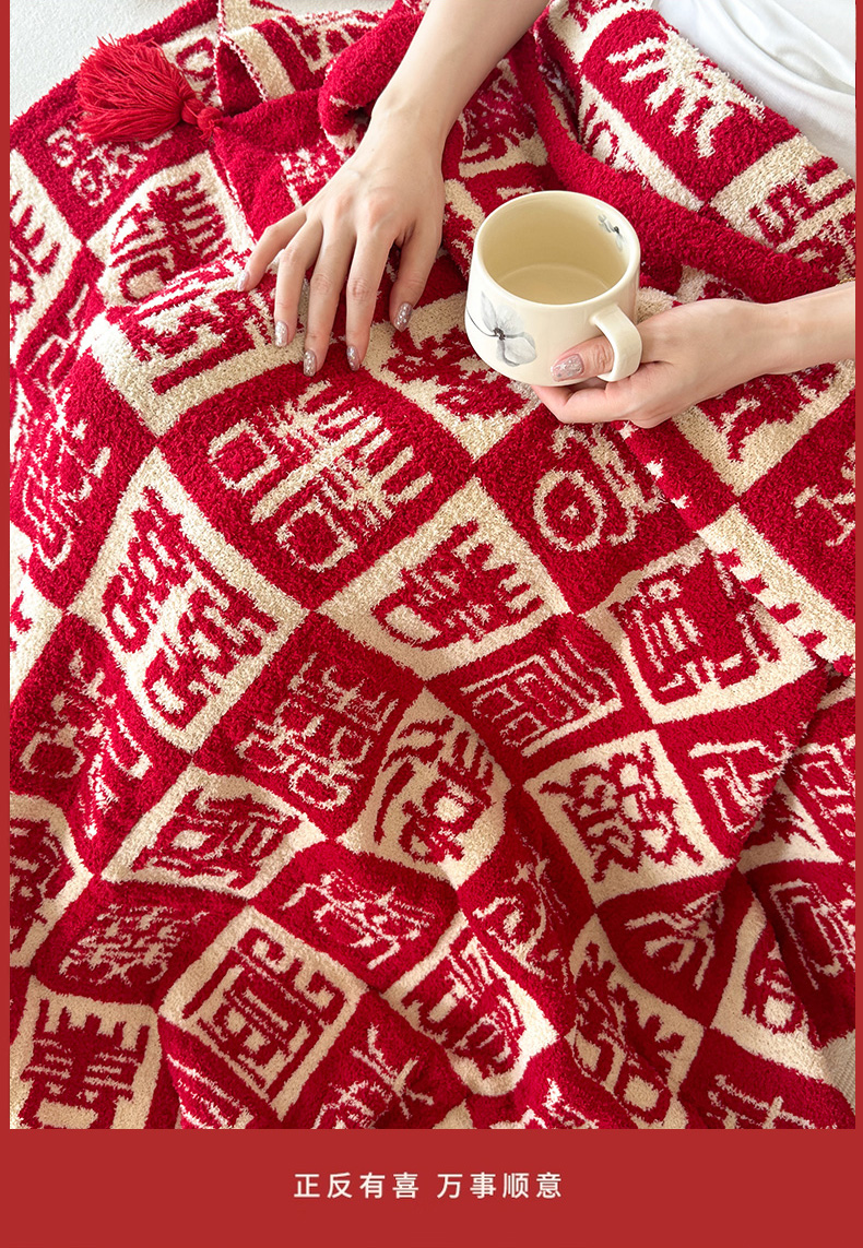(总)丹本家纺 2025新款A类结婚订婚红双喜半边绒流苏吊坠毛毯绒毯盖毯手工针织毯