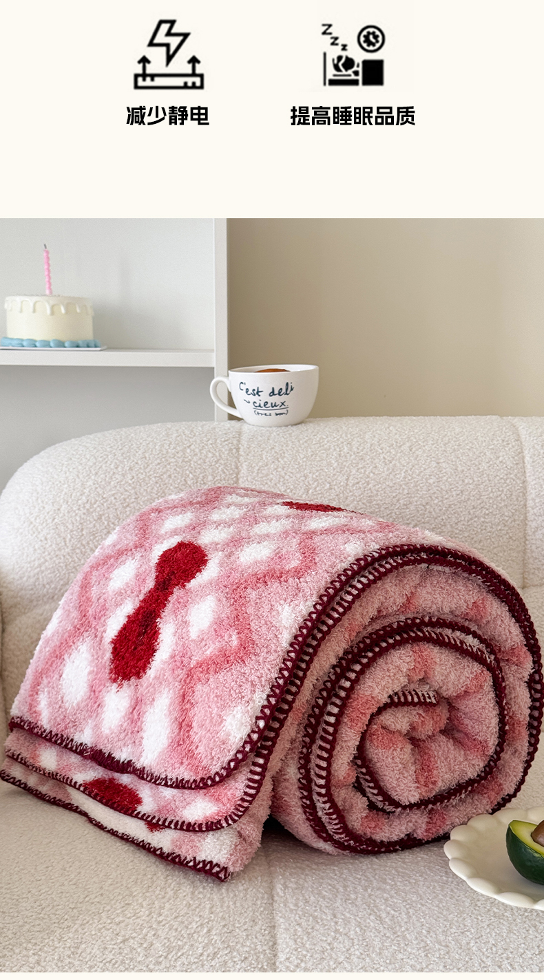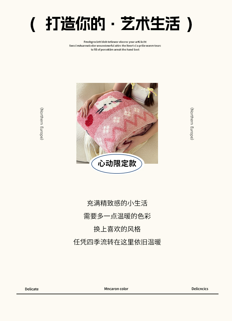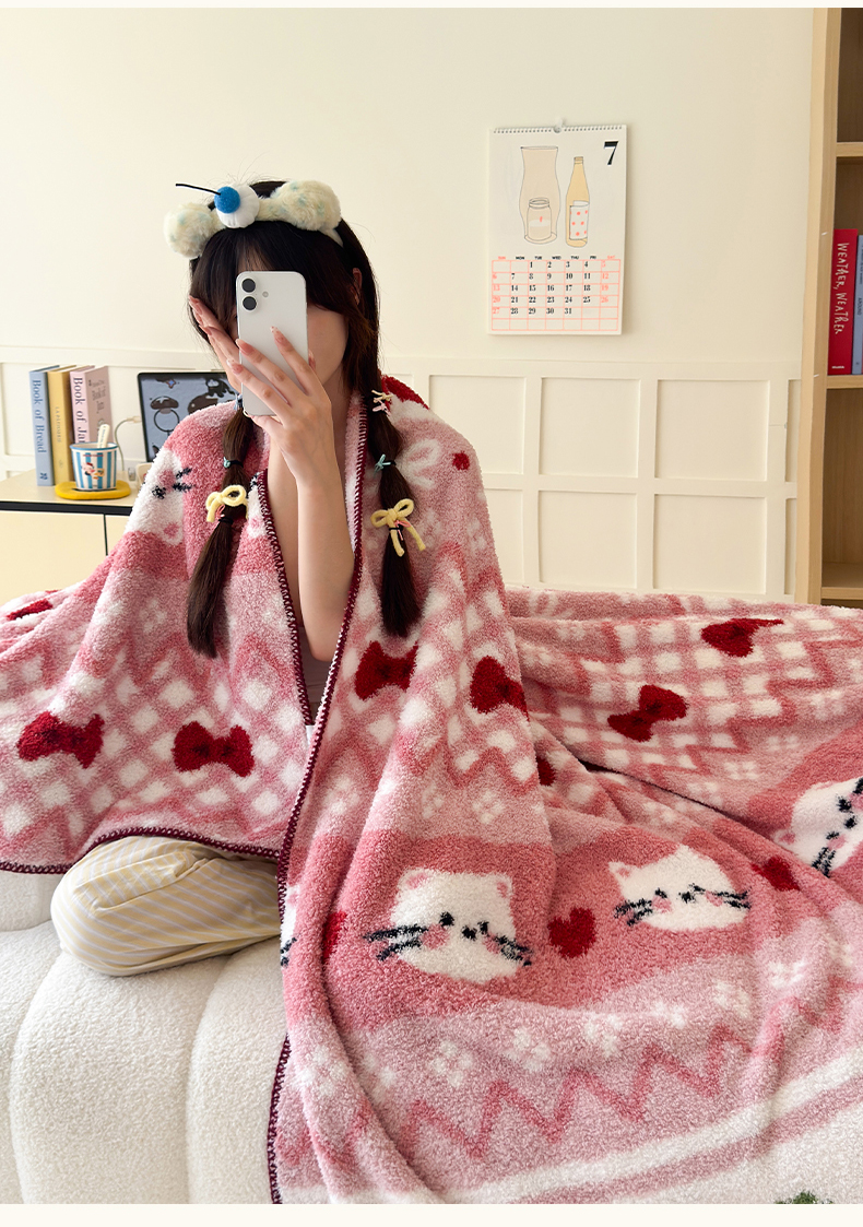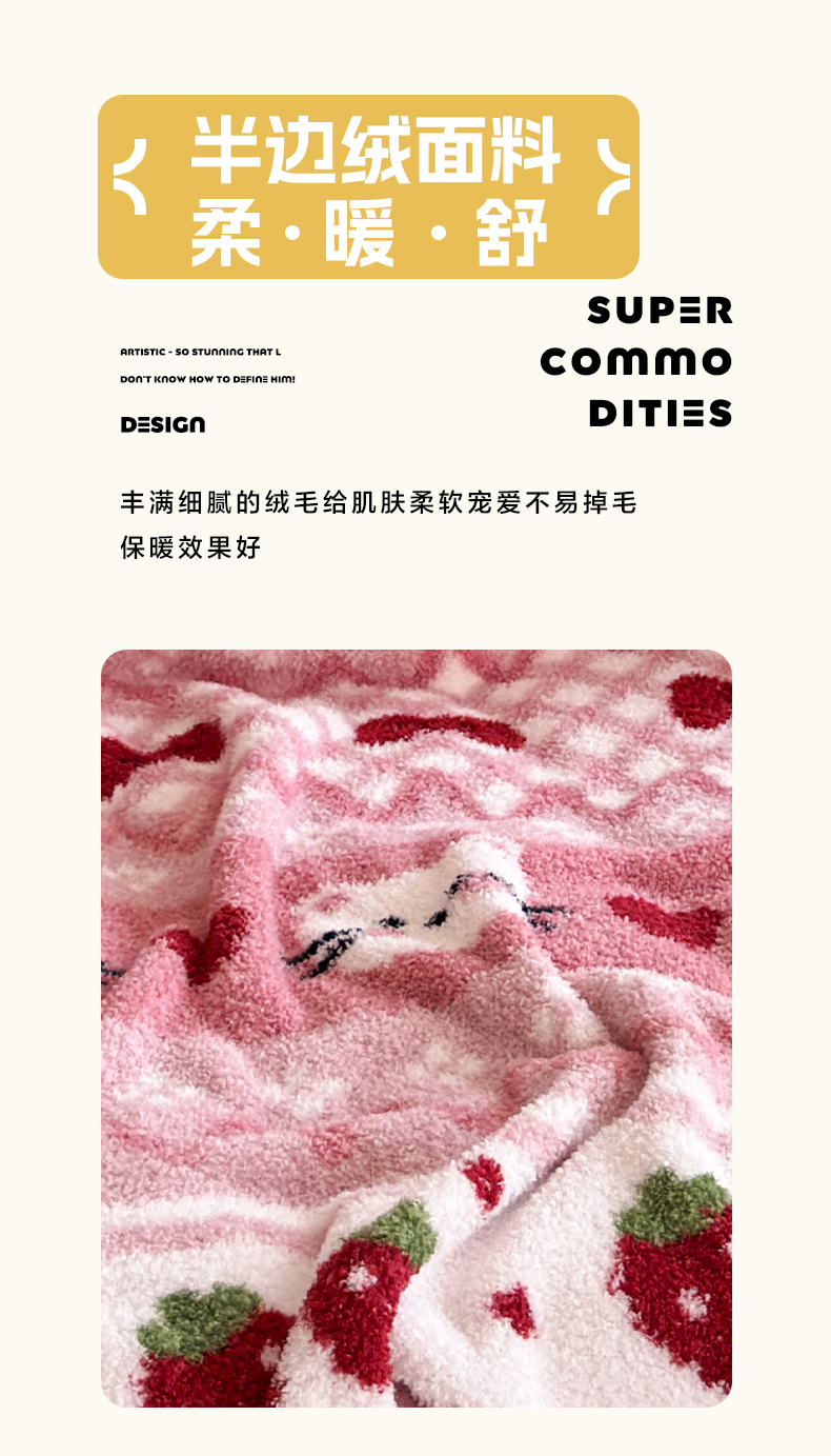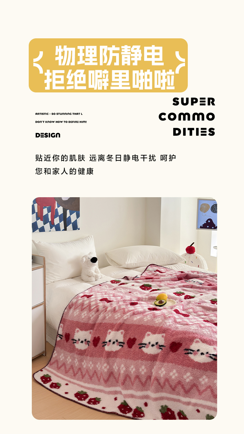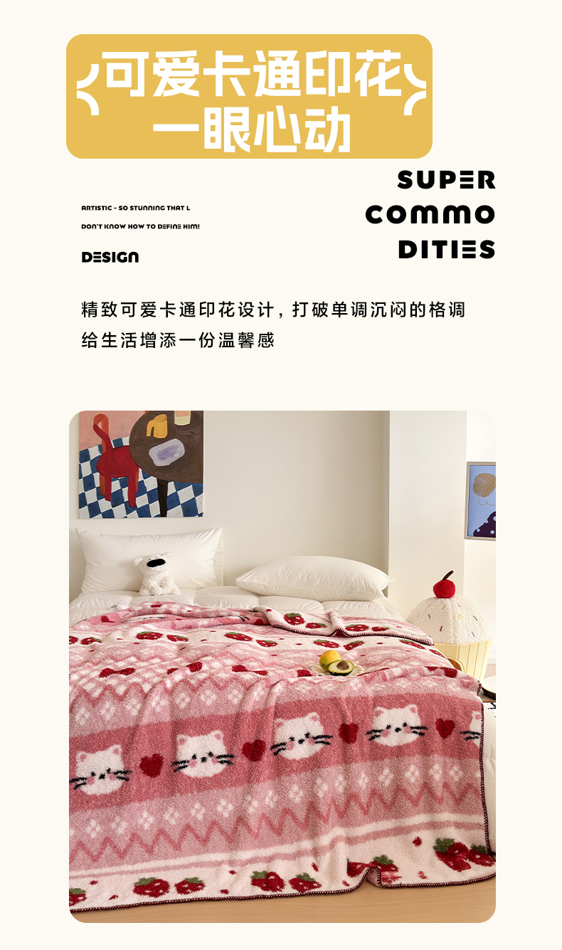 商品名称:舒隅家纺 2025新款A类卡通休闲半边绒三角针毛毯 莓果小猫-粉