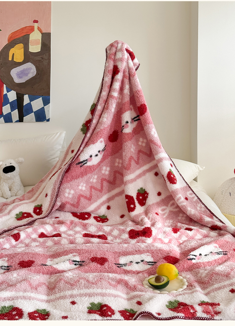 舒隅家纺 2025新款A类卡通休闲半边绒三角针毛毯 莓果小猫-粉