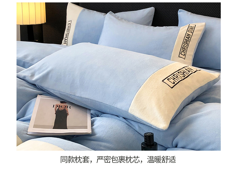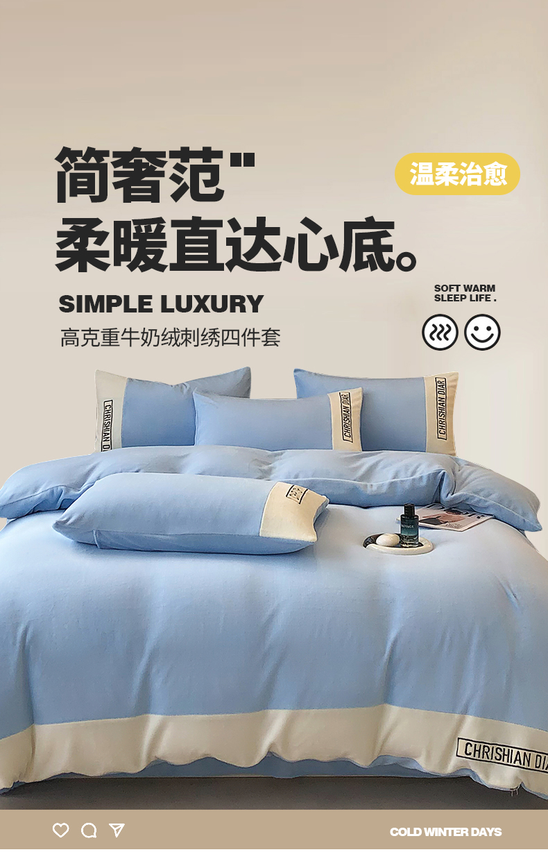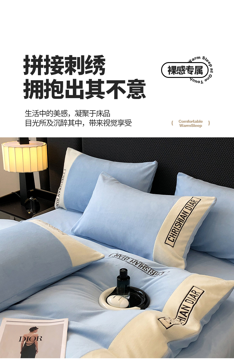商品名称:懒猫家纺 2025新款刺绣牛奶绒四件套-妮可 海蓝-白