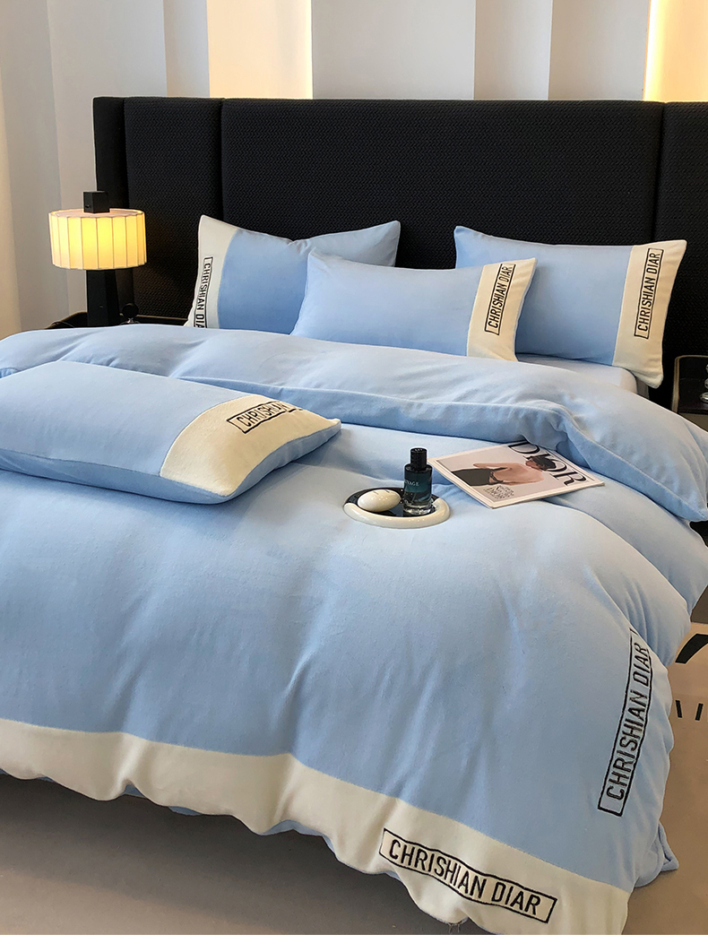懒猫家纺 2025新款刺绣牛奶绒四件套-妮可 海蓝-白
