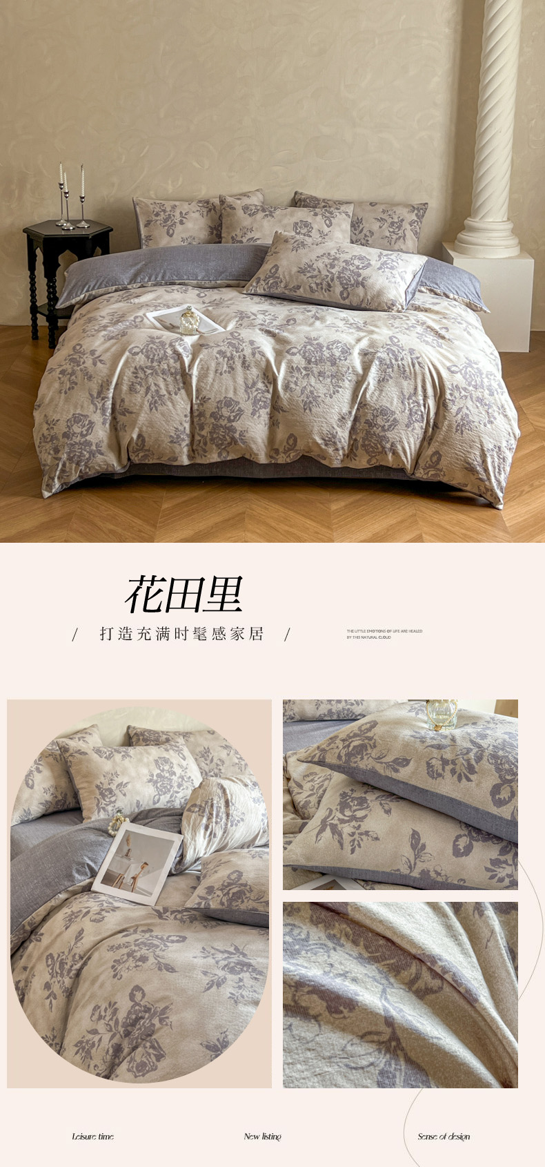 商品名称:艺玲家纺 2025新款加厚高克重原麻复古风亚麻印花四件套 木槿花