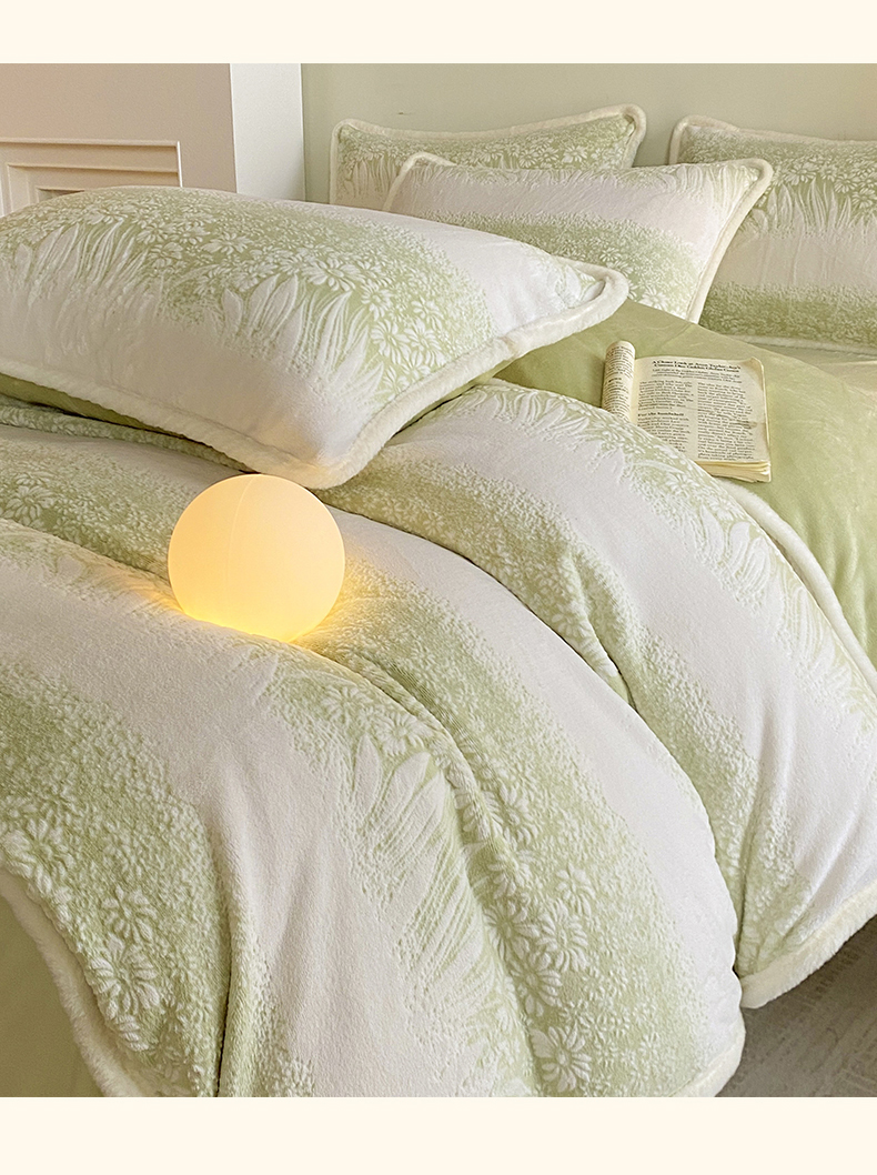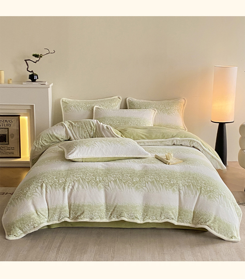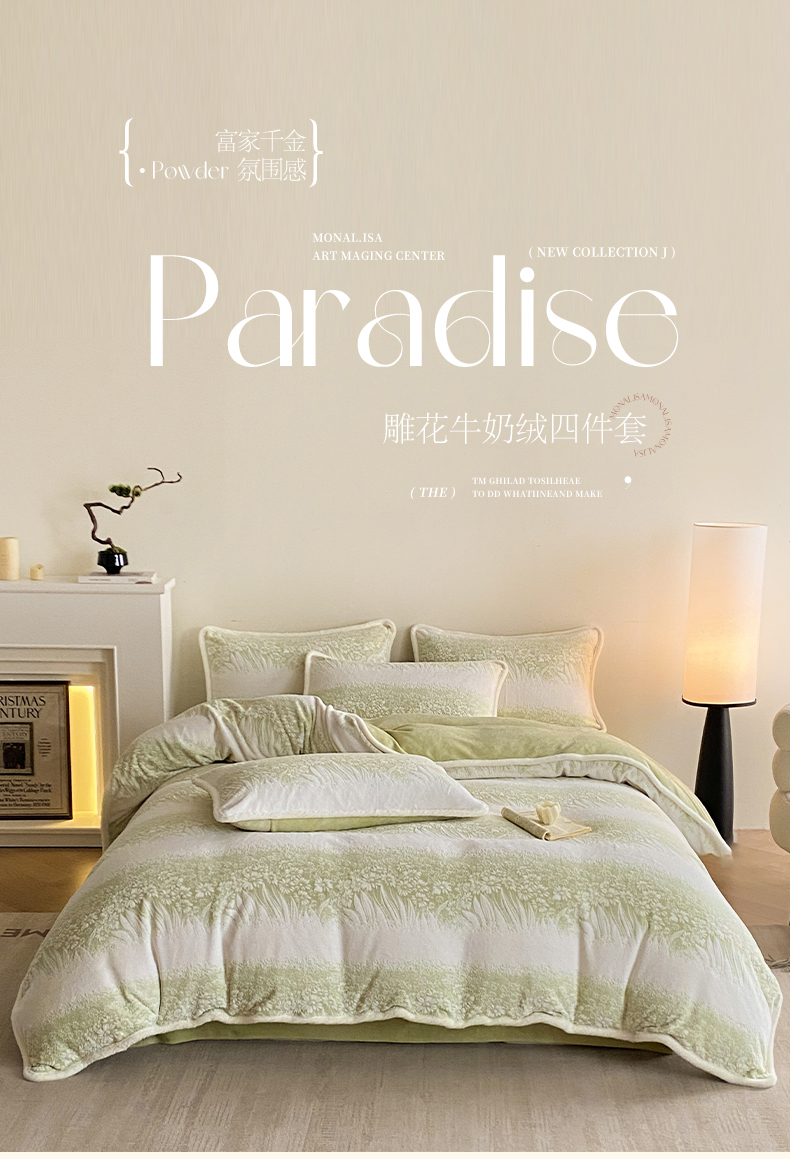 绘萱家居 2025新款爆款高密消光包边雕花牛奶绒四件套立体5D 山间花丛-绿