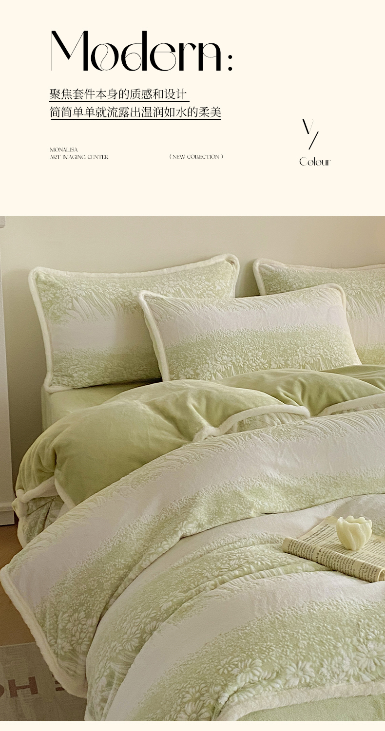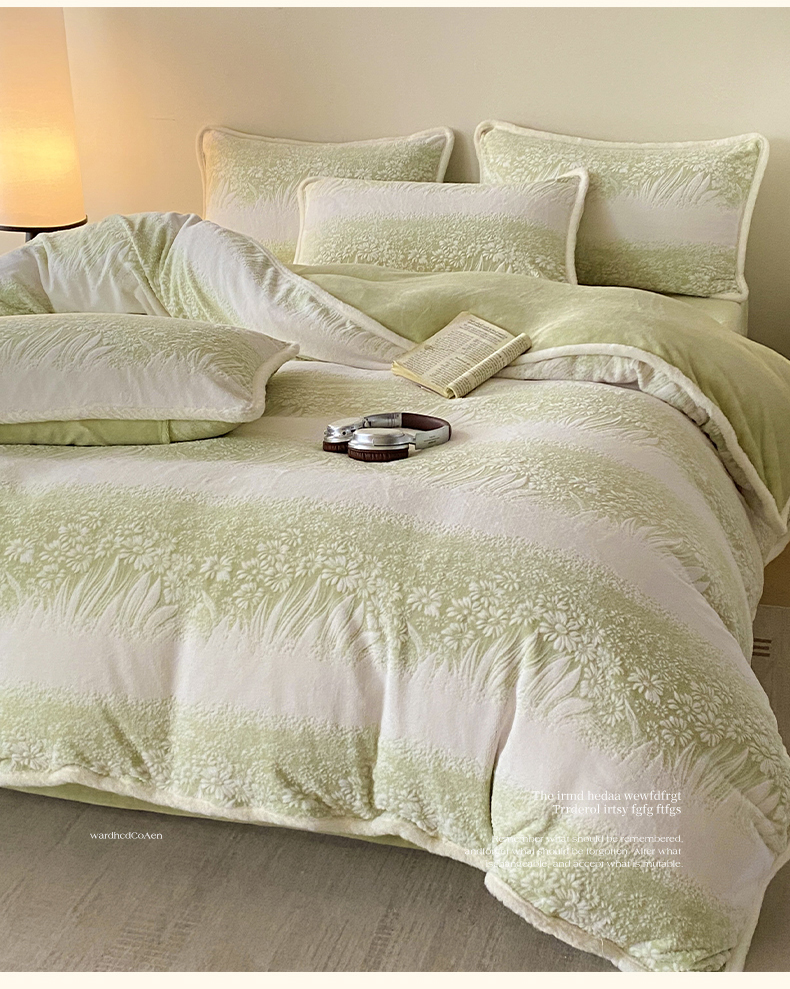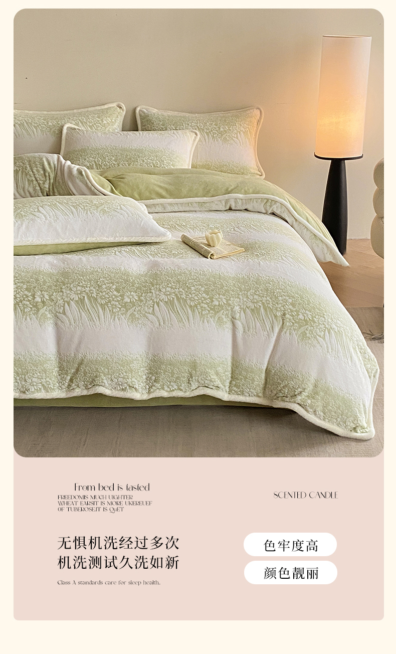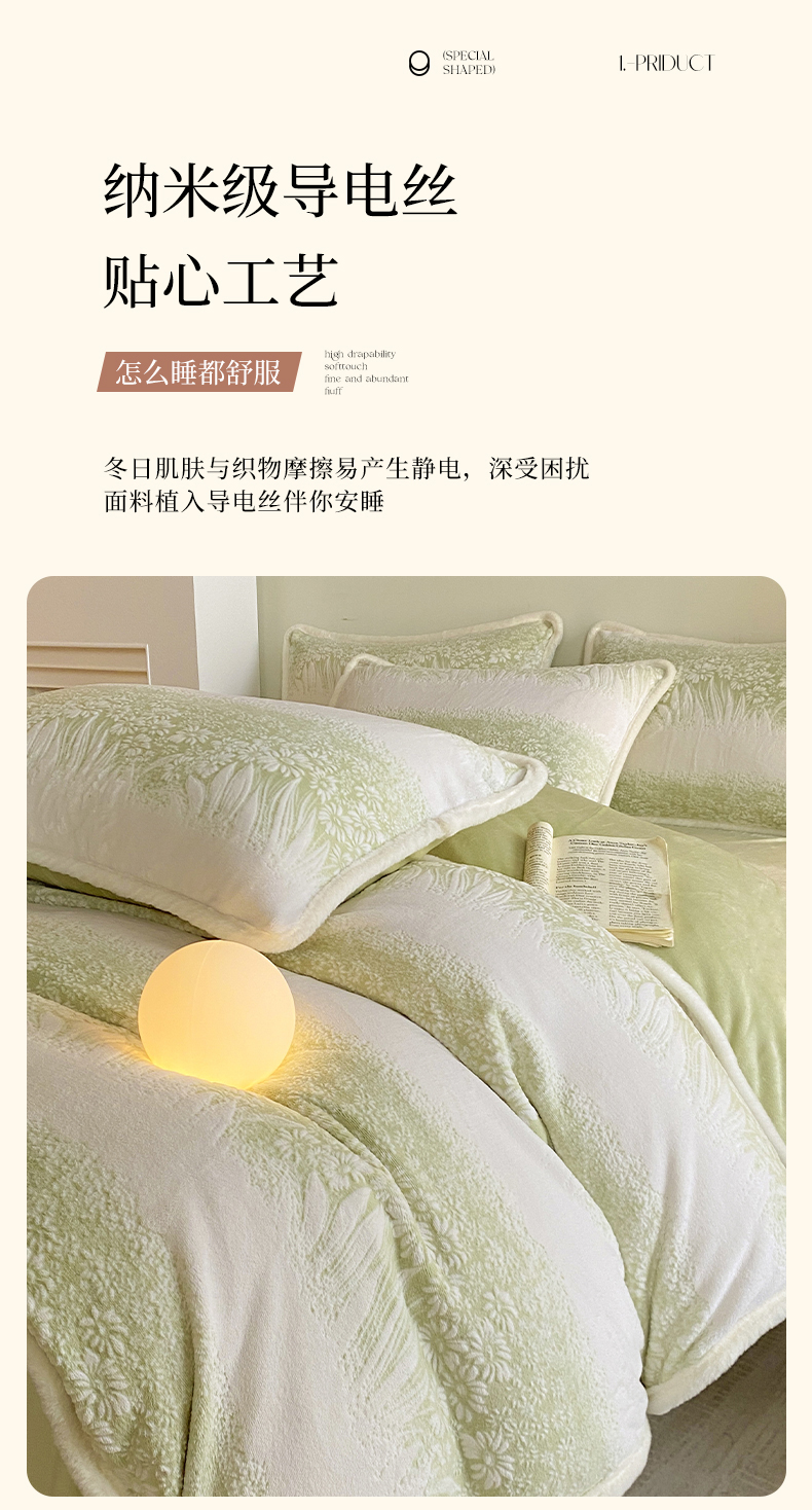 商品名称:绘萱家居 2025新款爆款高密消光包边雕花牛奶绒四件套立体5D 山间花丛-绿