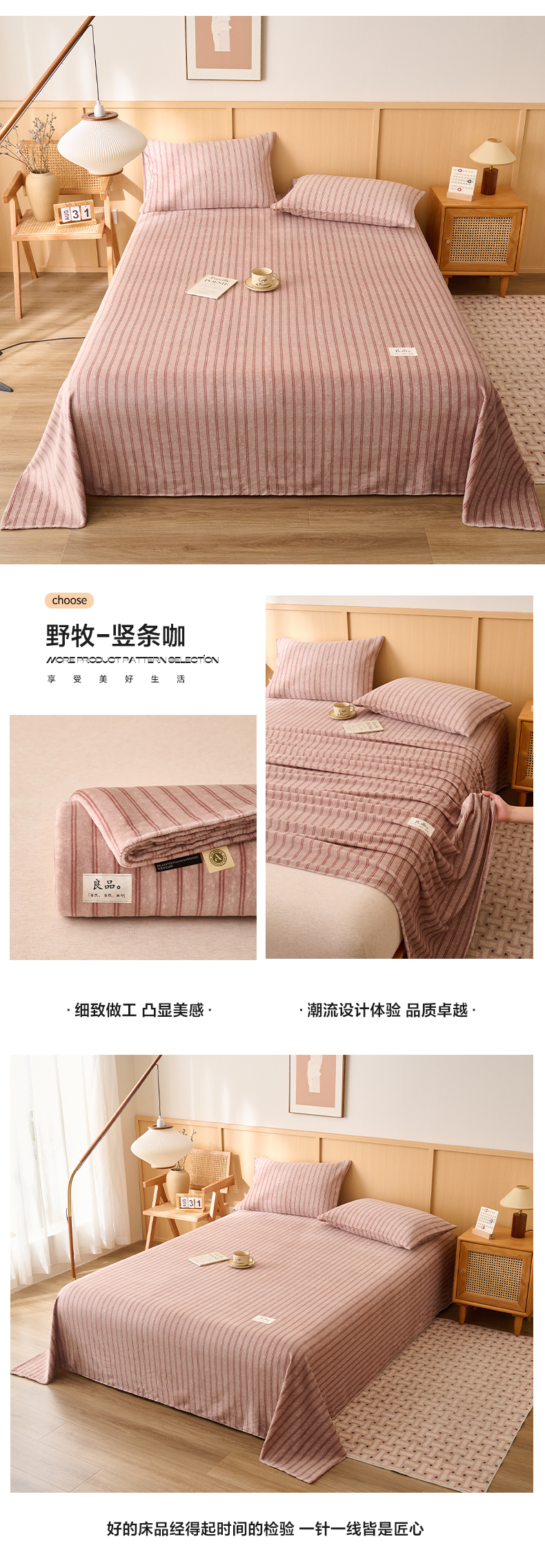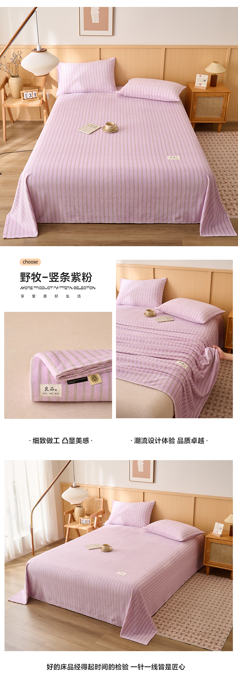 • 91家纺网 家纺一手货源 找家纺 早晨家纺 2025新款野牧款高克重牛奶绒印花单床单系列 野牧-竖条紫粉