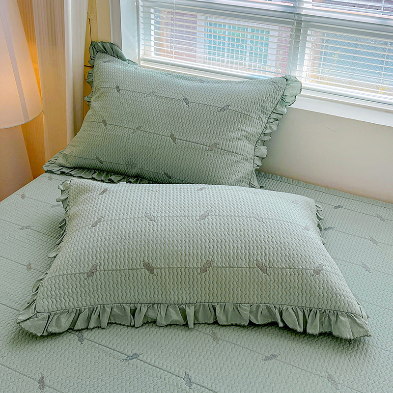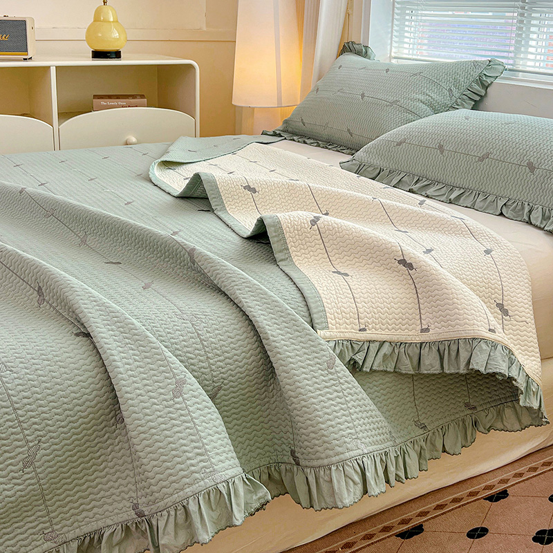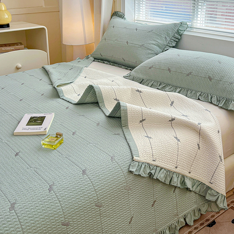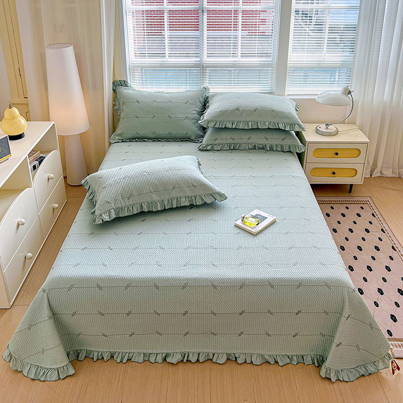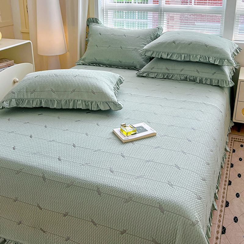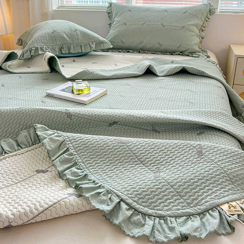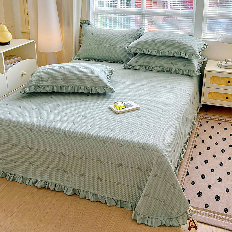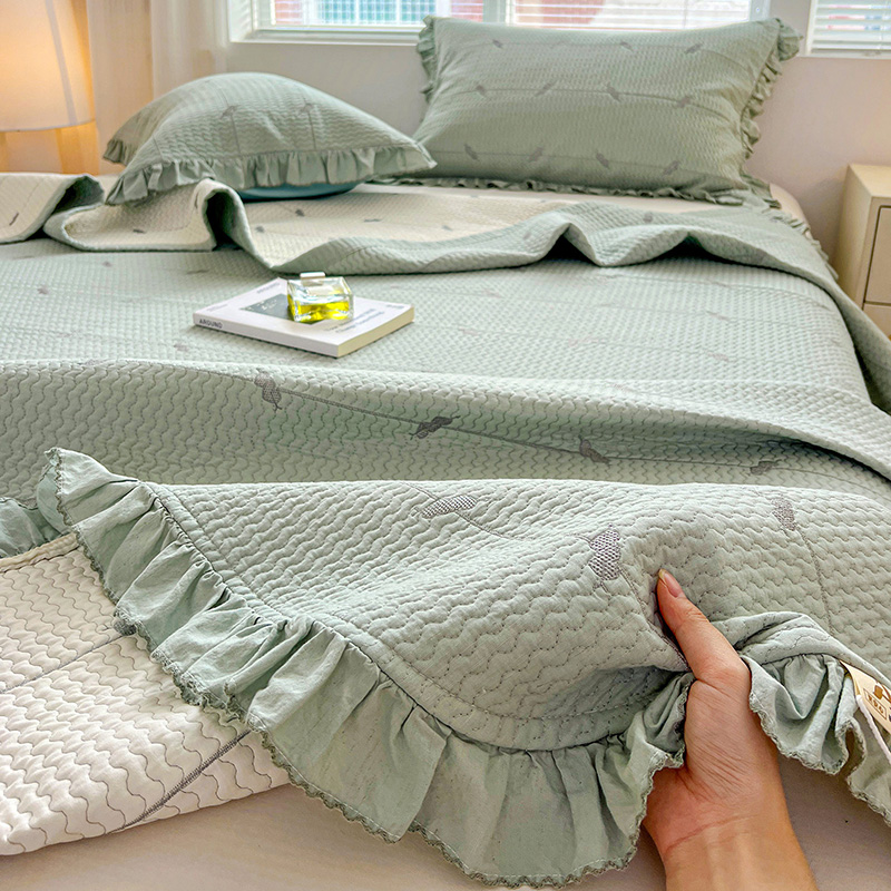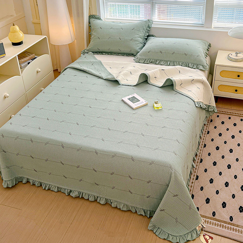 (总)源舜家纺 2025新款色织棉简约韩系花边床盖三件套,简约灰,简约粉,简约绿,简约驼,简约蓝