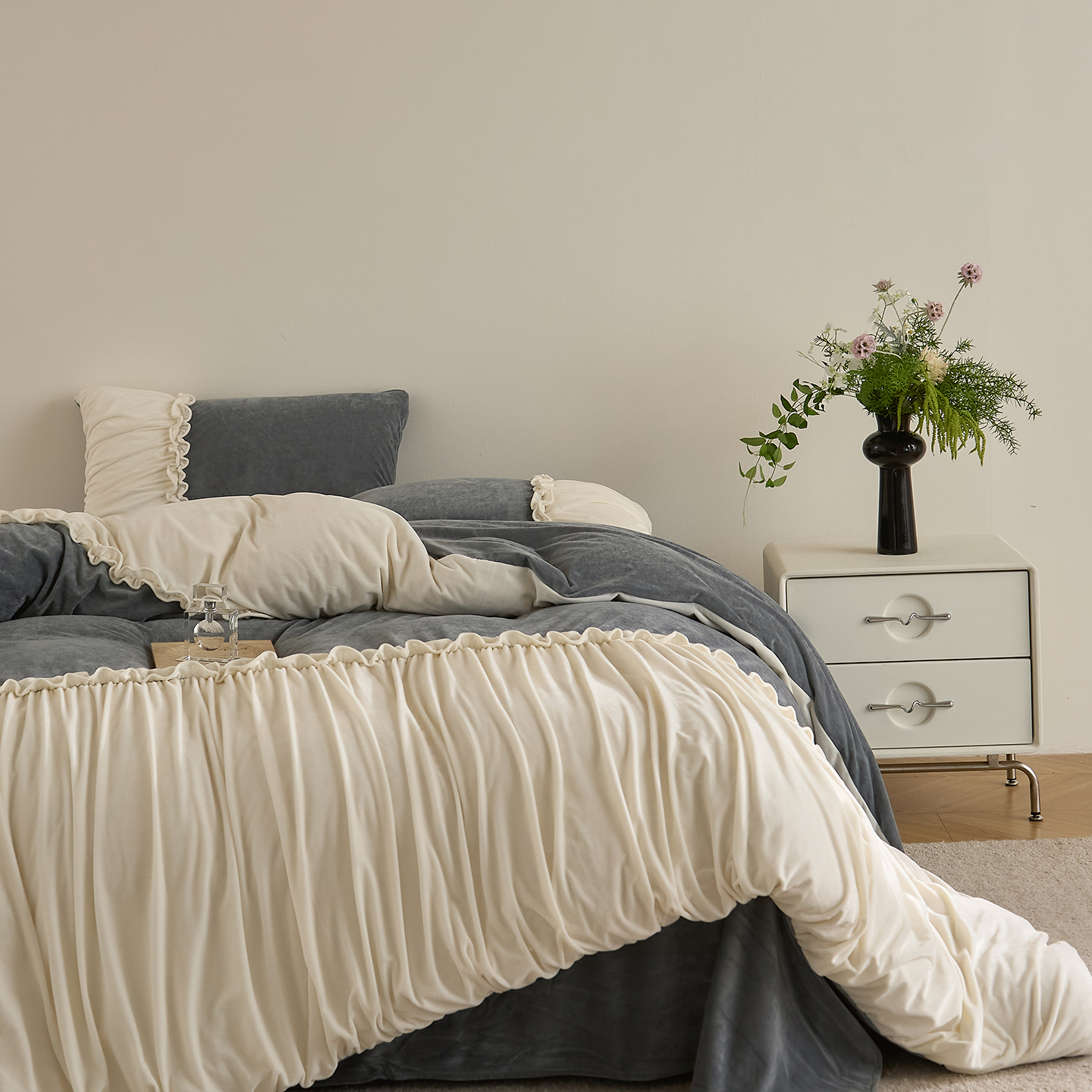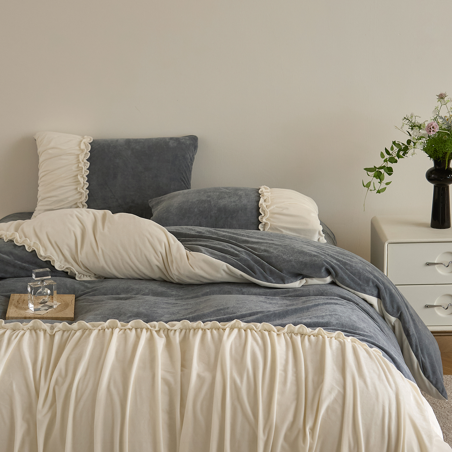 (总)ONE TWO ONE 1212025新款100S长绒棉纯棉活性印染提花四件套雪落绒花风格二【为了各位老板们都有利润空间,平台控价券后不得低于228/318/338元,感谢您的配合与支持!】,雪落绒花-灰,雪落绒花-烟紫
