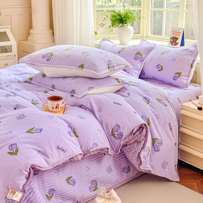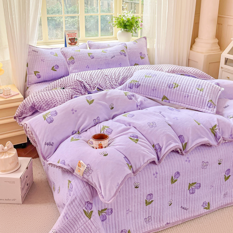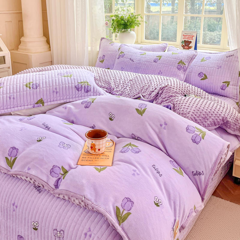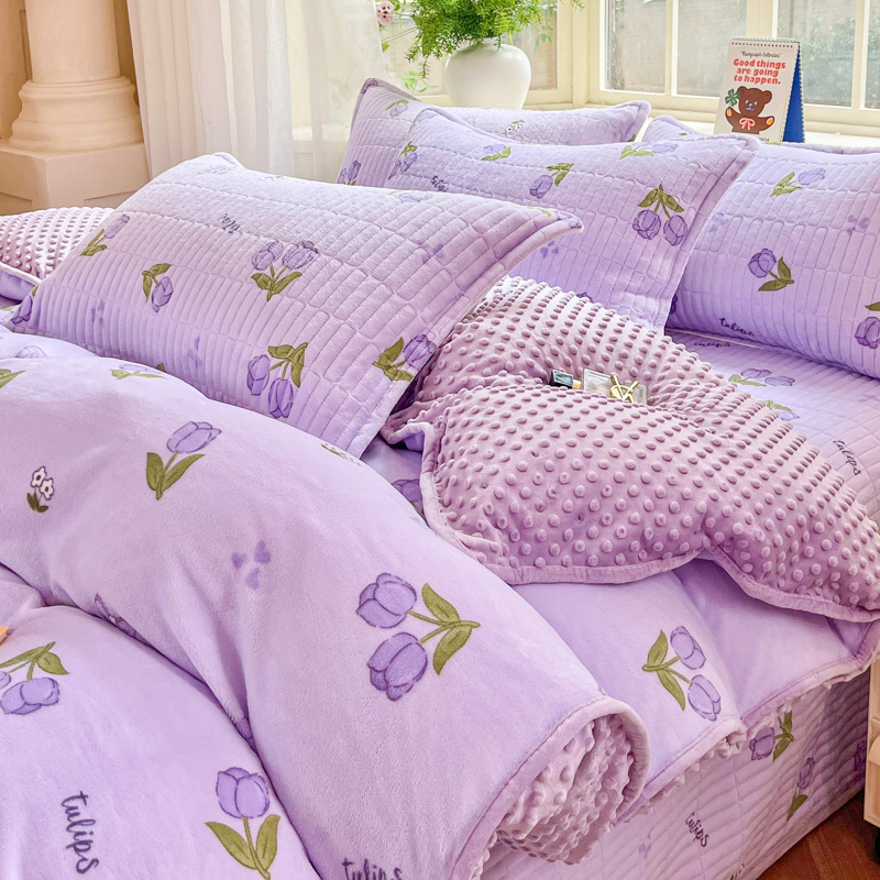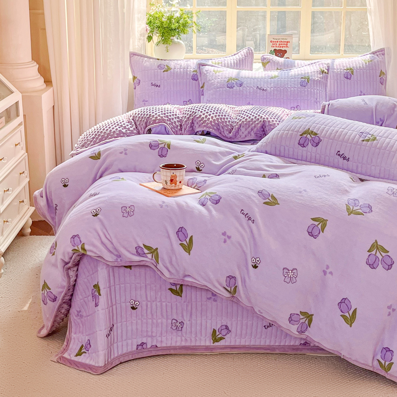 尚美家纺 2025冬季新品豆豆绒高克重床盖被套四件套 紫色郁金香