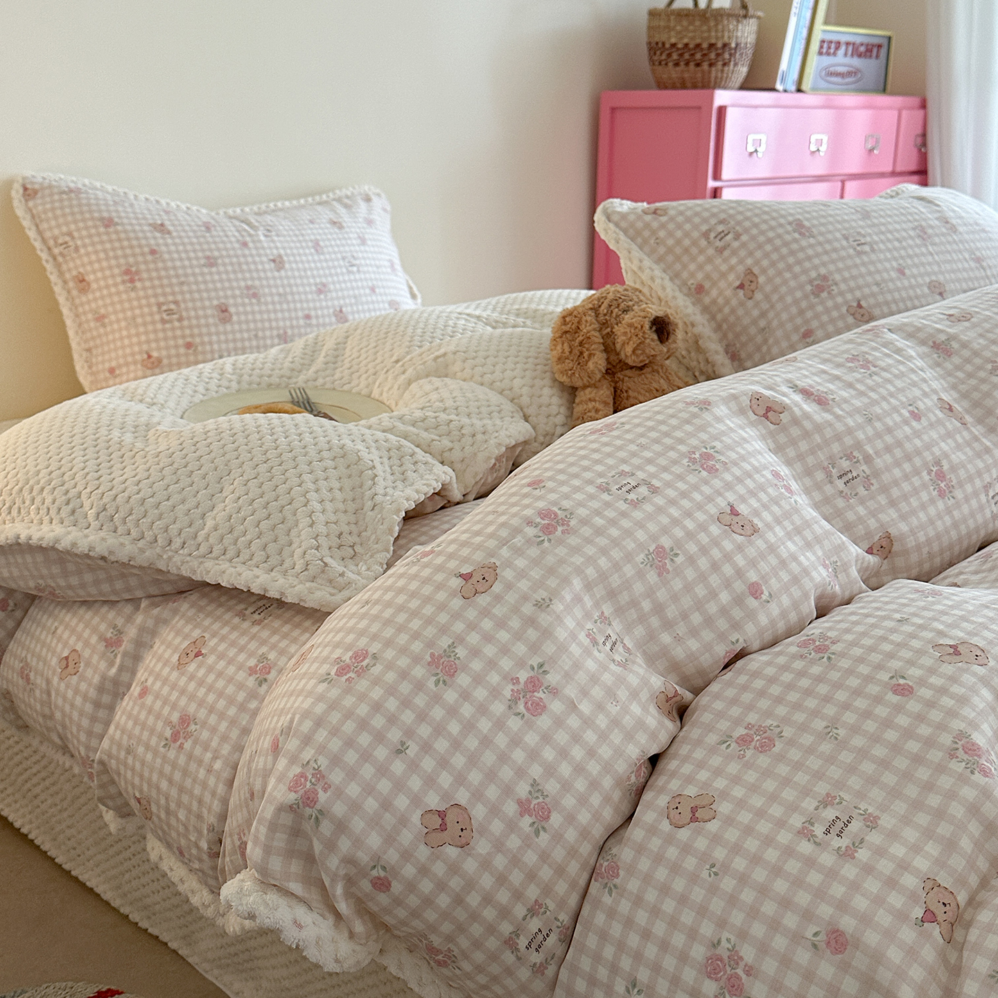 商品名称:柚子YOUTH 2025新款全棉双层纱华夫格提花暖绒四件套 玫瑰兔兔