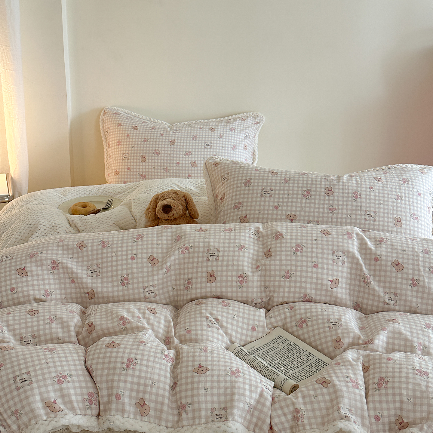 柚子YOUTH 2025新款全棉双层纱华夫格提花暖绒四件套 玫瑰兔兔