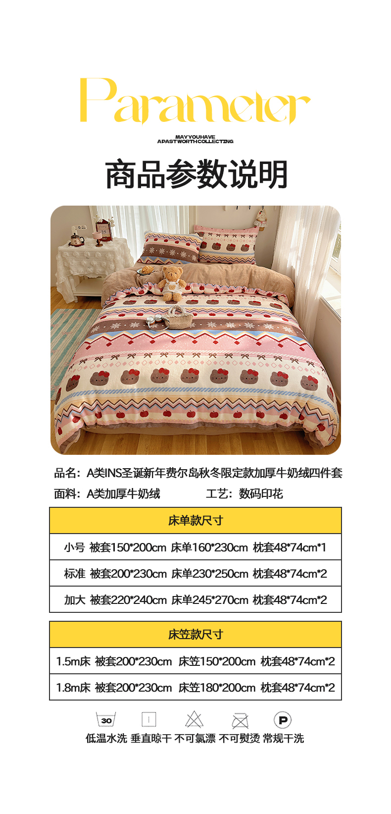 商品名称:(总)桃子家居 2025新款A类ins圣诞新年费尔岛秋冬限定款加厚牛奶绒系列四件套