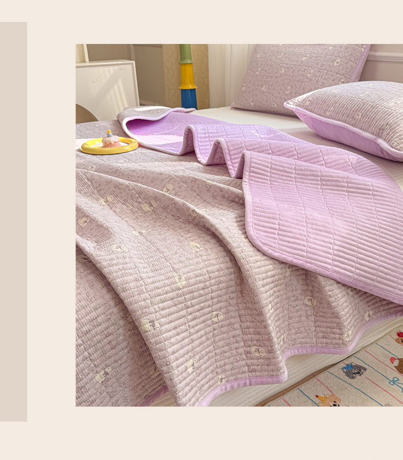 简宜家居(朝初家纺) 2025新款A面100%全棉B面宝宝绒棉绒包边床盖正反两用 紫绒花兔
