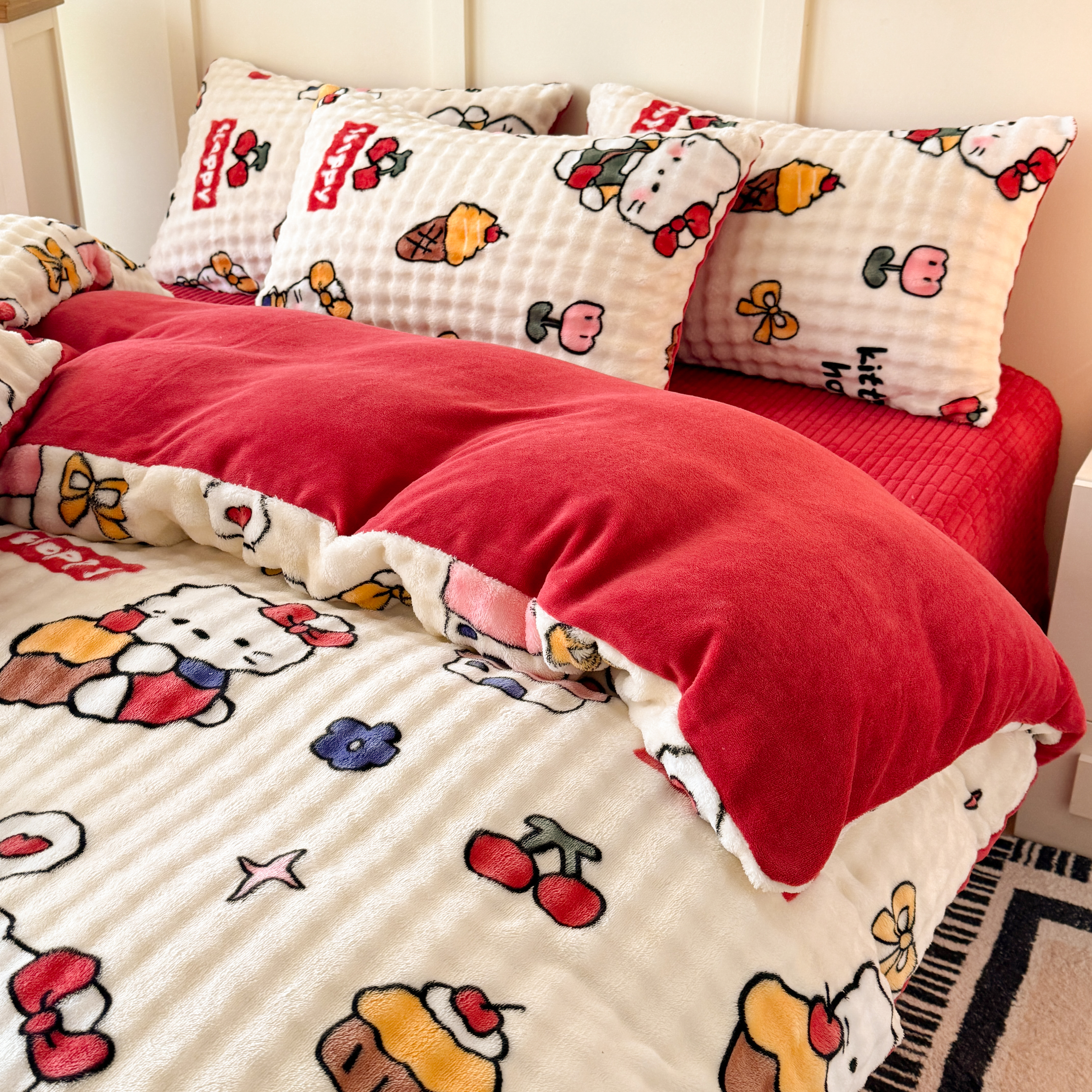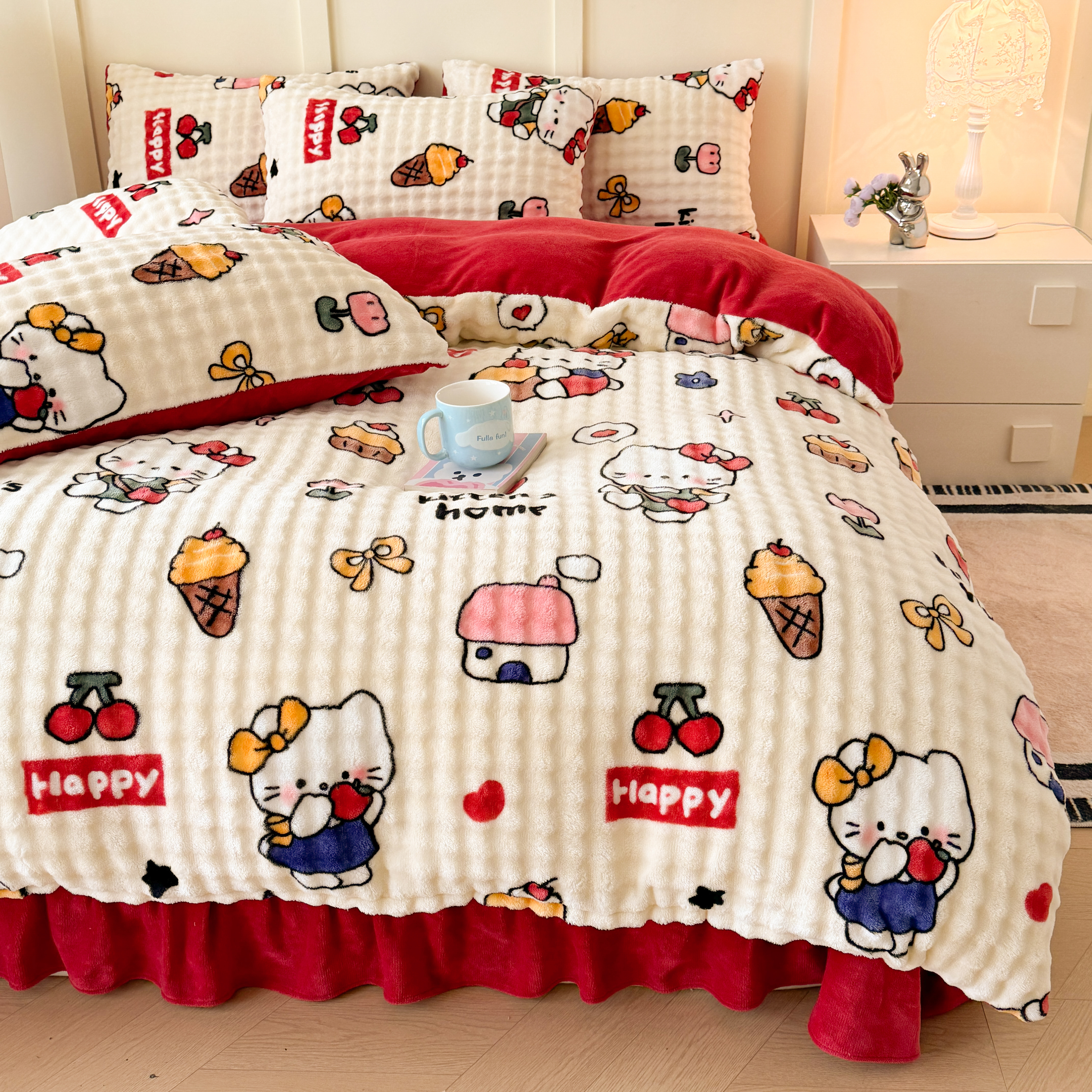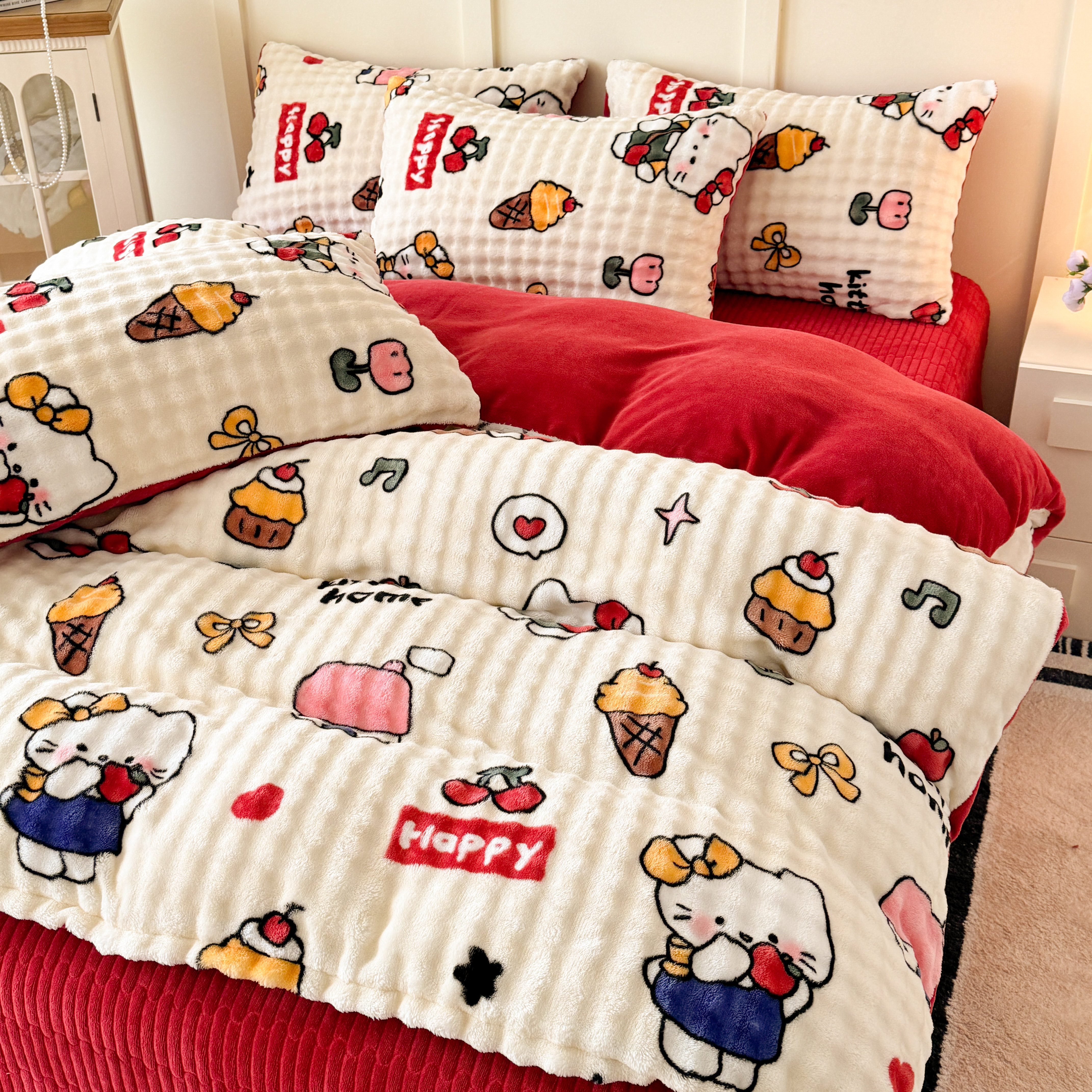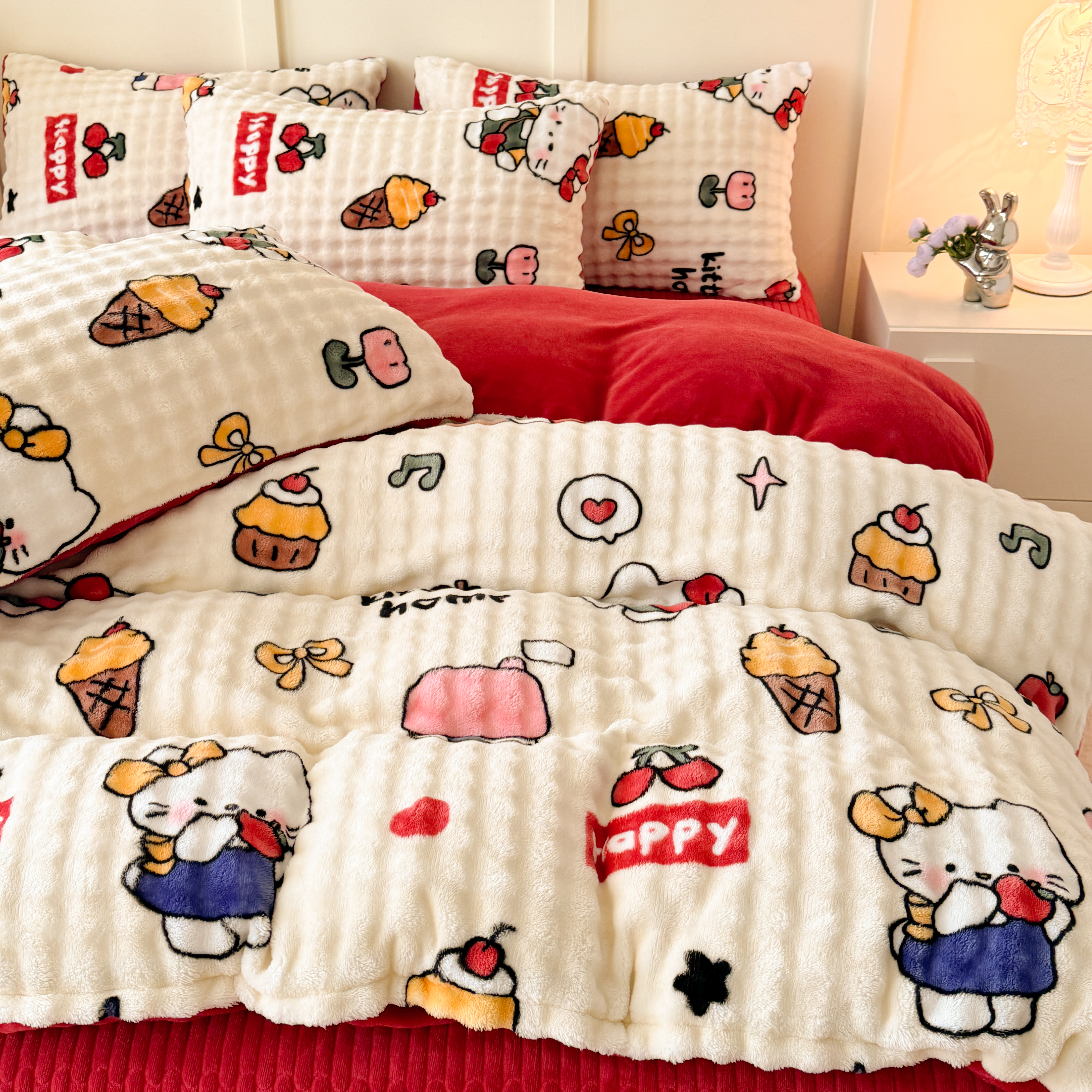 (总)梦纤绒 2025新款兔毛绒四件套,斑马格,彩虹爱心,简约方格红,简约方格蓝,浅调爱纹,时尚简约,桃心,条纹小熊咖,幸福花园,熊猫啃竹叶