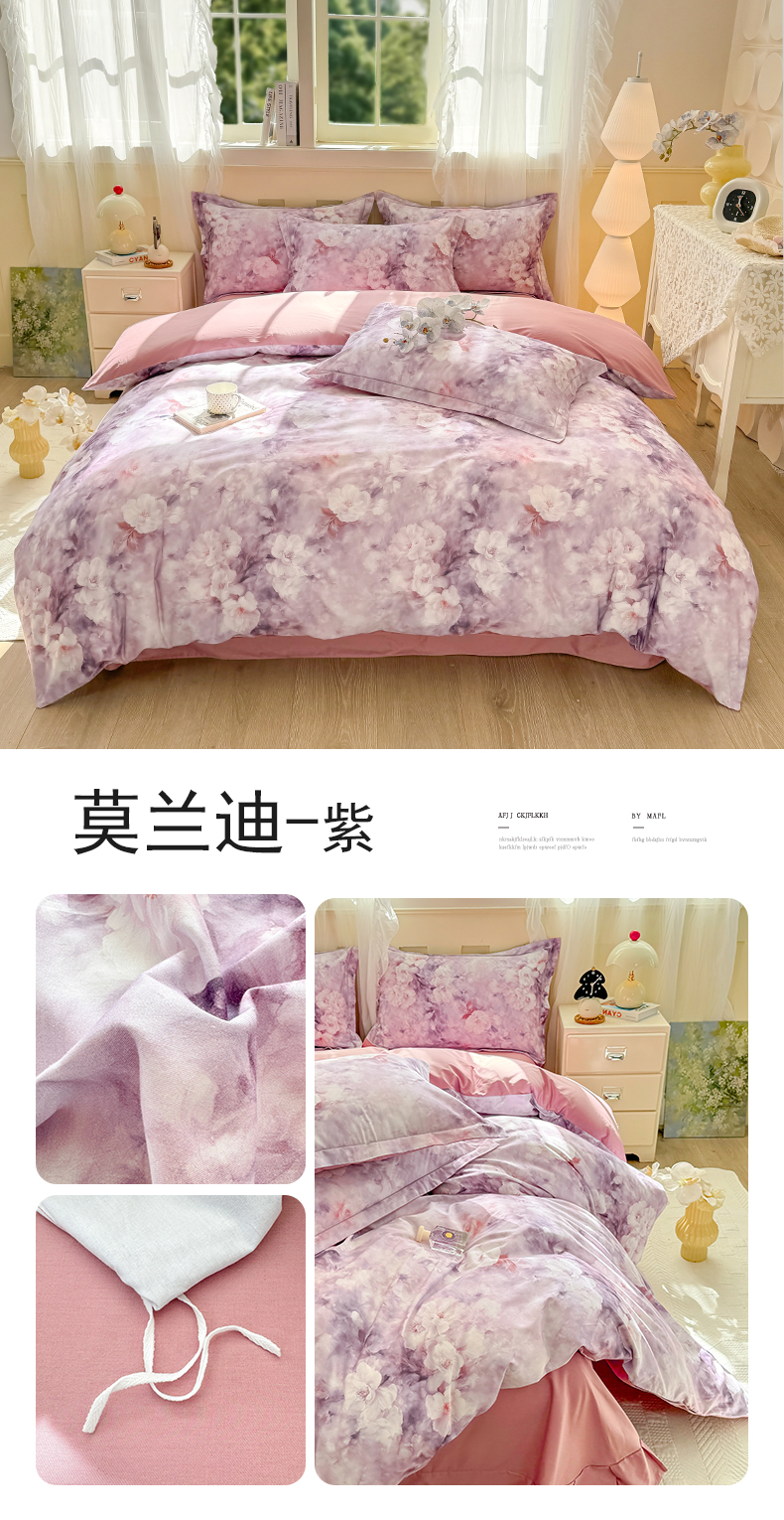 红日子纺织品 2025新款全棉纯棉数码印花四件套 莫妮花园-粉