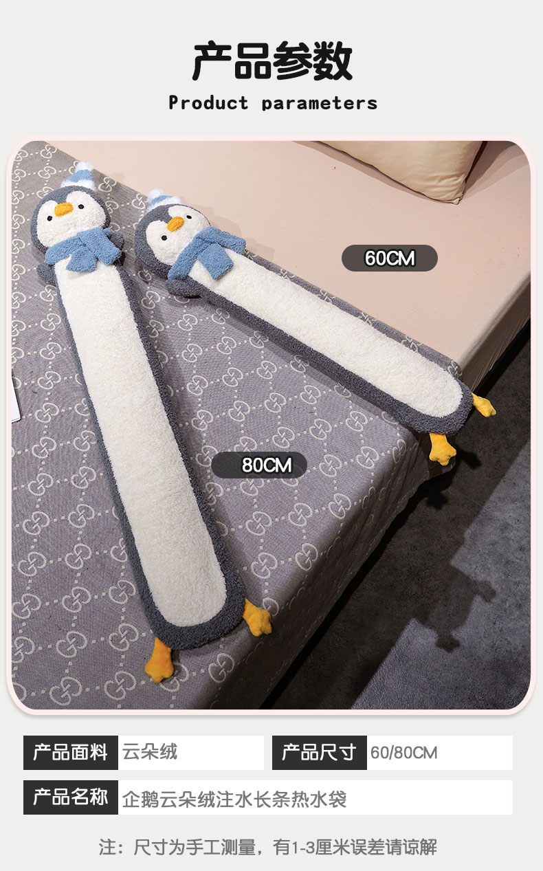 商品名称:仟亿莱 2025新款108企鹅云朵绒注水长条热水袋抱枕 灰色企鹅