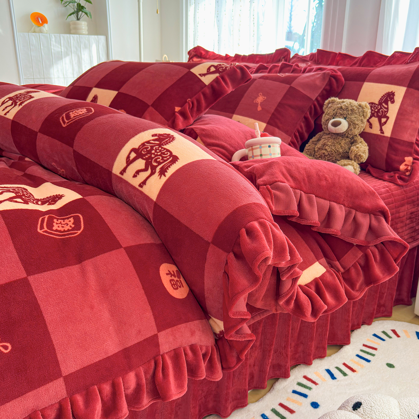 当前位置: 91家纺网 > 商品网购 > 床品套件 > 四件套 > 牛奶绒四件套 > 铠畅家纺 2026新款花边款牛奶绒床盖四件套床褥 炕垫四件套 花边款-经典小马