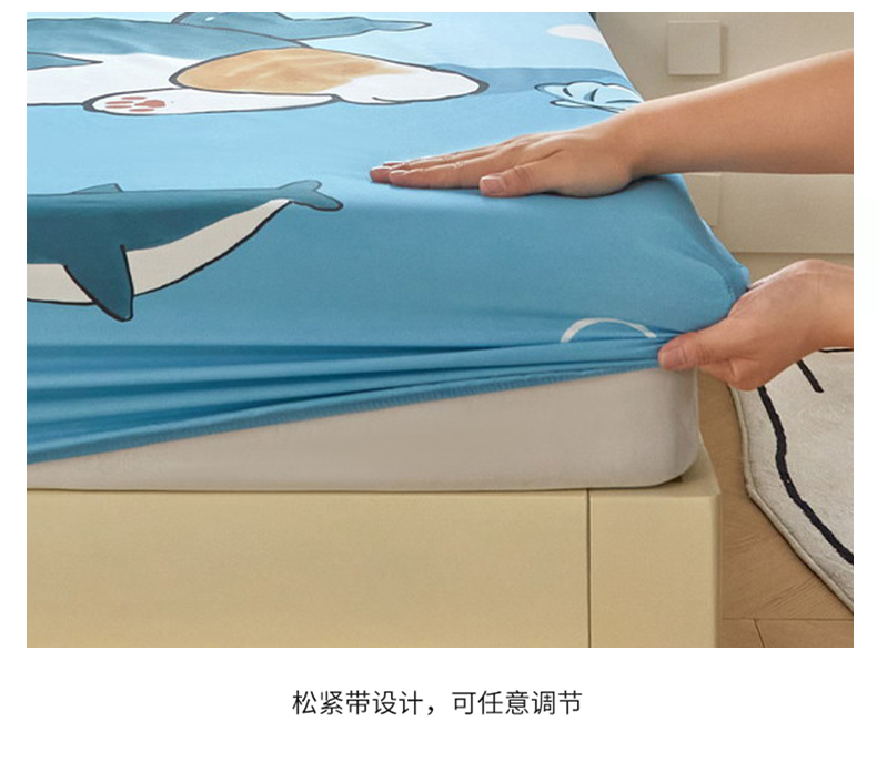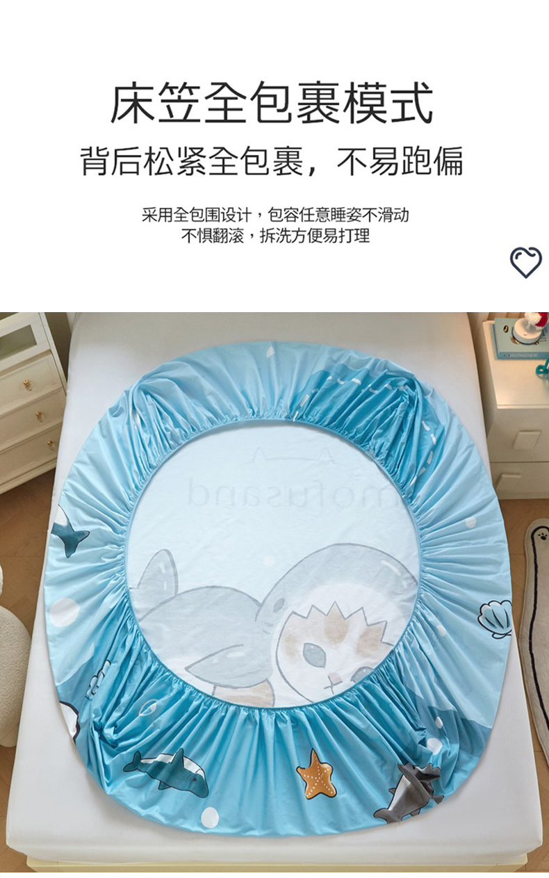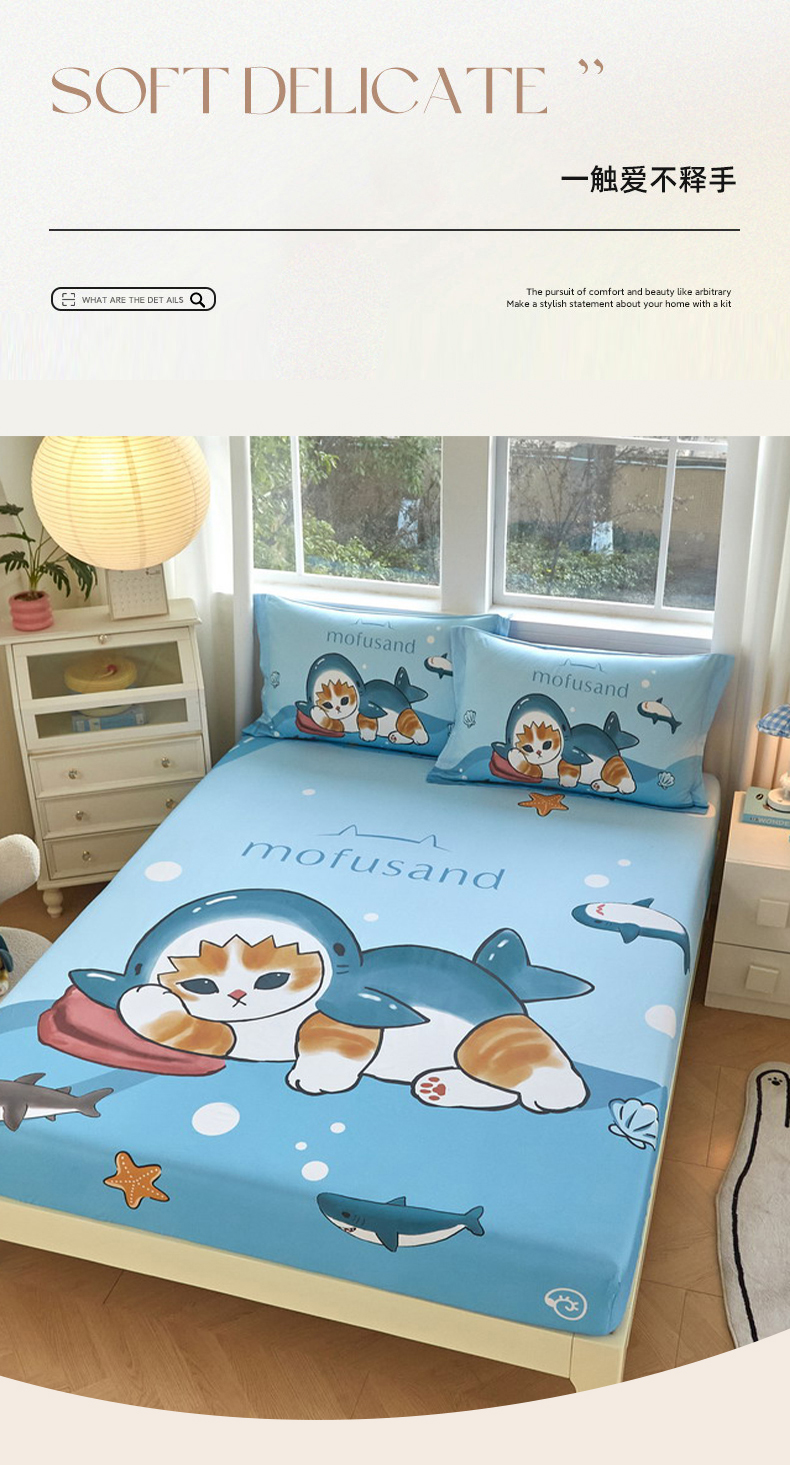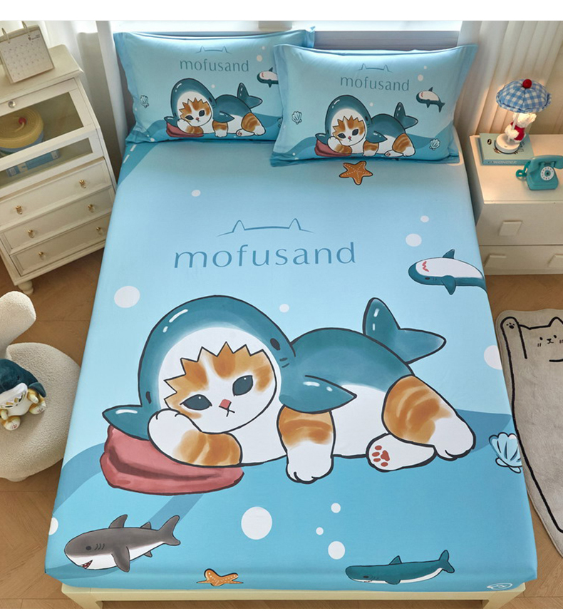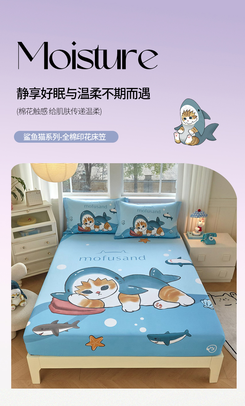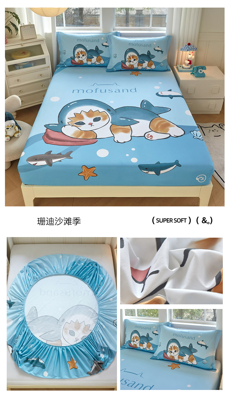 蘭菲家纺 2026新款全棉大版鲨鱼猫套件-猫福系列单床笠 珊迪沙滩季