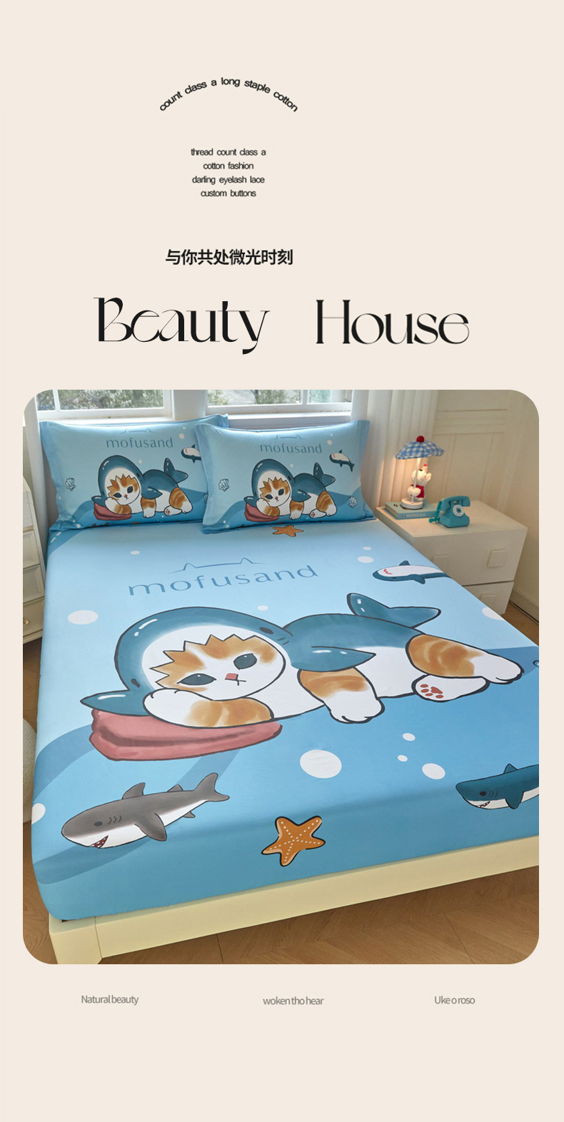 商品名称:蘭菲家纺 2026新款全棉大版鲨鱼猫套件-猫福系列单床笠 珊迪沙滩季