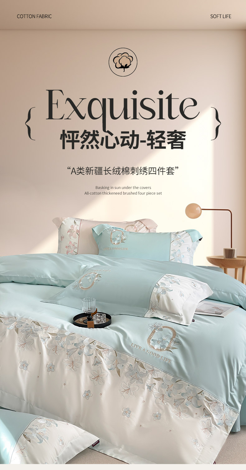 2026新款特供款A类长绒棉纯棉四件套100全棉少女心刺绣被套床单床笠床上用品 花若梦-清绿