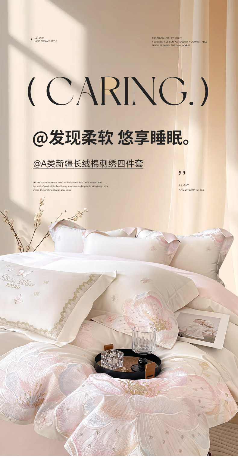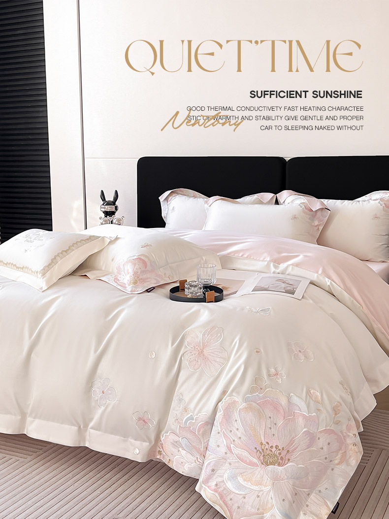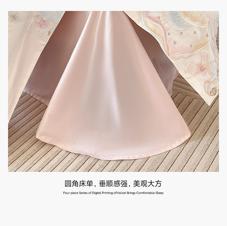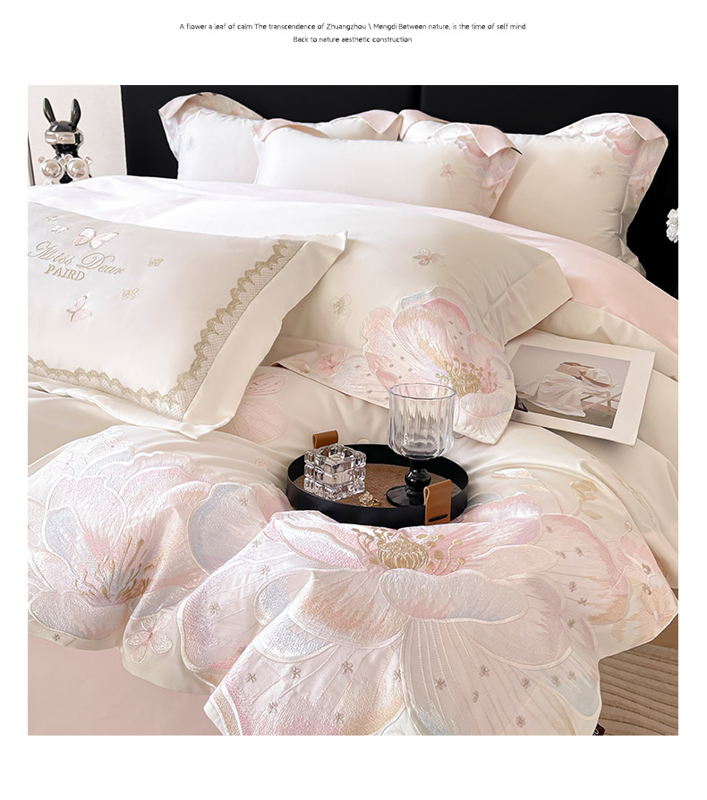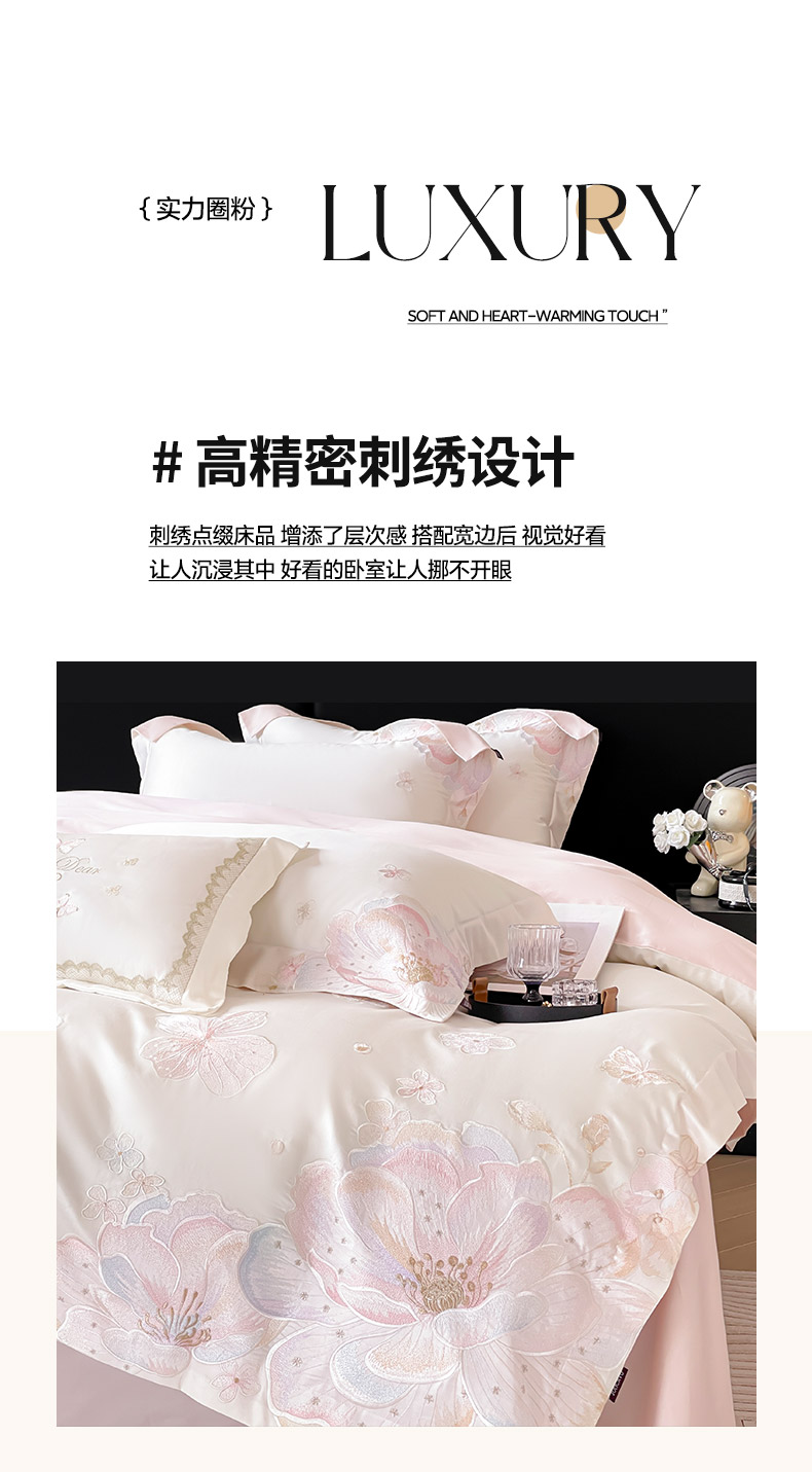 2026马年特惠新品A类长绒棉纯棉四件套100全棉重工刺绣被套床单床笠轻奢高级感床上用品-花之语 花之语-白粉