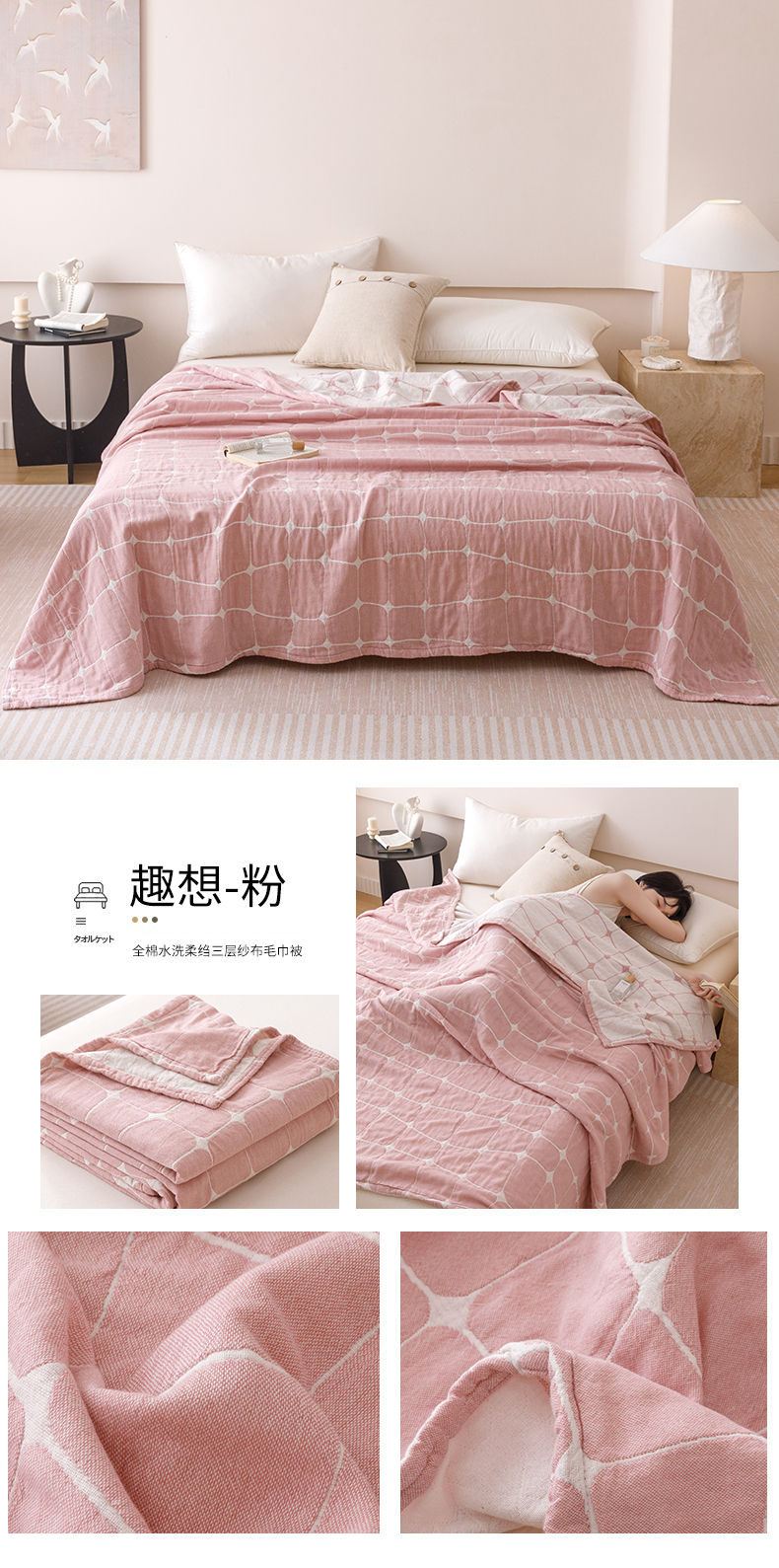 2026新款全棉纯棉水洗柔绉三层纱布毛巾被 夏梦-驼