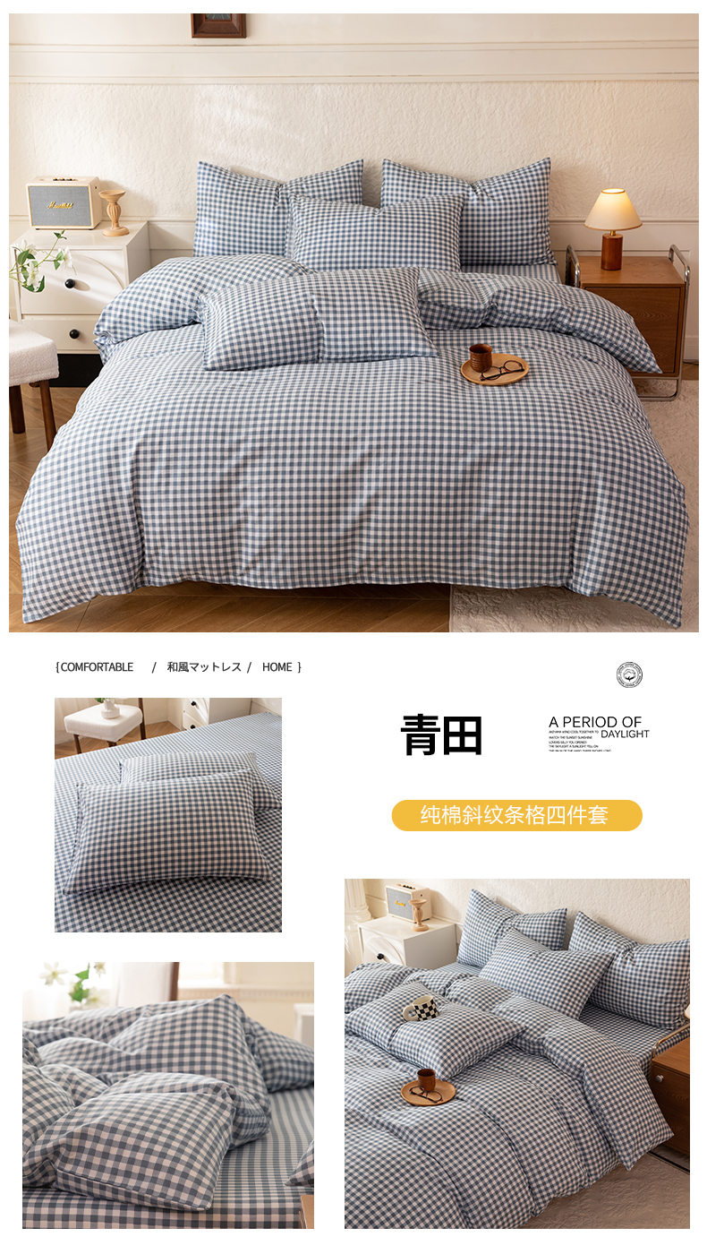 当前位置: 91家纺网 > 商品网购 > 床品套件 > 四件套 > 全棉普通四件套 > 八十八家纺 2026新款无印风全棉纯棉斜纹条格四件套 青曼